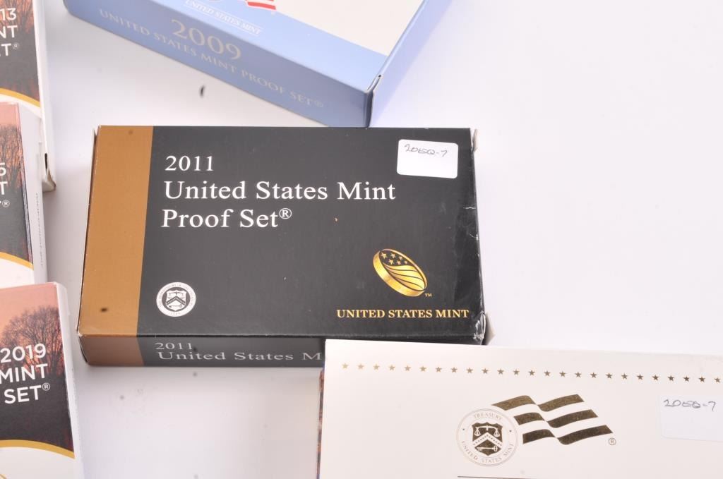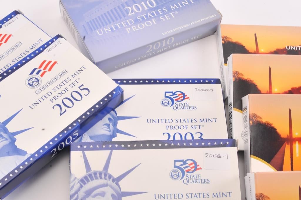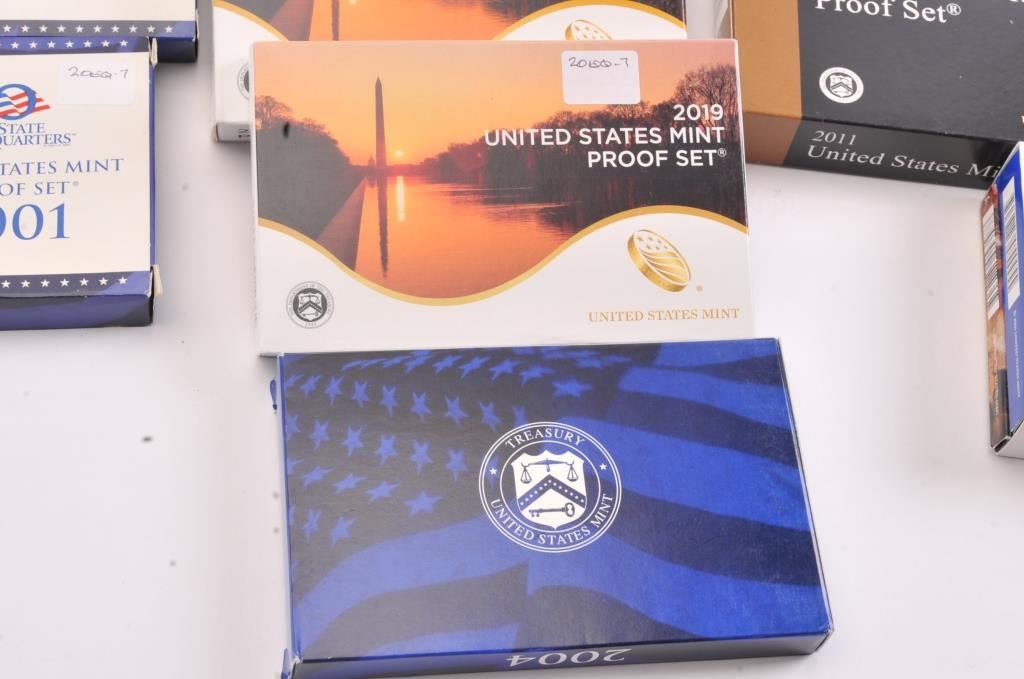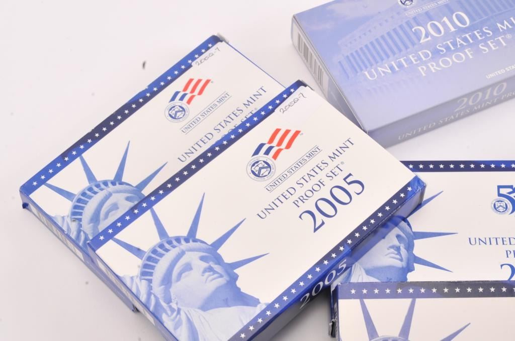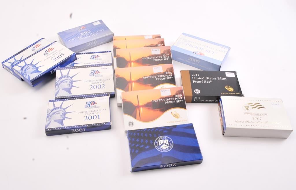 Lot of U.S. Mint Proof coin sets from 1995 to 2007, 2009, 2010, 2011, 2013, 2015, 2017, 2018 and 2019. The lot includes twenty two sets in total. All the coins are new and uncirculated in the original packaging.Est.: $200-$400.