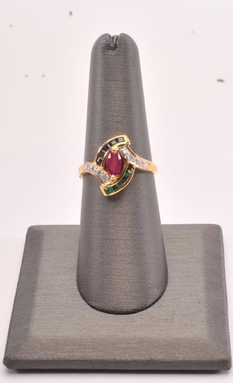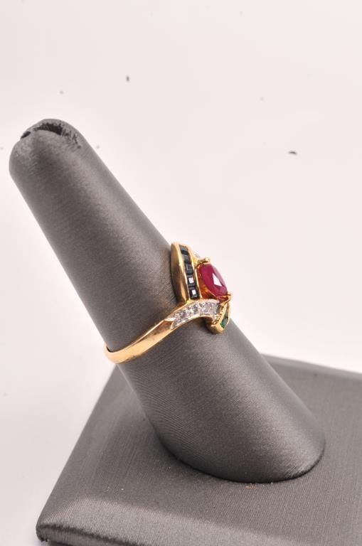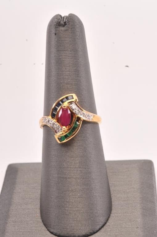 Ruby, Emerald, Sapphire and Diamond ring set with 18k yellow gold. Marquise cut Ruby and approx. .5 carats. Est:$500-1000