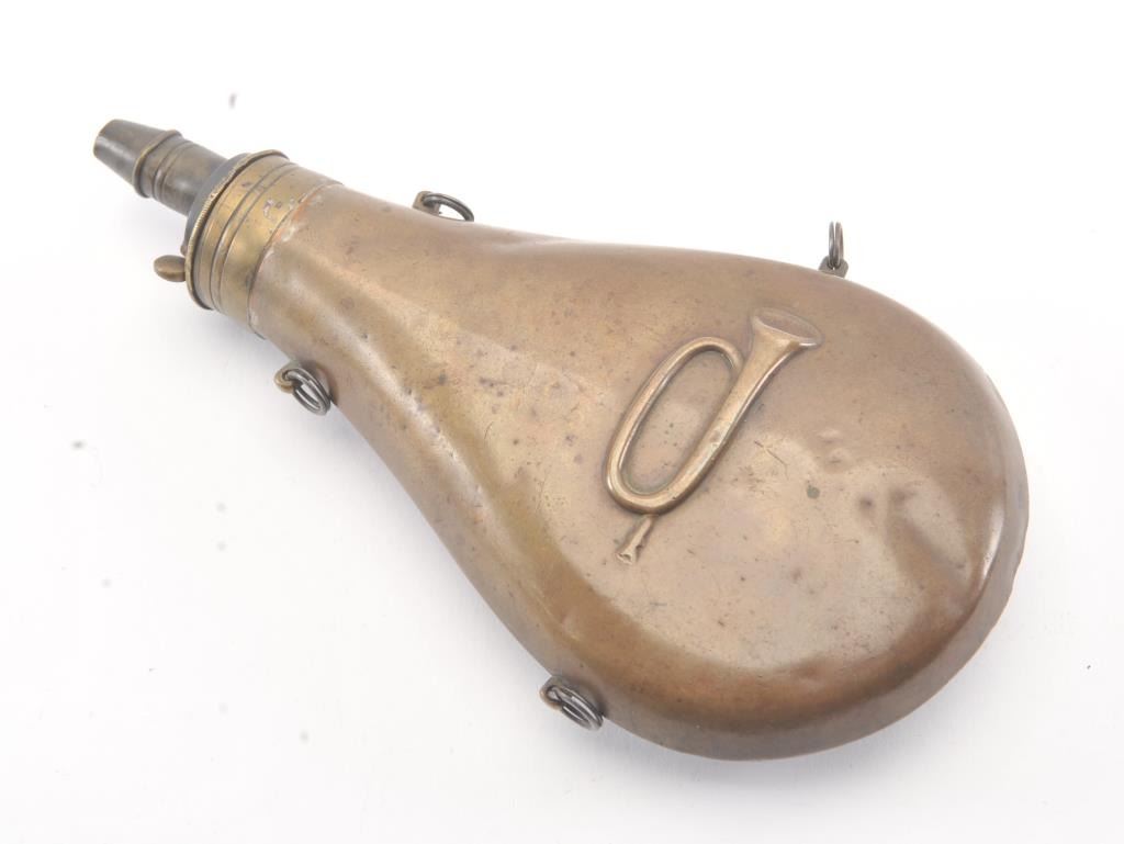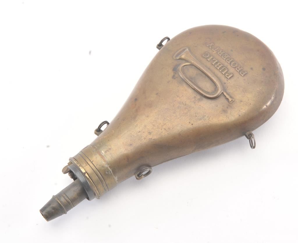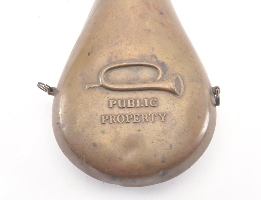 U.S. Issue Powder Flask marked “Public Property” with embossed bugle on both sides. Good to very good condition with small dings and normal wear. 1st official U.S. government flask circa 1830s. Est.: $600-$1200