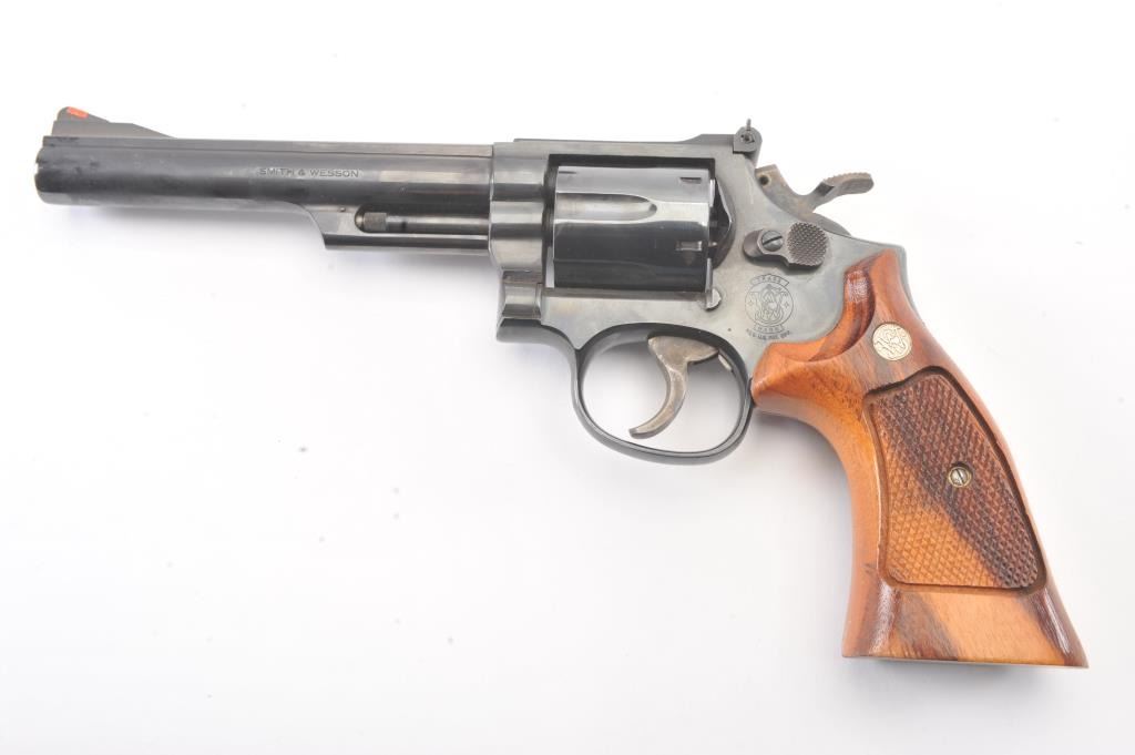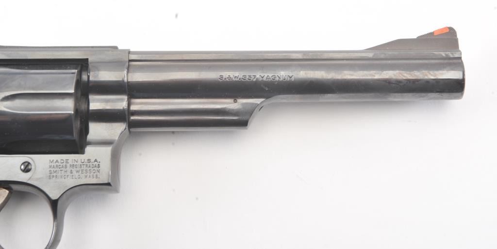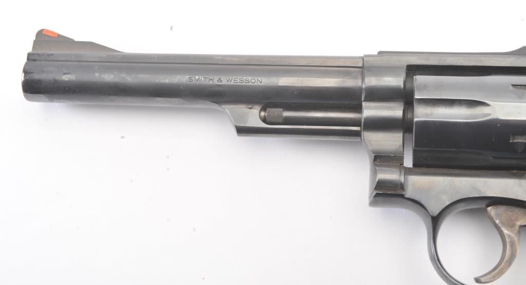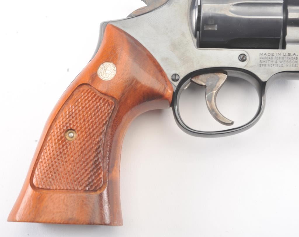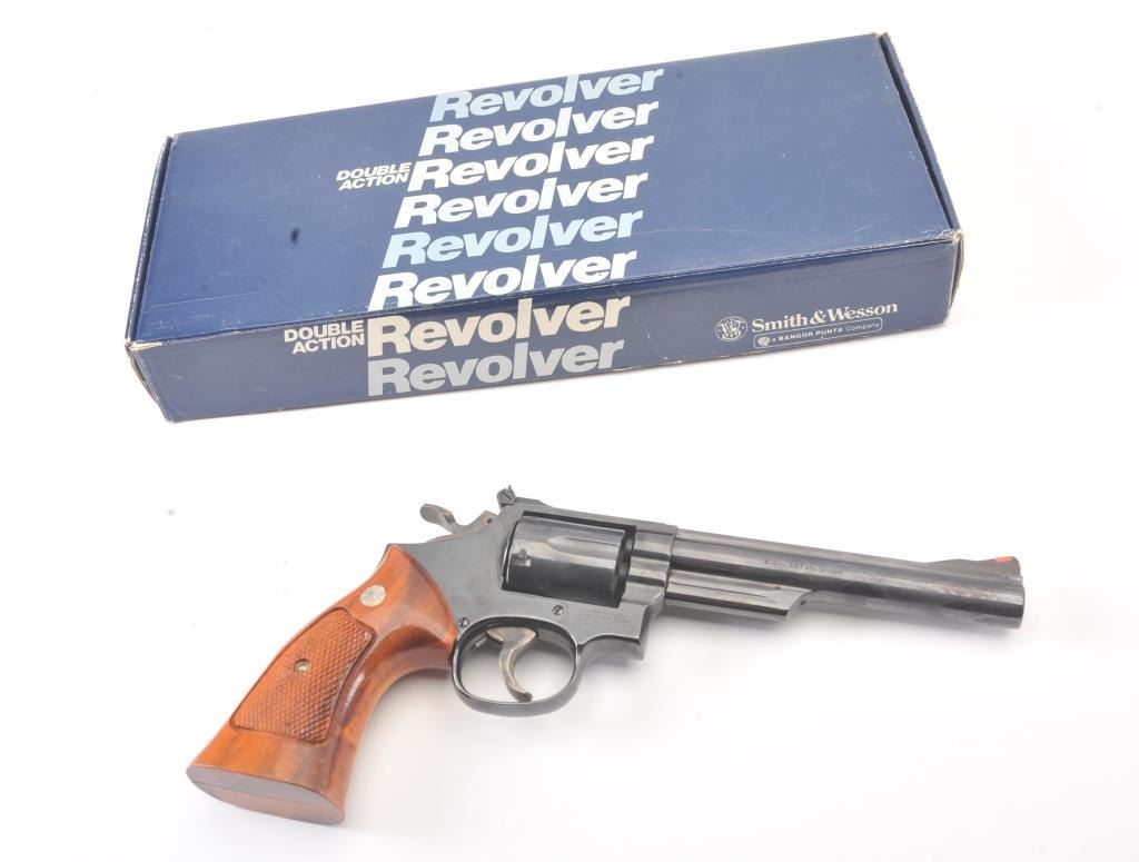 Smith & Wesson Model 19-5 Double Action Revolver in .357 Mag. with a 6" barrel, blued finish, and non-matching box, S/N 169K601. Limited firing and use. Needs cleaning from storage in an estate. 97%-99% overall.(Modern/PPT) Est.: $400-$800
