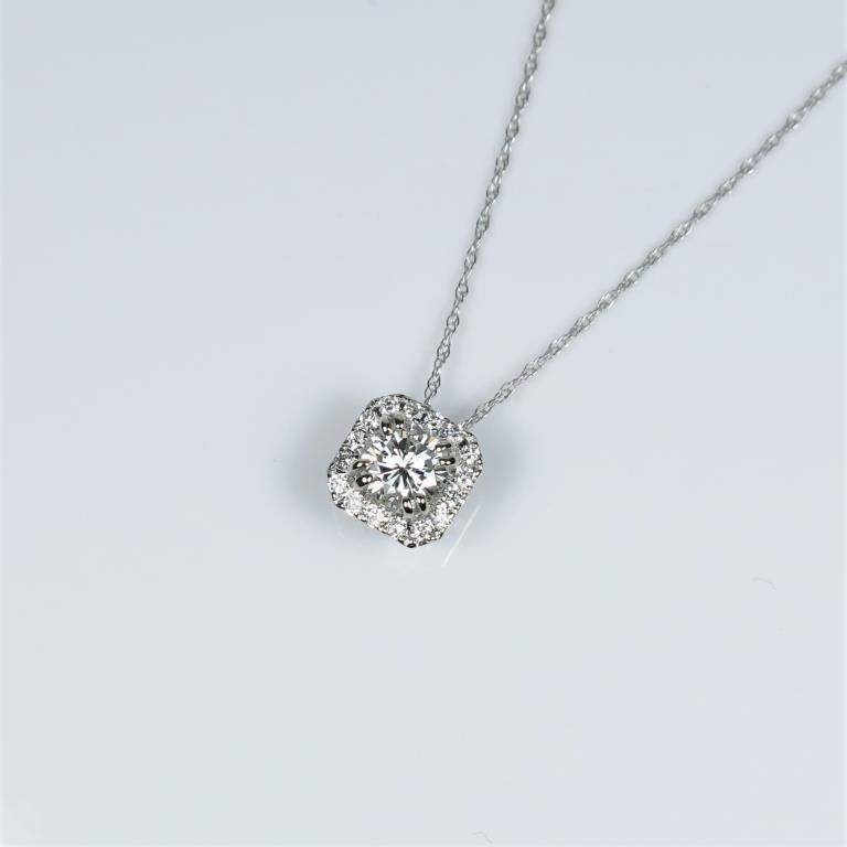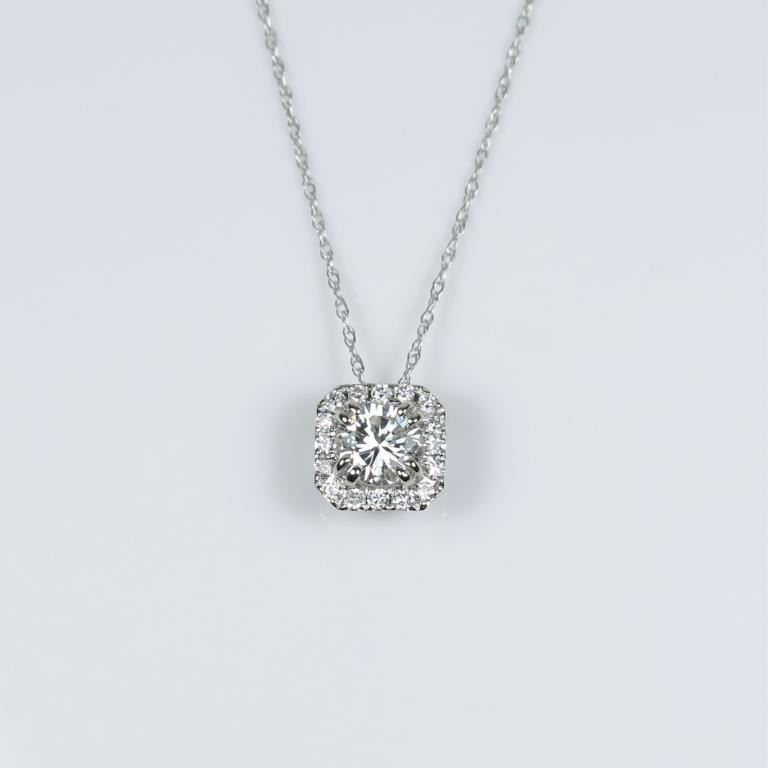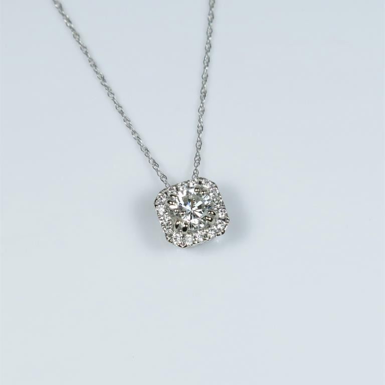 Dazzling NEW Diamond Pendant featuring a 0.60 carat IDEAL cut Diamond surrounded by 18 round cut Diamonds weighing approx. 0.30 carats with G-H colors VS clarity set in 18 karat white gold setting. Retail$5,000-$6,000 Estimates $3,000-$4,000