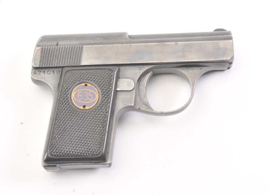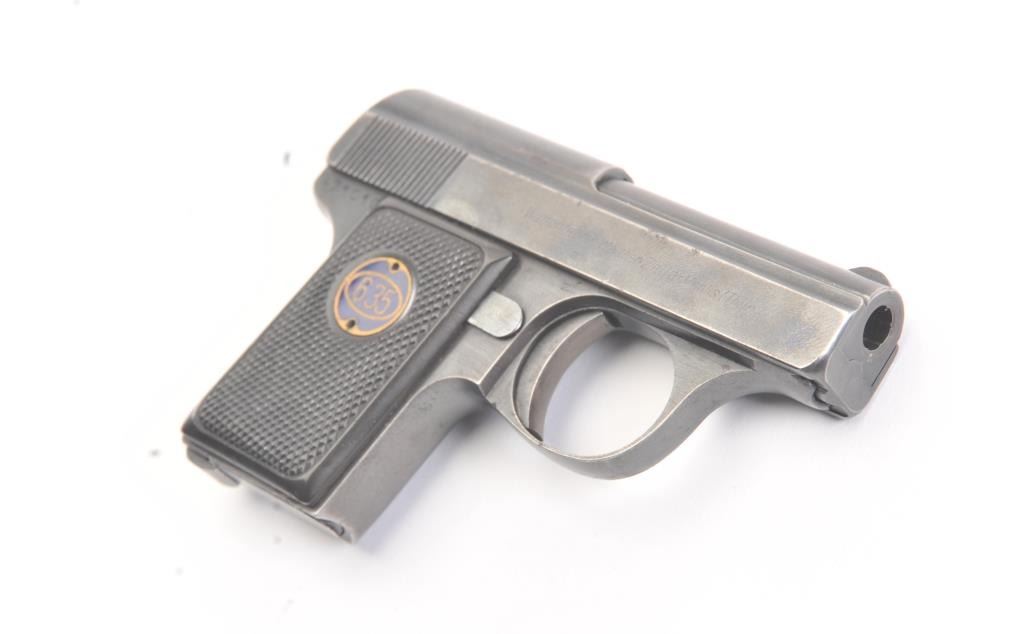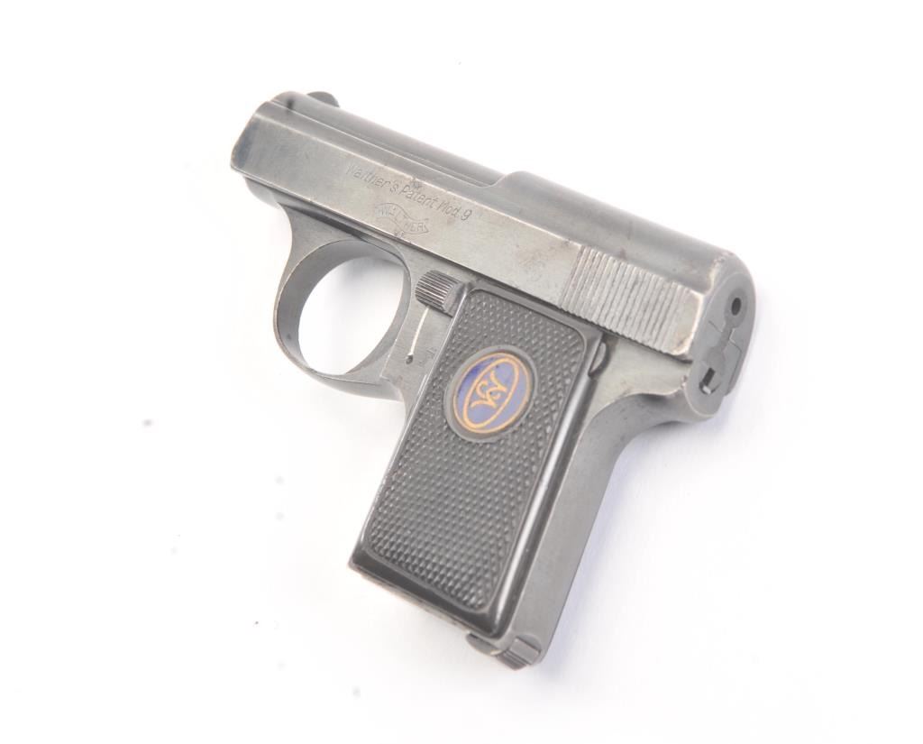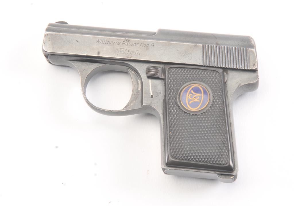 Walther Model 9 Semi Auto Pistol in .25 caliber S/N 421010 in very good condition. A very small pre-war auto not often encountered. 75%-85% original toning blue with very good grips showing enameled factory medallions. Correct mag. Good overall. Minor storage rust and erosion. A 7 1/2 on a 1-10 scale. (C&R/PPT) Est.: $350-$700