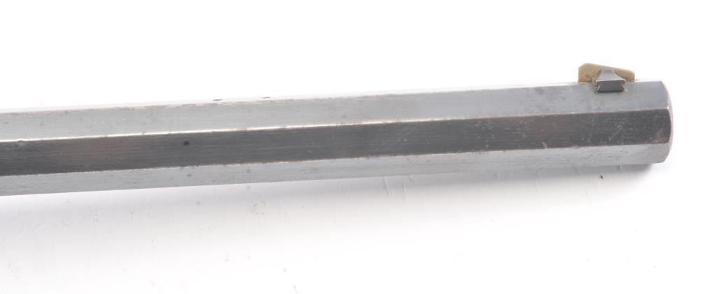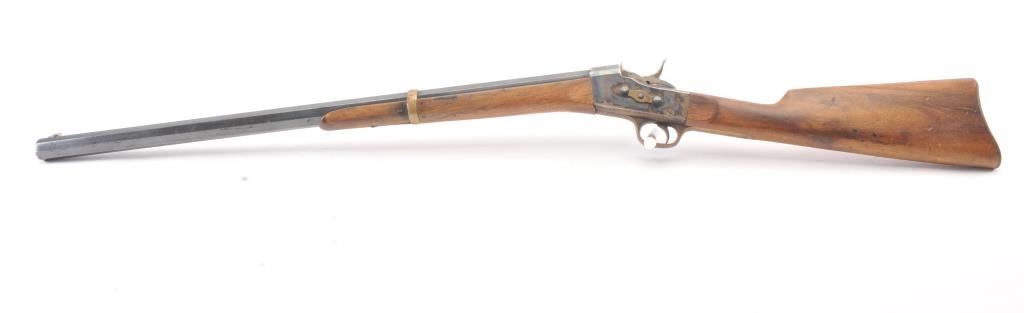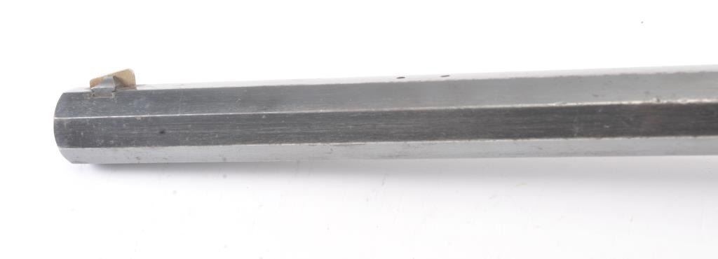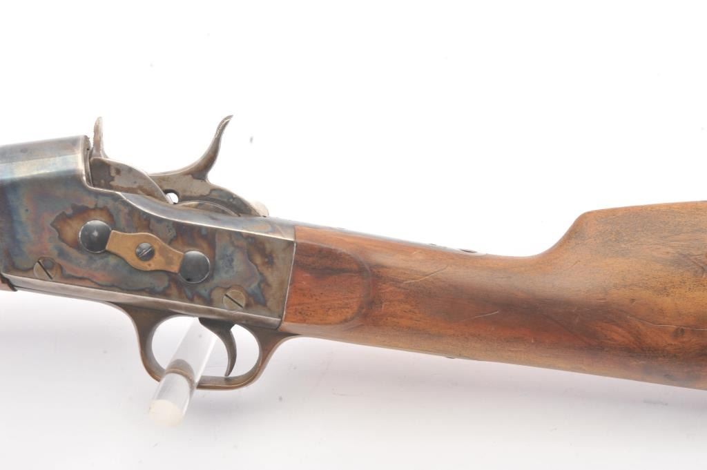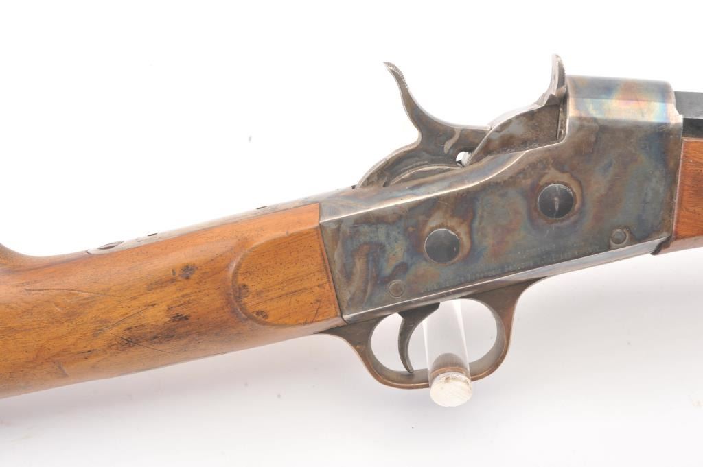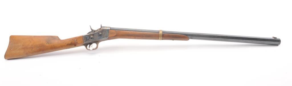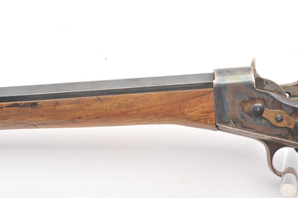 Navy Arms Reproduction Remington Rolling Block single shot rifle, .45-70 caliber, Serial #2181. The rifle is in very good overall condition with a custom 29” heavy octagon barrel installed by Dave Garman. The barrel is drilled and tapped for a scope mount. The receiver, hammer, breech block and tang are beautifully color case hardened with a brass trigger guard and barrel band. The smooth wood stock is in good conditionwith dents and mars consistent with field use. The bore is good, the action functions well and the markings are legible. The scope mounting was unfortunately not completed and there are no mounts included. Est.:$300-$600. (Modern).