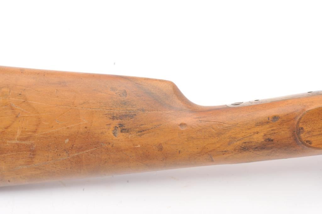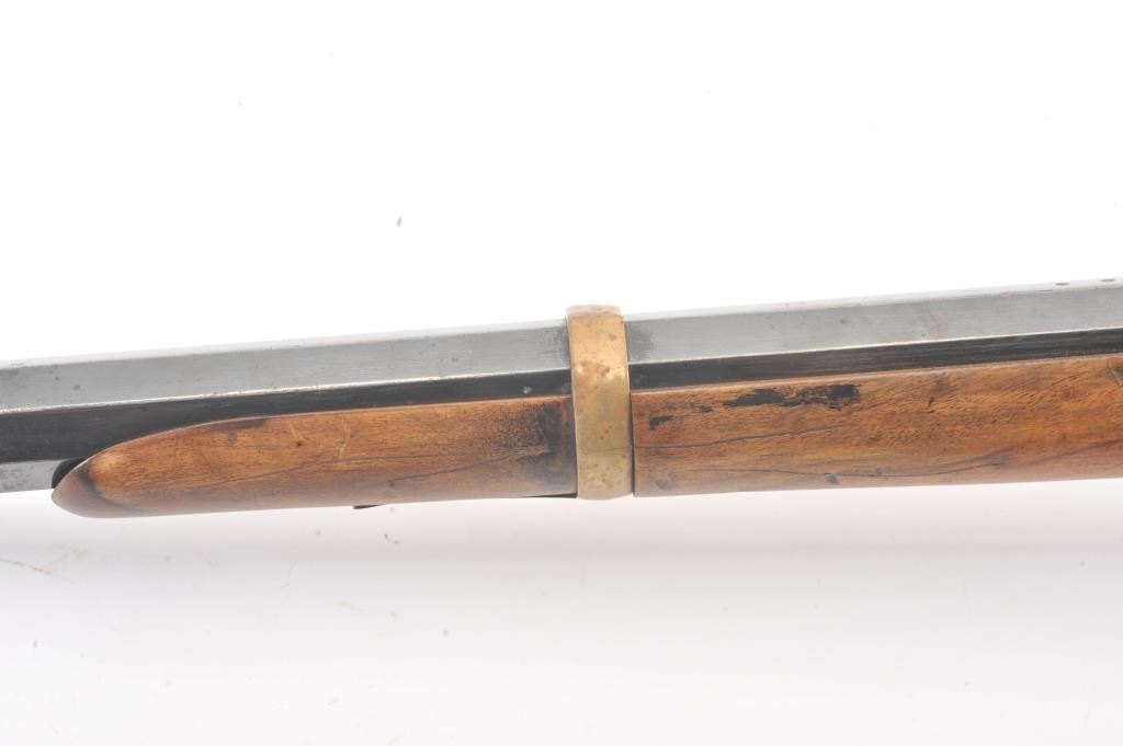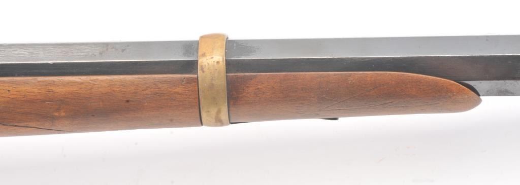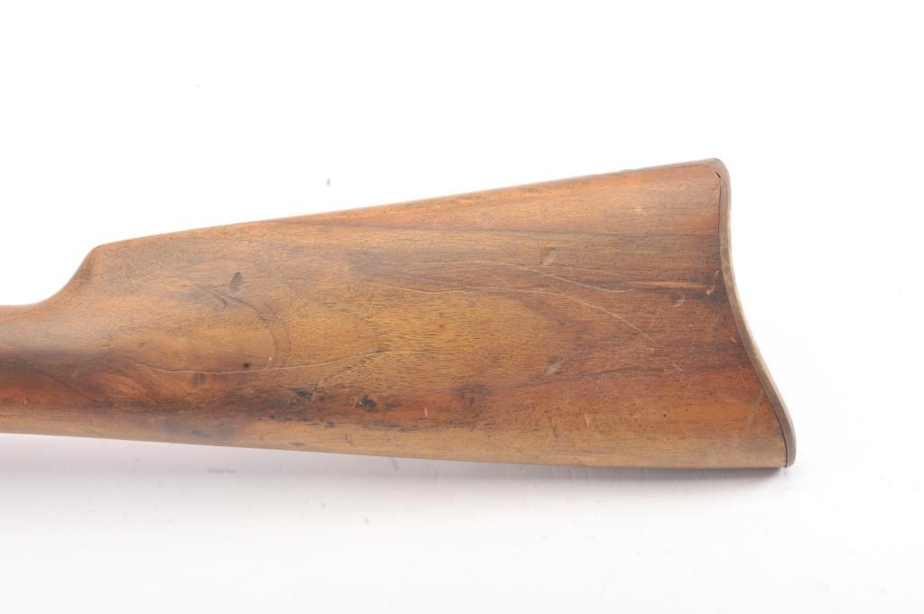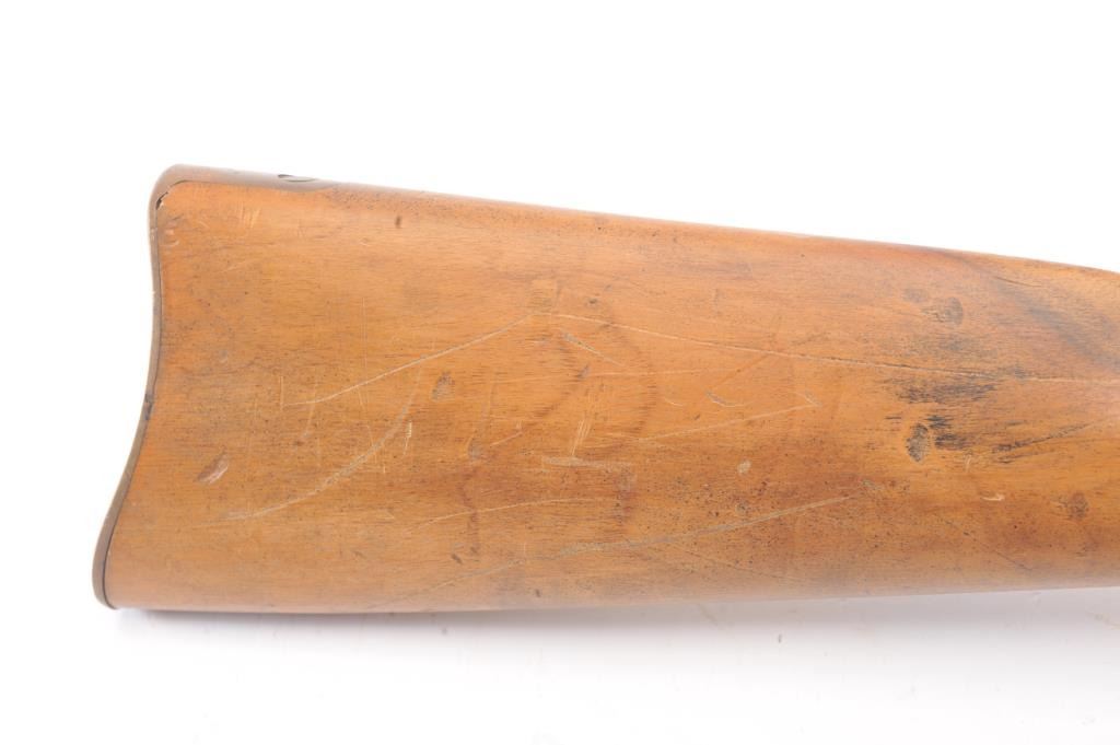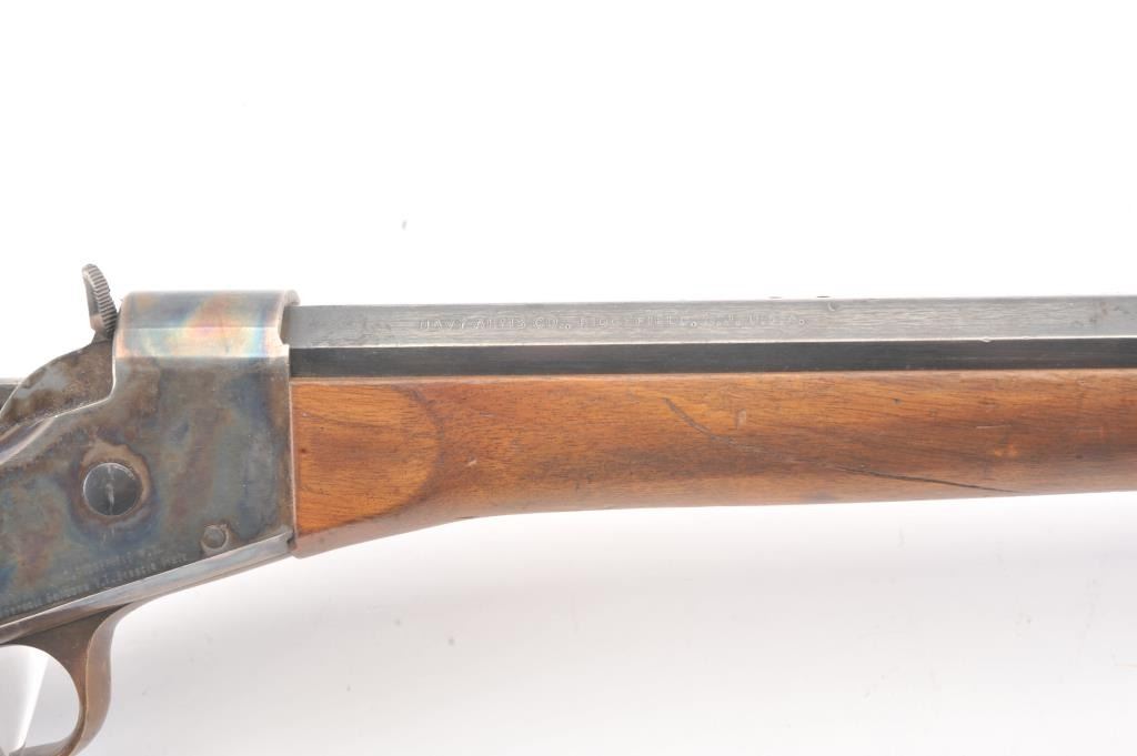 Navy Arms Reproduction Remington Rolling Block single shot rifle, .45-70 caliber, Serial #2181. The rifle is in very good overall condition with a custom 29” heavy octagon barrel installed by Dave Garman. The barrel is drilled and tapped for a scope mount. The receiver, hammer, breech block and tang are beautifully color case hardened with a brass trigger guard and barrel band. The smooth wood stock is in good conditionwith dents and mars consistent with field use. The bore is good, the action functions well and the markings are legible. The scope mounting was unfortunately not completed and there are no mounts included. Est.:$300-$600. (Modern).