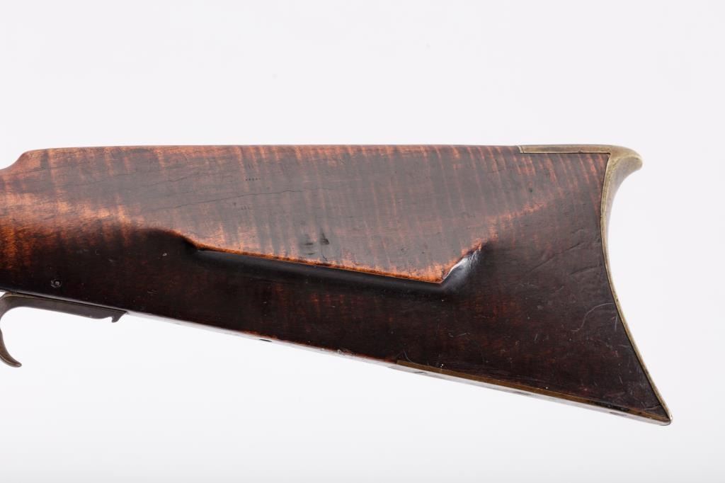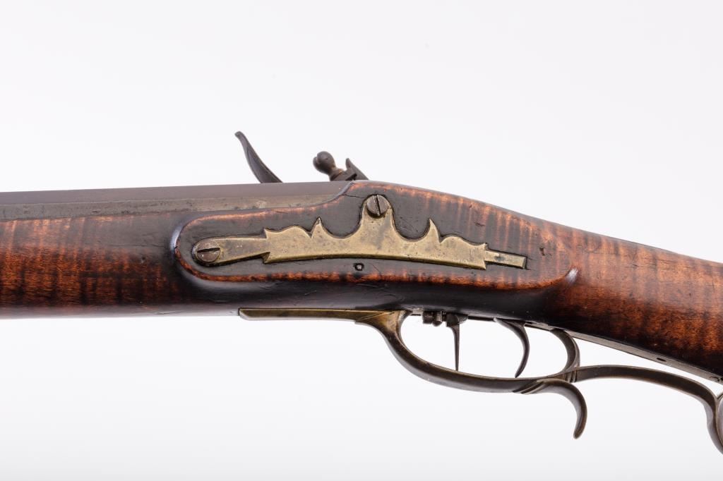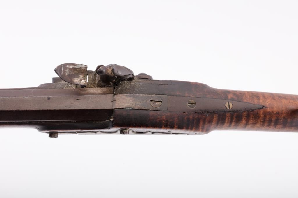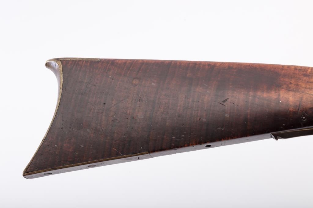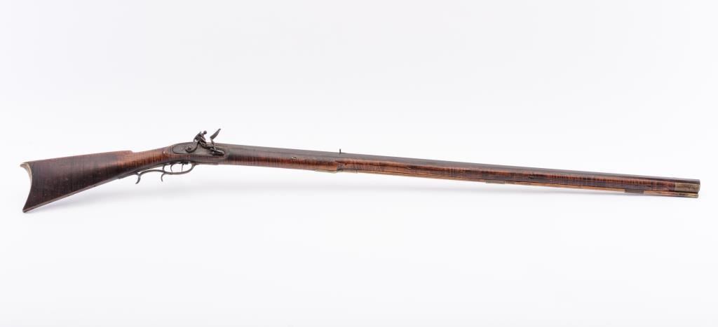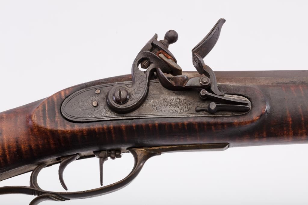 Full stock Kentucky Flintlock rifle of large proportions with lock marked “H. Elwell Warranted” and no signature on the barrel. Measures approximately 61” overall with a 45” heavy barrel of .44 caliber rifled measuring approximately 1” across the center of the muzzle and the gun weighs approximately 13 pounds. Double set triggers and fancy brass side plate secured by 2 screws. Large V notch rear sight with blade front sight.Completely original and untouched with dark patina on metal surfaces. The stock is artificially striped and in good condition with incised line along the ram rod area terminating in “squiggly” line. The lockworks when the trigger is set but otherwise does not hold in the notch. The butt is somewhat thick and large and has a similarity to Tennessee and Kentucky made arms of 1820-30s. From an old Northern Californiacollection. (Antique) Est.: $800-1600
