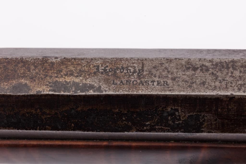 Full Stock Heavy barrel percussion Target rifle marked “J. Fordney Lancaster”. Measures 61 ½” overall with a 45” heavy octagon barrel of .57-58” caliber rifled bore. Shows quality manufacture and engraved piercedpatch box. Adjustable tang sight and hooded target type front sight. Set triggers. Locks working and triggers set. The wood is very good plus with rifle shape and nice proportions with pleasing aesthetics. Themetal shows some erosion and pitting and the original sight has been reset and original dove tail plugged. The Fordney family were famous in Lancaster Penn. From an old Northern California collector. (Antique)Est.: $1200-2400
