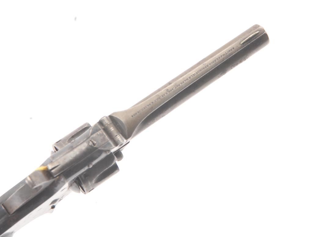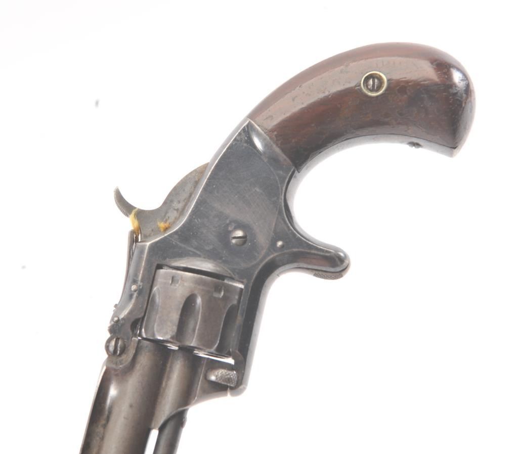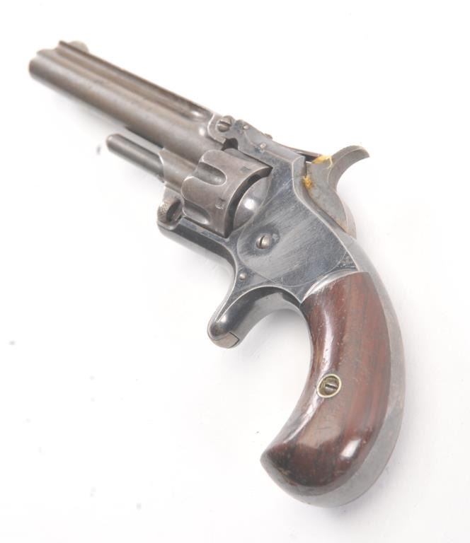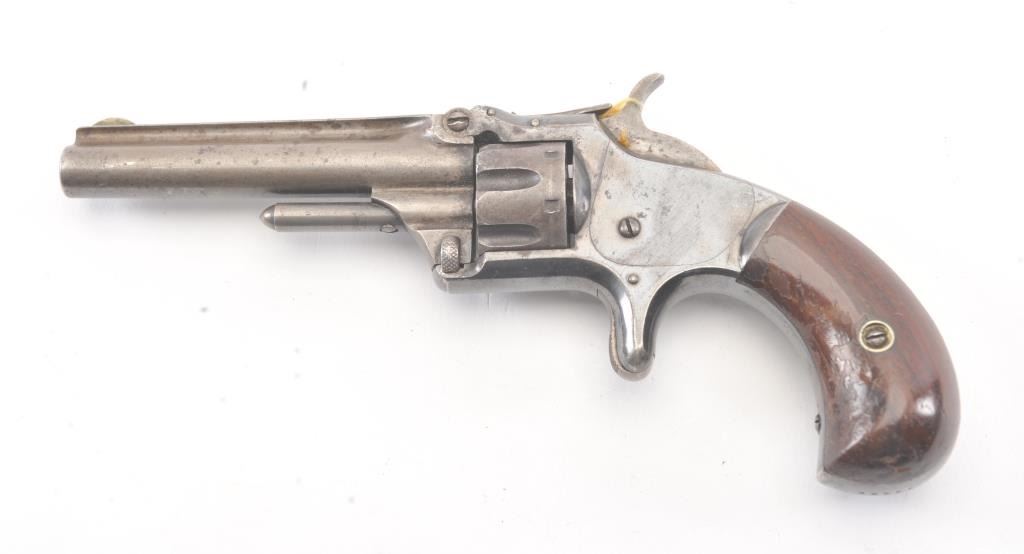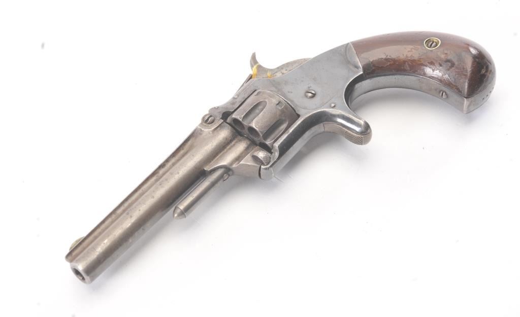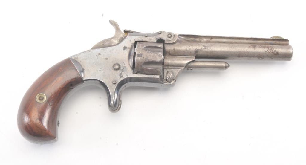 Smith & Wesson 1st Model 3rd issue .22 caliber 7 shot single action revolver with blue finish, S/N 44449. 30%-50% original blue with drifting and toning and some minor erosion and pinprick pitting. The grips andmarkings are good. Works well and good overall. (Antique) Est.: $250-$500
