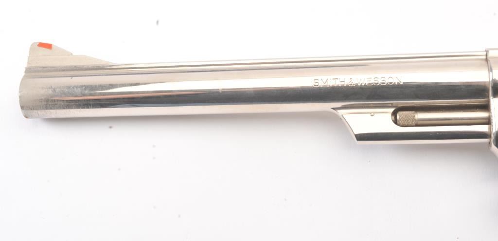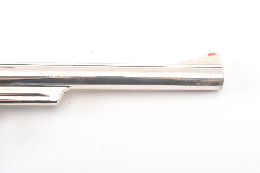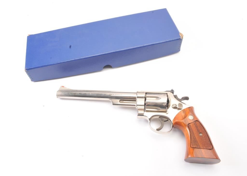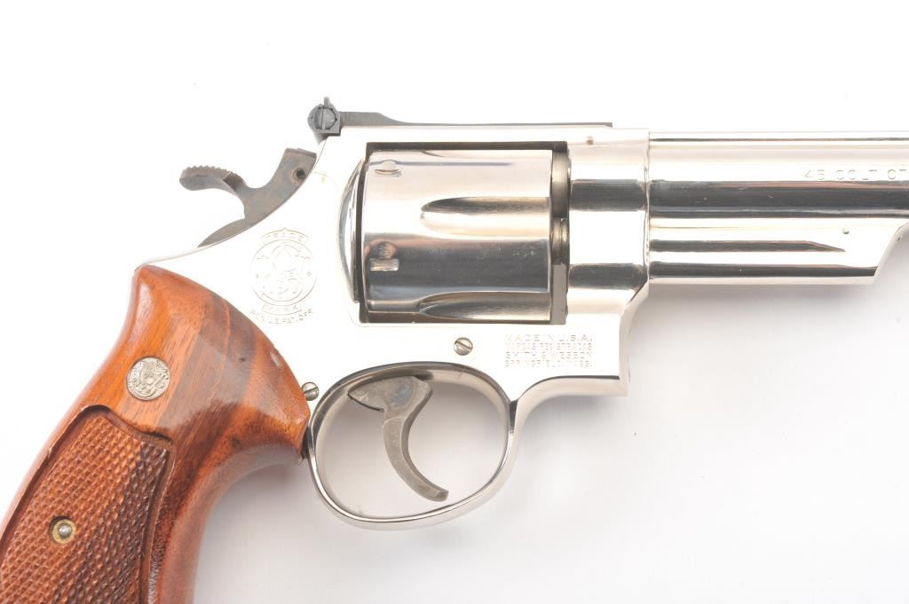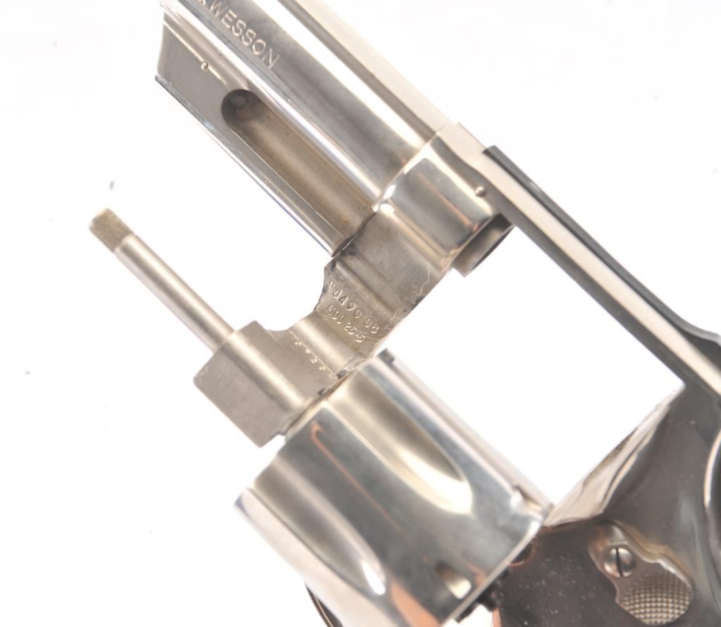 Smith & Wesson 25-5 Double Action Revolver in .45 Colt caliber with a 8 3/8" barrel, factory nickel finish and box, S/N N849008. No label on the box with screwdriver and literature and papers. Fine to excellent used condition. 96%-98% with signs of firing and use (Dark rings on the front of the cylinder). Needs cleaning. Desirable. (Modern/PPT) Est.: $600-$1200
