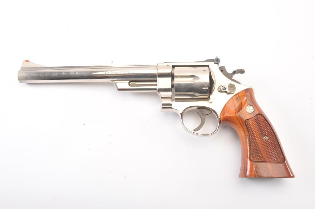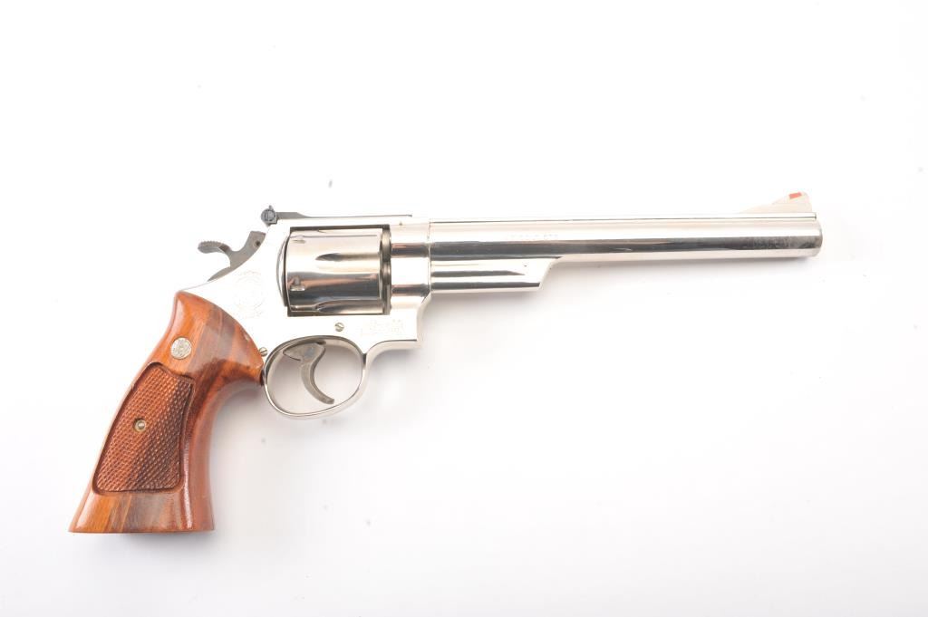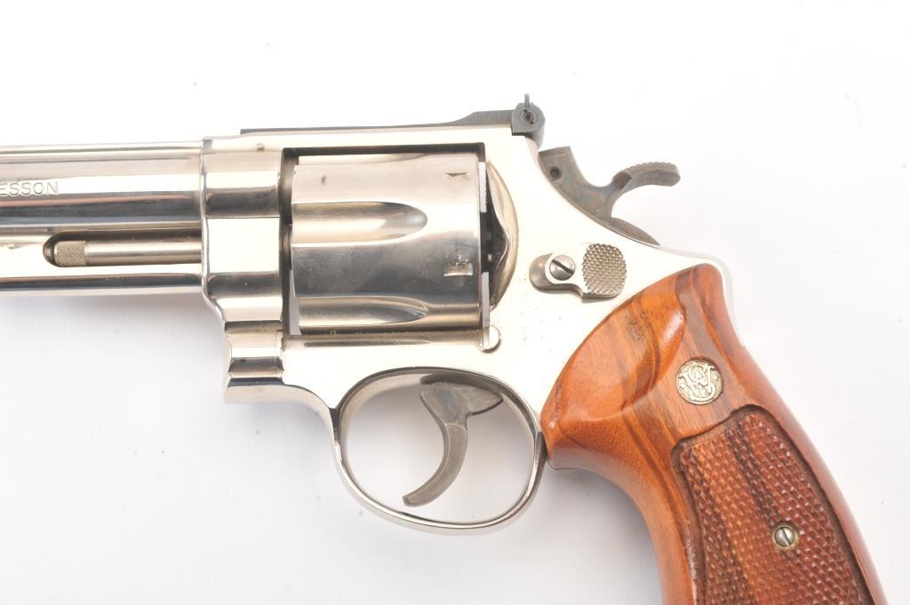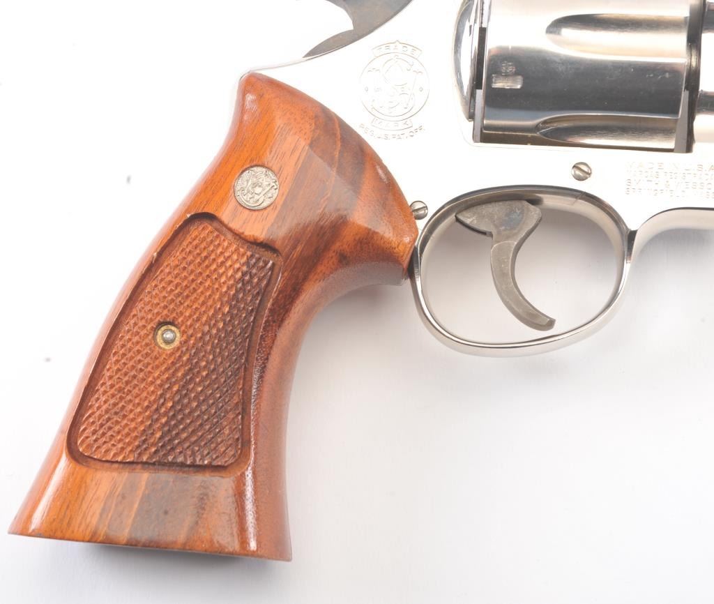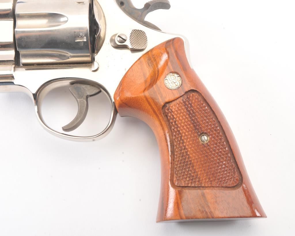 Smith & Wesson 25-5 Double Action Revolver in .45 Colt caliber with a 8 3/8" barrel, factory nickel finish and box, S/N N849008. No label on the box with screwdriver and literature and papers. Fine to excellent used condition. 96%-98% with signs of firing and use (Dark rings on the front of the cylinder). Needs cleaning. Desirable. (Modern/PPT) Est.: $600-$1200