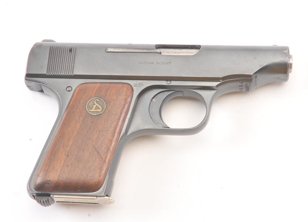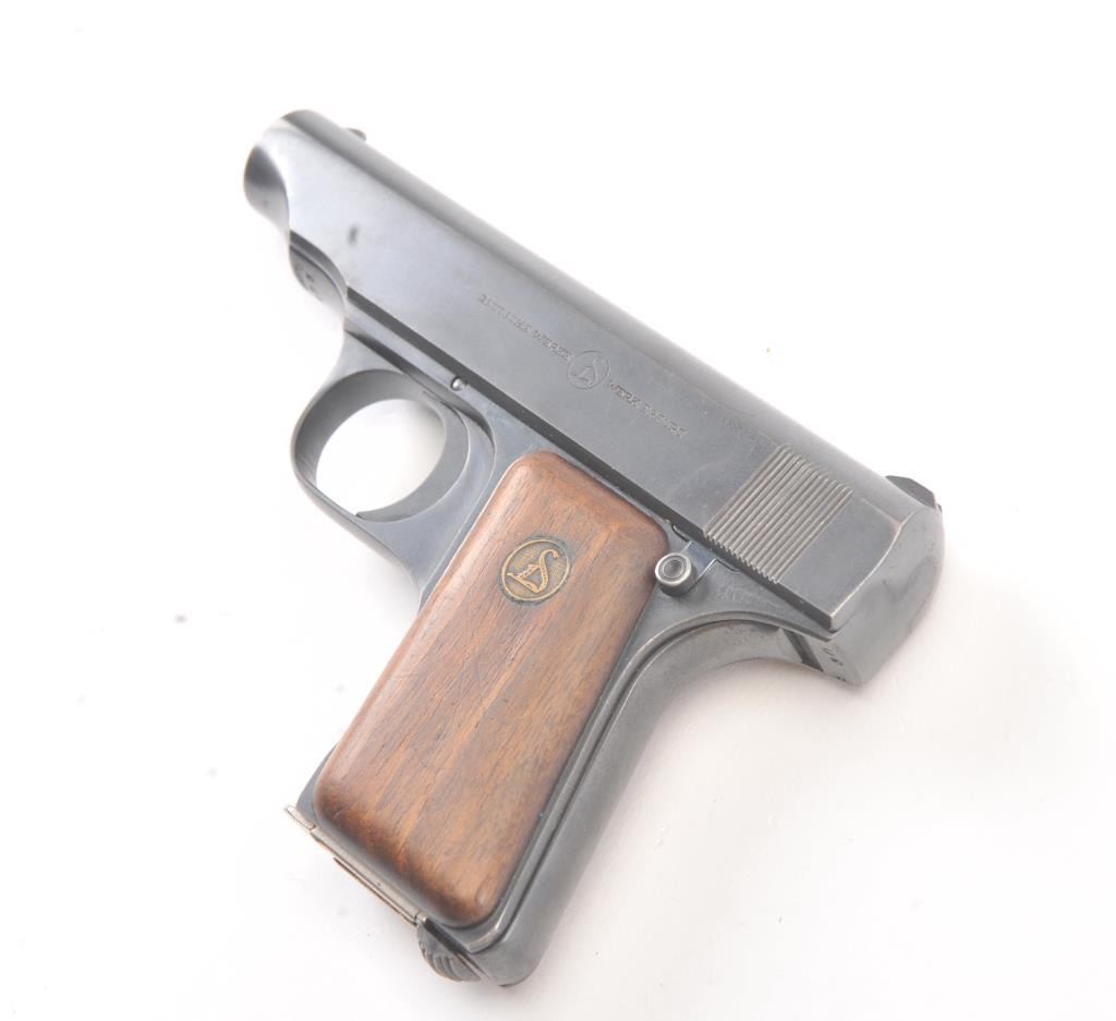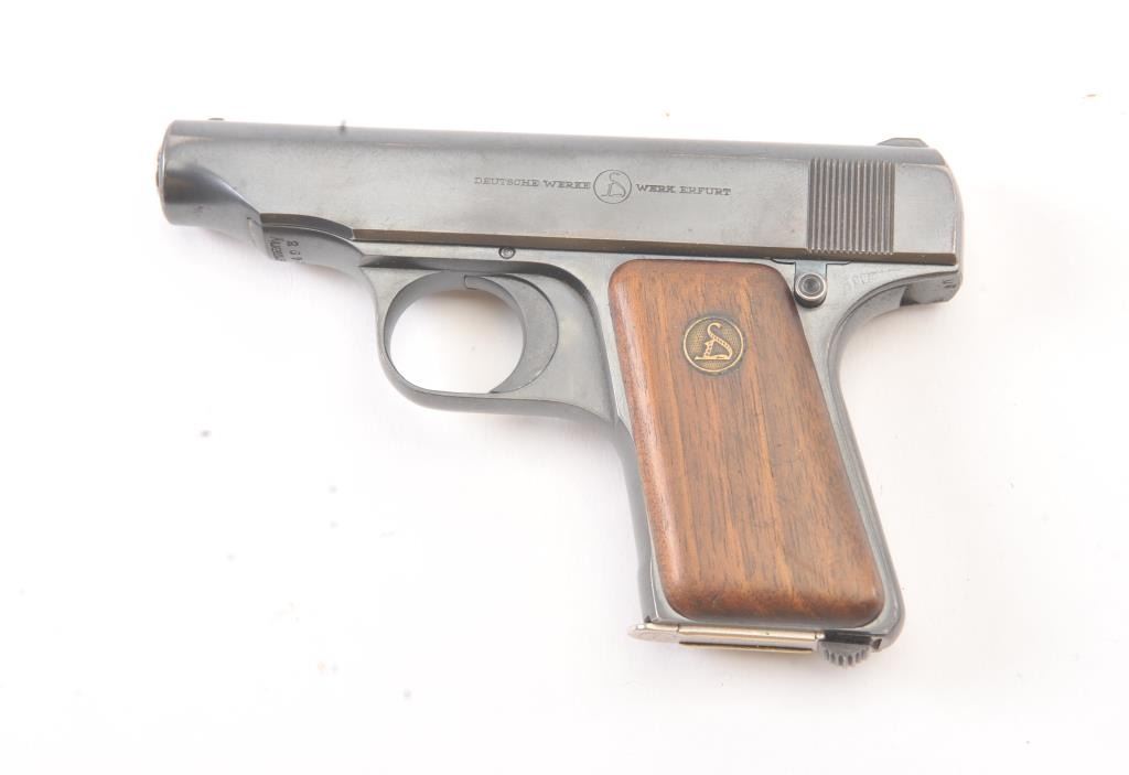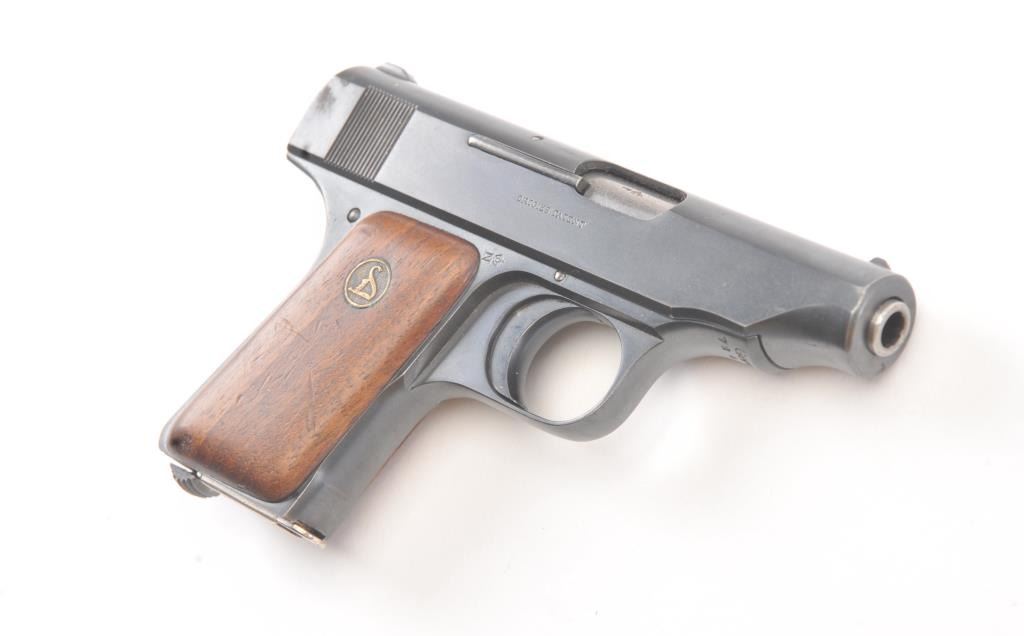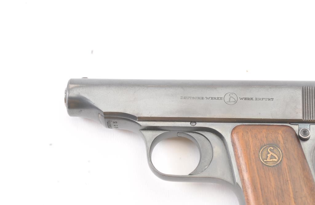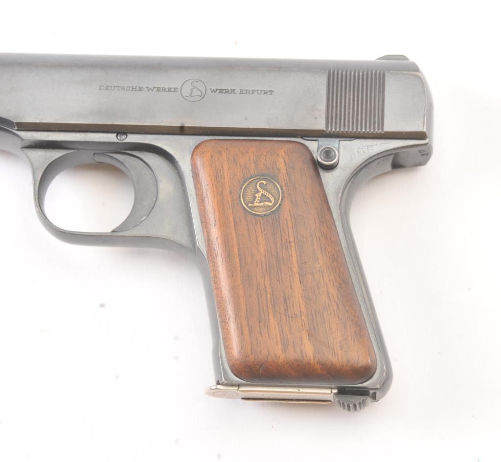 Ortgies Patent .25 auto made by DWM Germany in Pre-War era, S/N 72495. Near fine condition with 95% plus original blue with medallion wood grips, and just slight loss at the muzzle. Crisp overall with bright bore.Marked original nickel mag. A favorite of German officer's in WWII era as a private purchase. (C&R/PPT) Est.: $300-$600