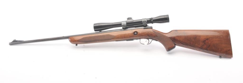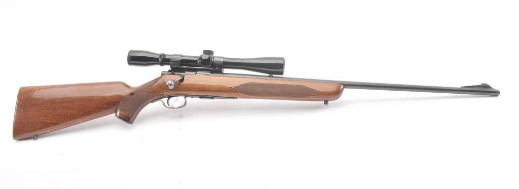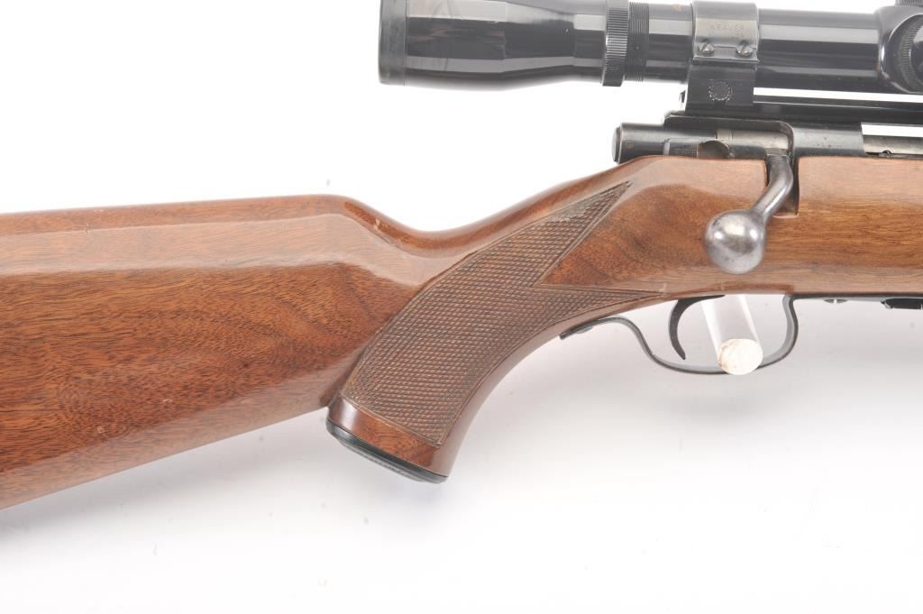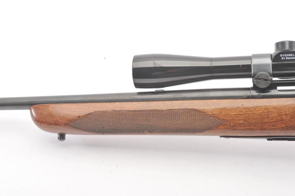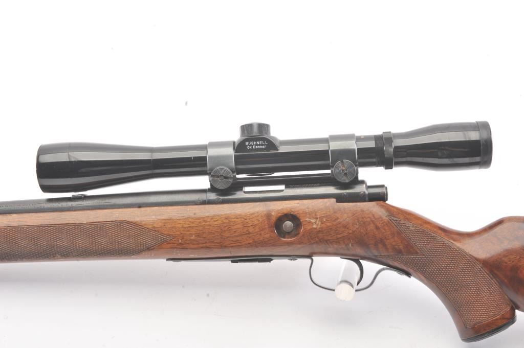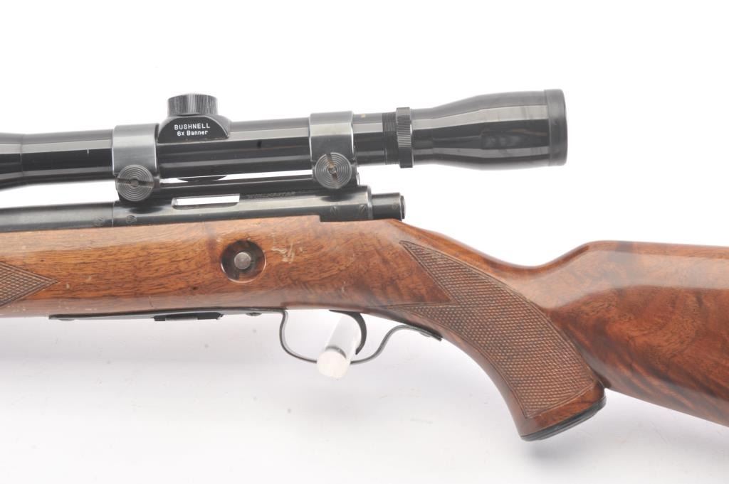 Winchester Model 75 bolt action rifle, .22 Long Rifle caliber, Serial #64218. The rifle is in good overall condition with a 23” barrel with a ramped blade front and the rear sight removed. The rifle retains asignificant amount of muted blue finish with the remainder going to patina. The barrel has a 4” section on the left side where the finish has been rubbed down to bare metal. The checkered wood stock has been re-finished with an additional coat of varnish added, with small mars and compressions from field use. The butt stock ends with a ribbed steel butt plate. The rifle is topped with a Bushnell Banner fixed 6x rifle scope. Thebore is dirty and may clean to fair and the action functions. The lot includes one correct magazine. Est.: $200-$400. (C+R).