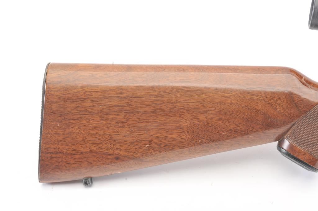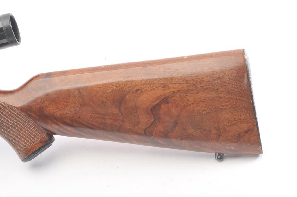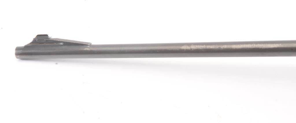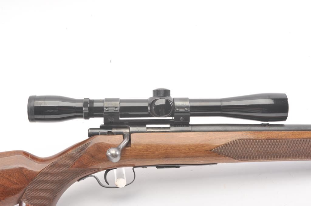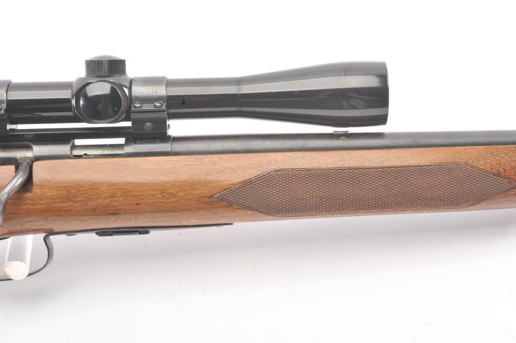 Winchester Model 75 bolt action rifle, .22 Long Rifle caliber, Serial #64218. The rifle is in good overall condition with a 23” barrel with a ramped blade front and the rear sight removed. The rifle retains asignificant amount of muted blue finish with the remainder going to patina. The barrel has a 4” section on the left side where the finish has been rubbed down to bare metal. The checkered wood stock has been re-finished with an additional coat of varnish added, with small mars and compressions from field use. The butt stock ends with a ribbed steel butt plate. The rifle is topped with a Bushnell Banner fixed 6x rifle scope. Thebore is dirty and may clean to fair and the action functions. The lot includes one correct magazine. Est.: $200-$400. (C+R).