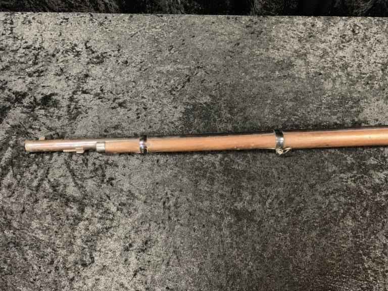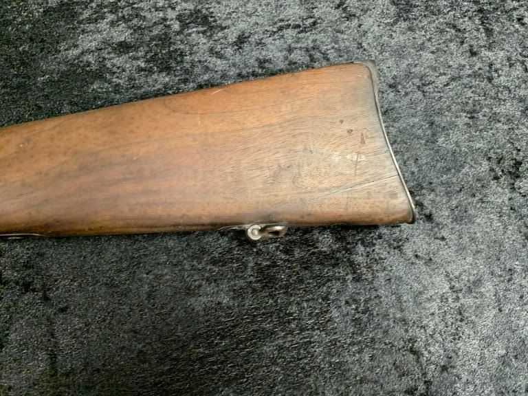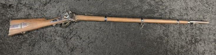 Sharps New Model 1859 Military rifle with iron mounts and patch box with under mounted bayonet lug for sabre bayonet, S/N 37238. (Refer Flayderman 5F-023). Old re-blued finish of which 75%-85% remains turningpurple with visible barrel markings and lock markings. Correct sights and small parts except primer mechanism removed. The bore is near excellent with strong rifling. The stocks are cleaned but cleaned and sandedslightly at the time of refinish with circular hole plugged with wood behind the rear swivel long, long ago. Type of re-blue attributed to Bannerman's at the turn of the century. (Antique) Est.: $1200-$2400