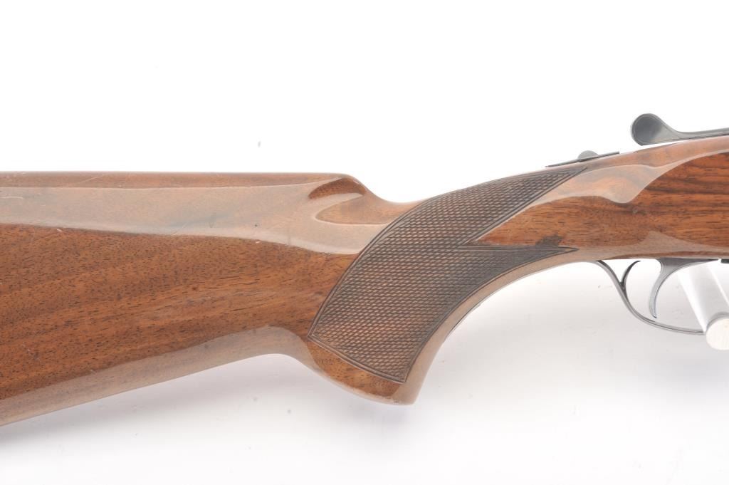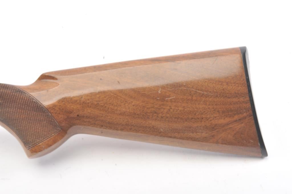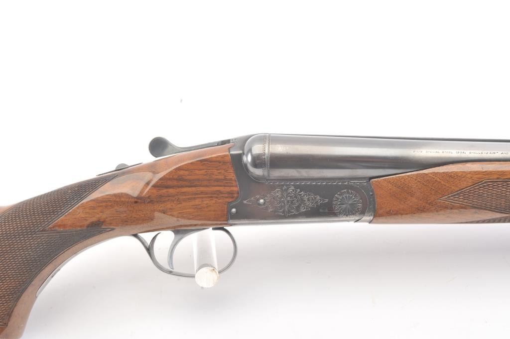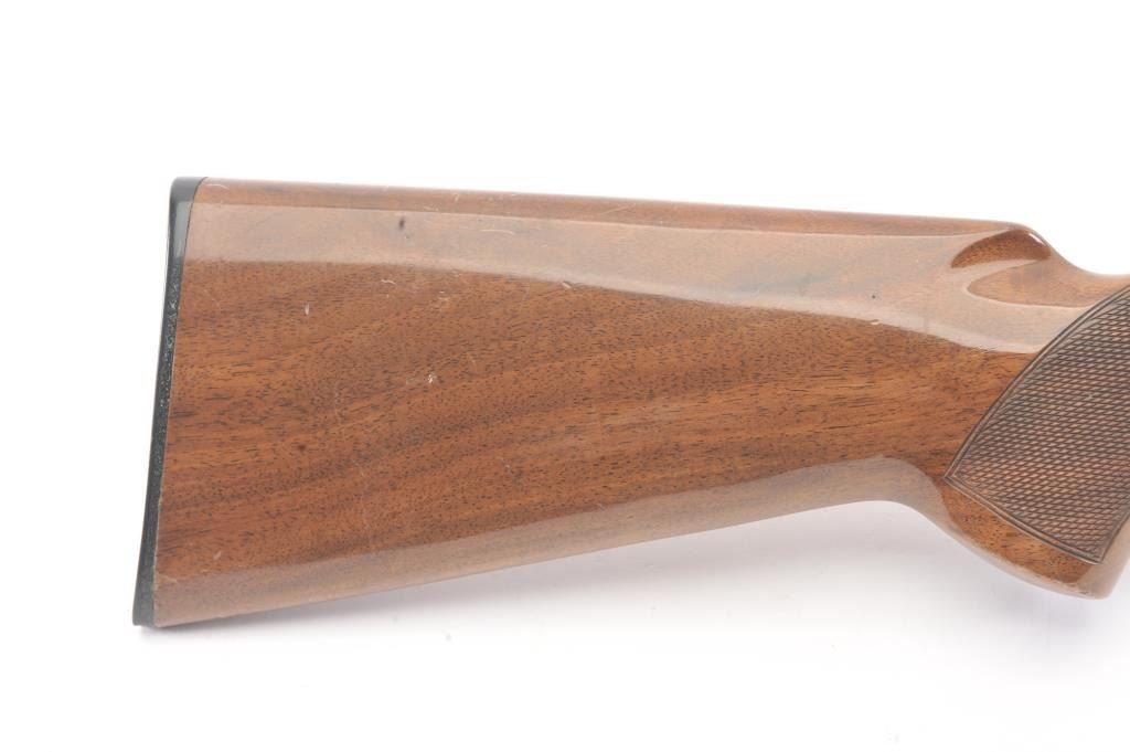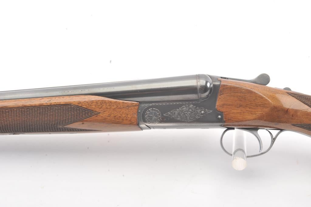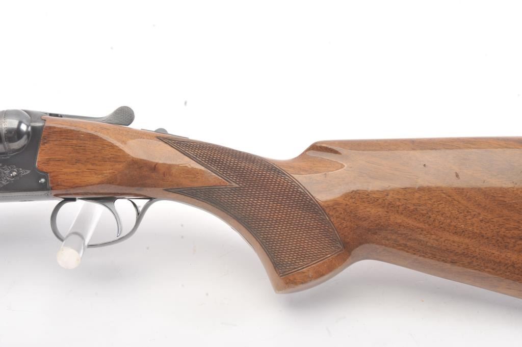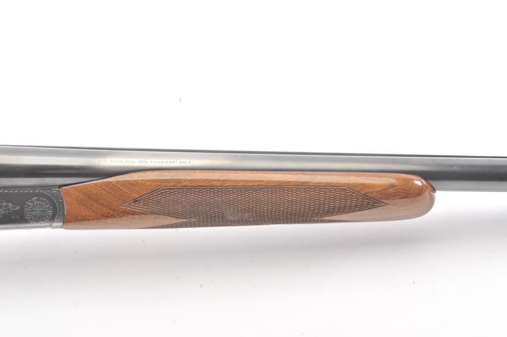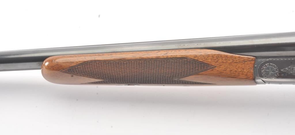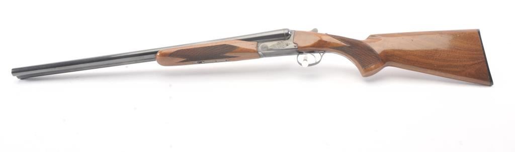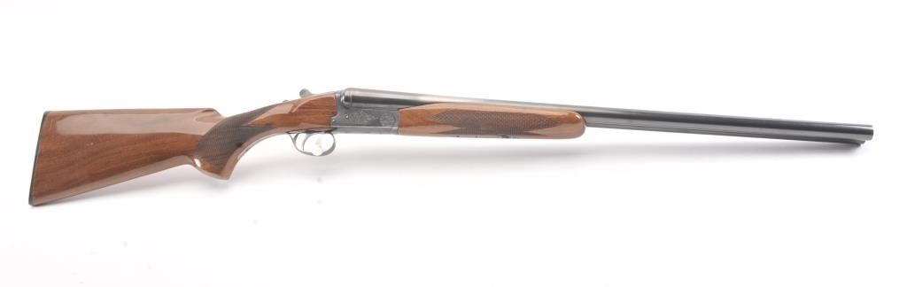 Browning BSS Side by Side shotgun, 12 gauge, Serial #05282RT158. The shotgun is in very good overall condition with 26” barrels with a full-length filed rib and steel bead front sight. The barrels retain a significantamount of thinning blue finish with wear on top of both barrels. The barrels are choked Modified and Improved chambered for both 2 ¾” and 3” shells. The checkered wood stock is in very good condition with a Deeley fore end latch and small mars and scratches consistent with field use. The butt stock ends with a plastic Browning marked butt plate providing a 14 ¼” LOP to a single selector trigger. The bores are dirty butmay clean to good and the action works well. Est.: $500-$1,000. (Modern).