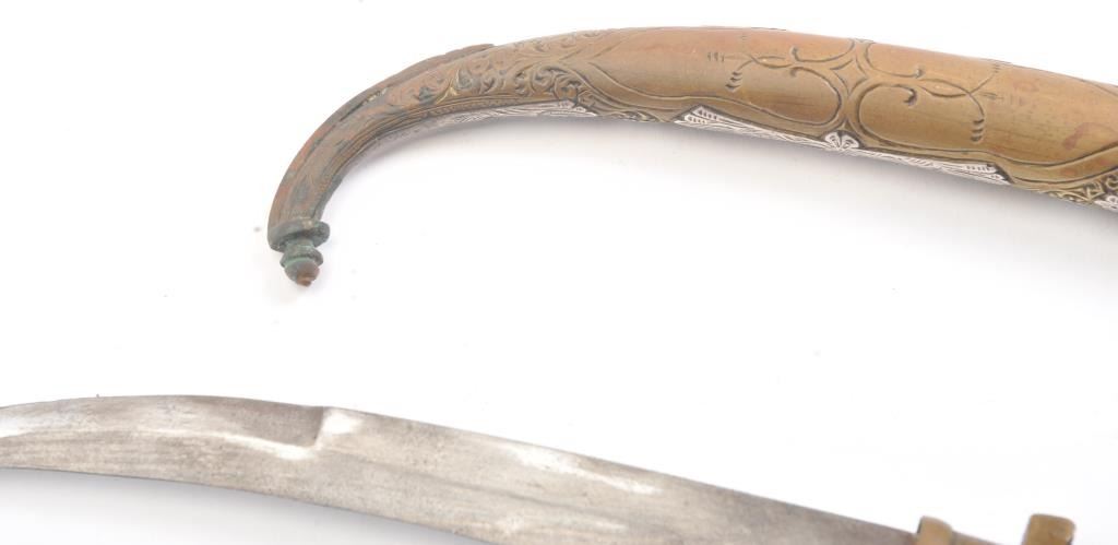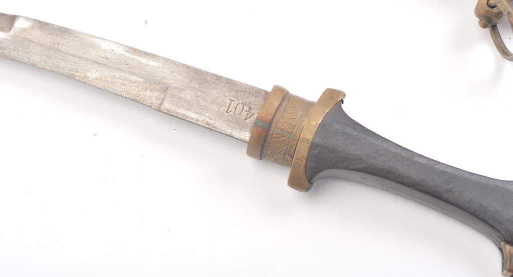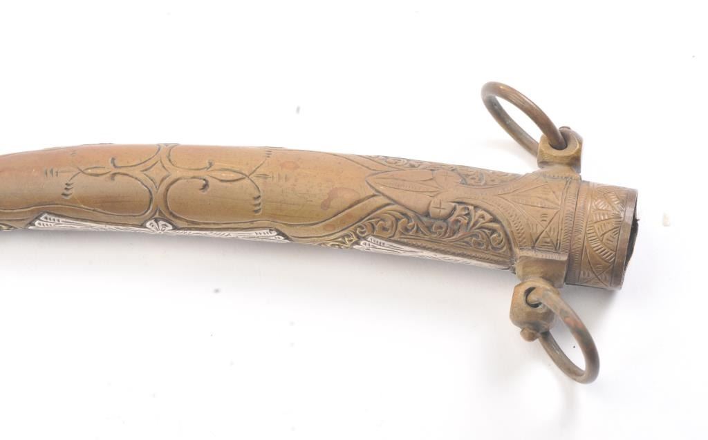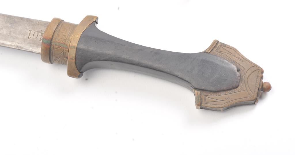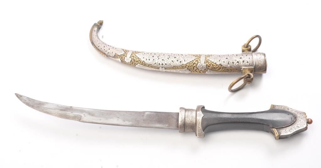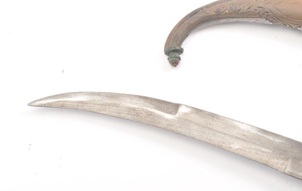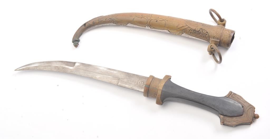 Mid-Eastern Jambya circa 19th century. Nicely silver inlaid on brass scabbard. #0401 on the blade. Good condition. Sold more than 30 years ago by Little John's’ for MGM property. Probably Valentino era or Pre-War “GoldenAge” movies. Est.: $200-$400