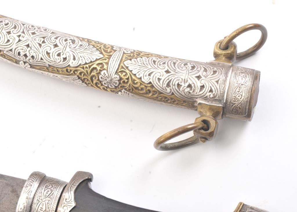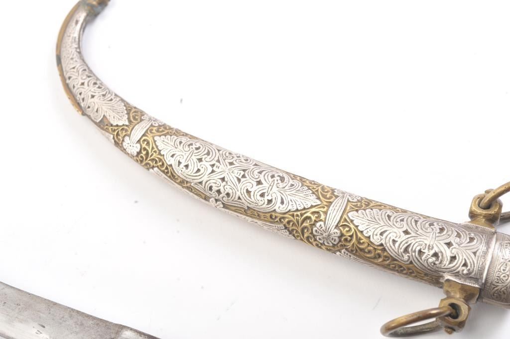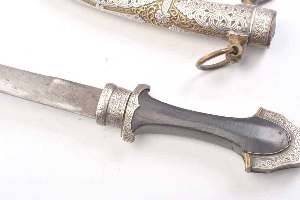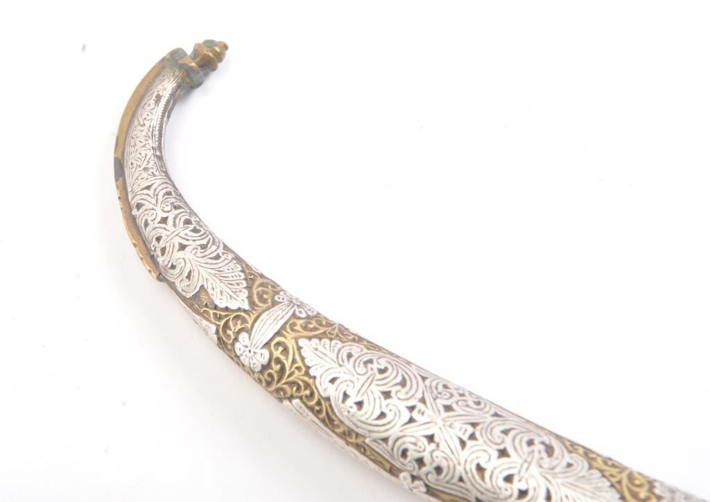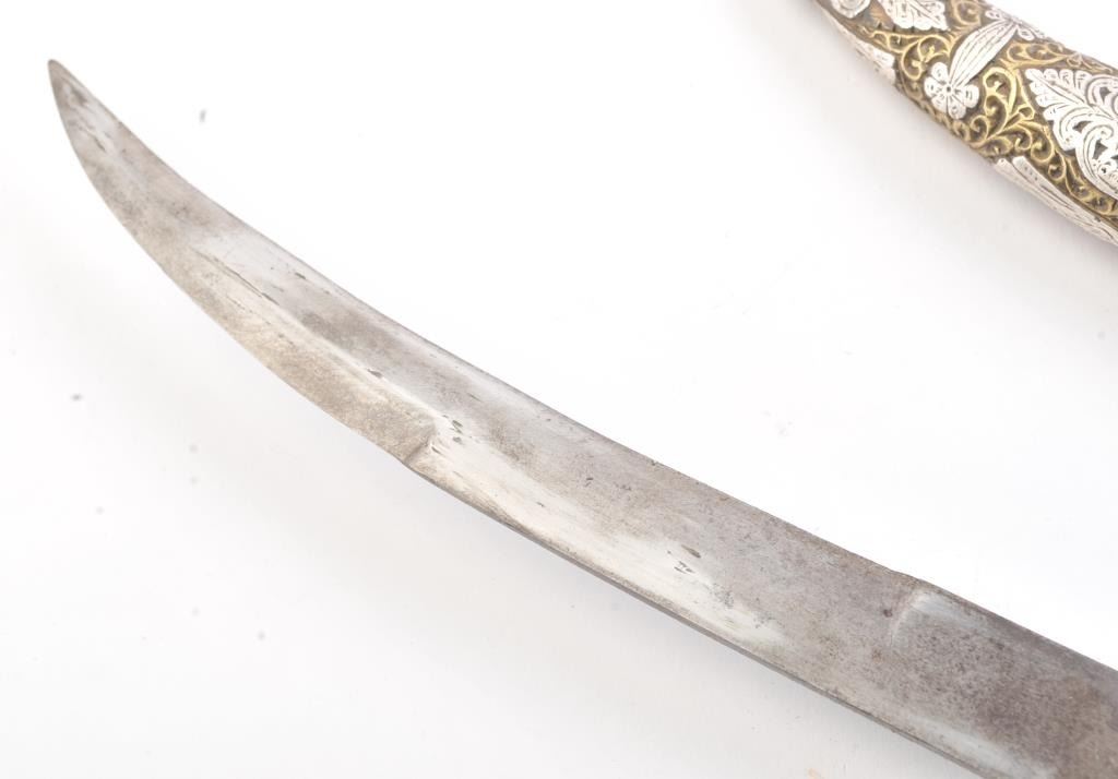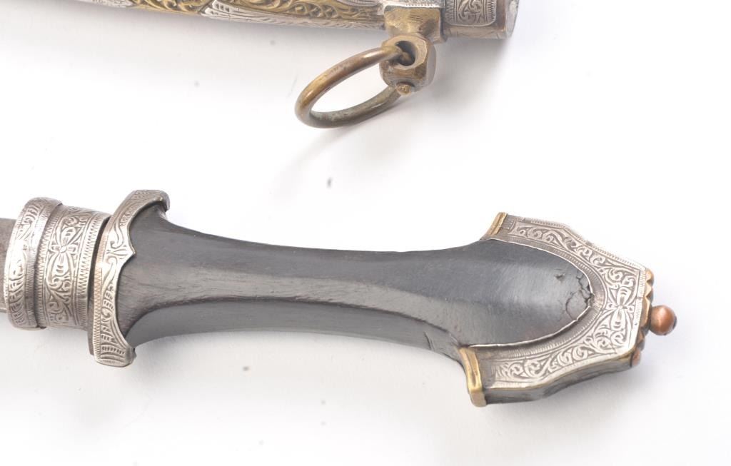 Mid-Eastern Jambya circa 19th century. Nicely silver inlaid on brass scabbard. #0401 on the blade. Good condition. Sold more than 30 years ago by Little John's’ for MGM property. Probably Valentino era or Pre-War “GoldenAge” movies. Est.: $200-$400