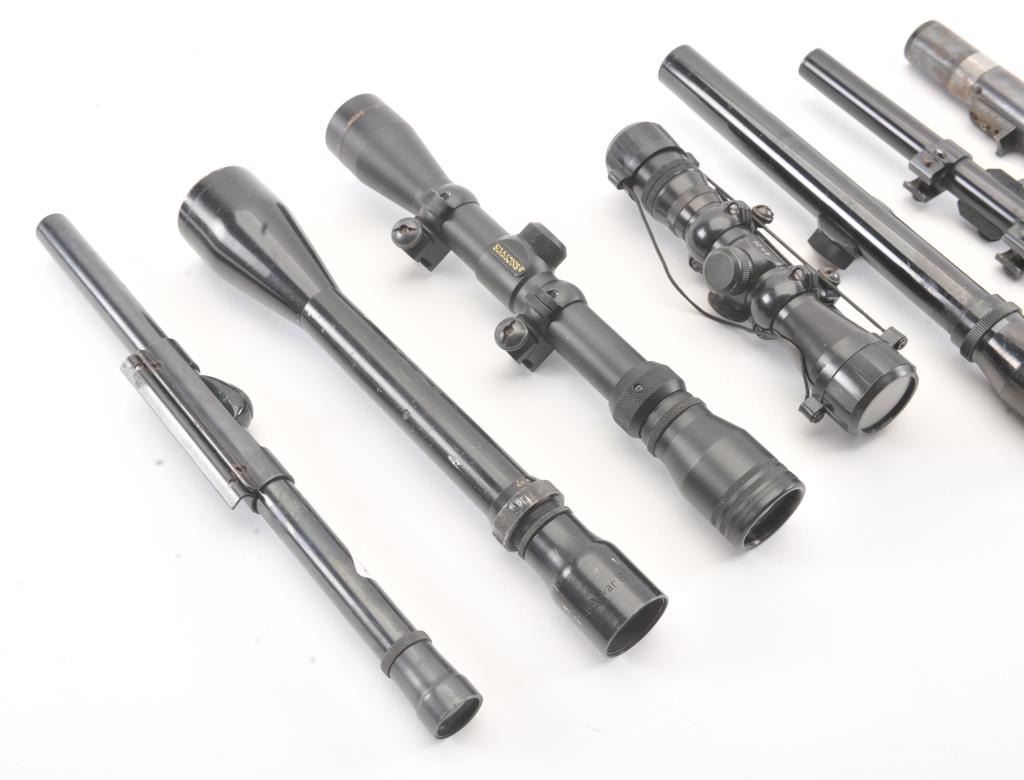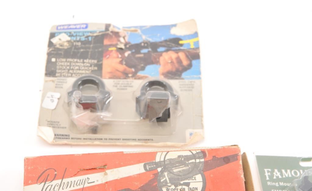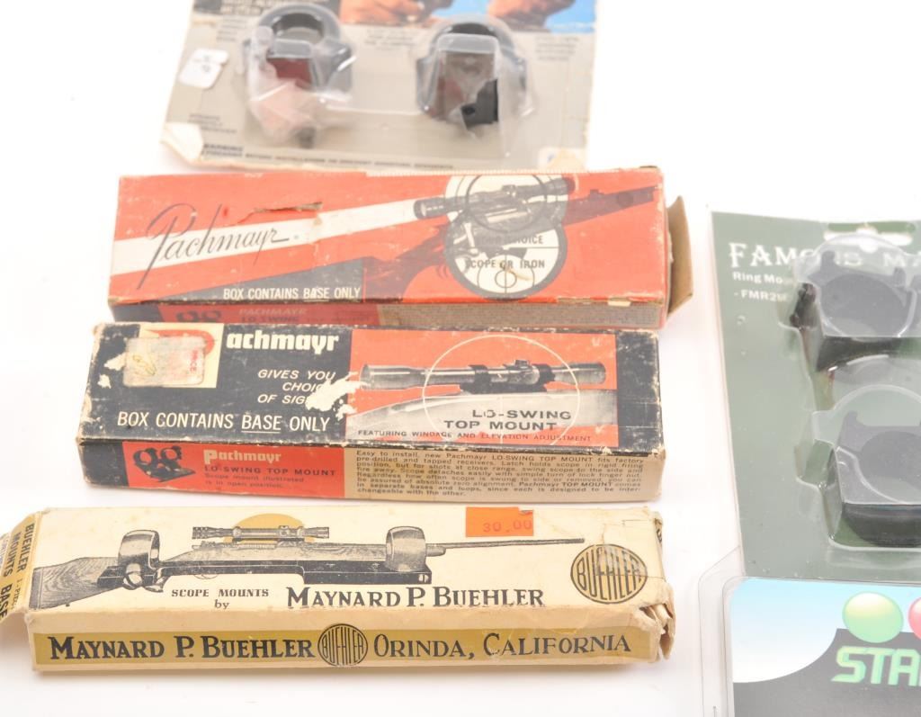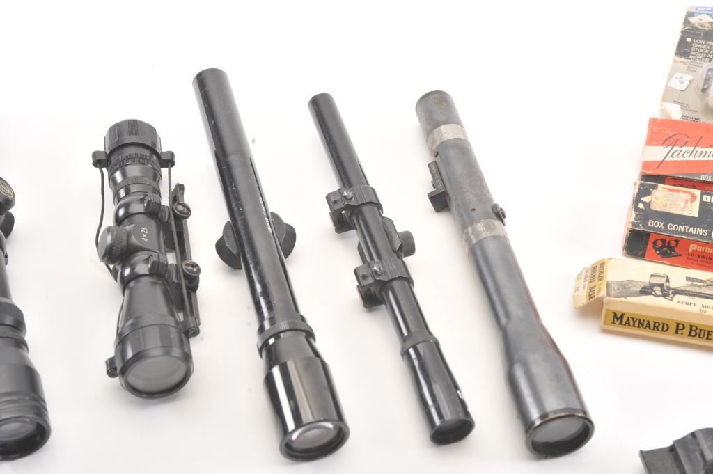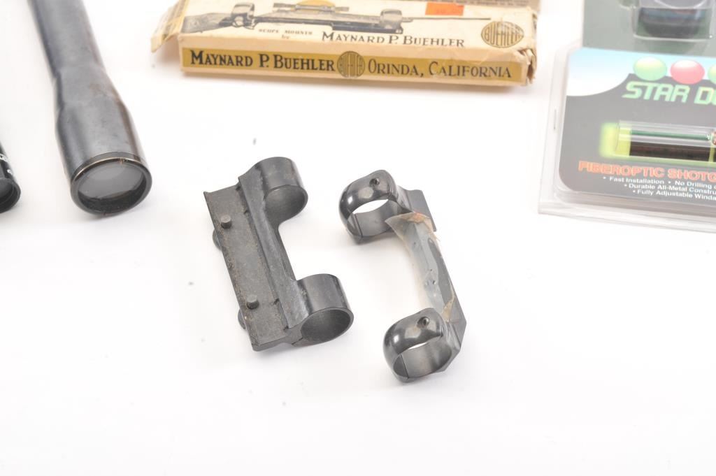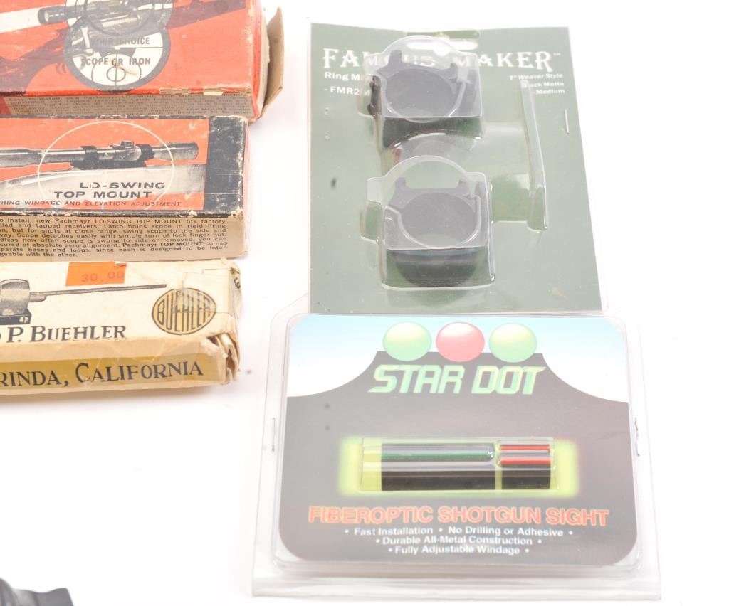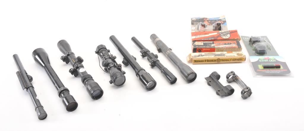 Bonanza lot of optics, mounts and rings. The lot includes seven rifle scopes by makers like Bausch & Lomb, Bushnell, Simmons and Weaver, among others. Additionally, three sets of Buehler and Pachmayr mounts, foursets of rings and a Star Dot Hi-Viz shotgun sight. A great lot for the gun show or sports man. Est.: $125-$250.