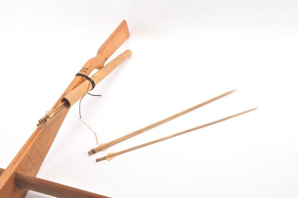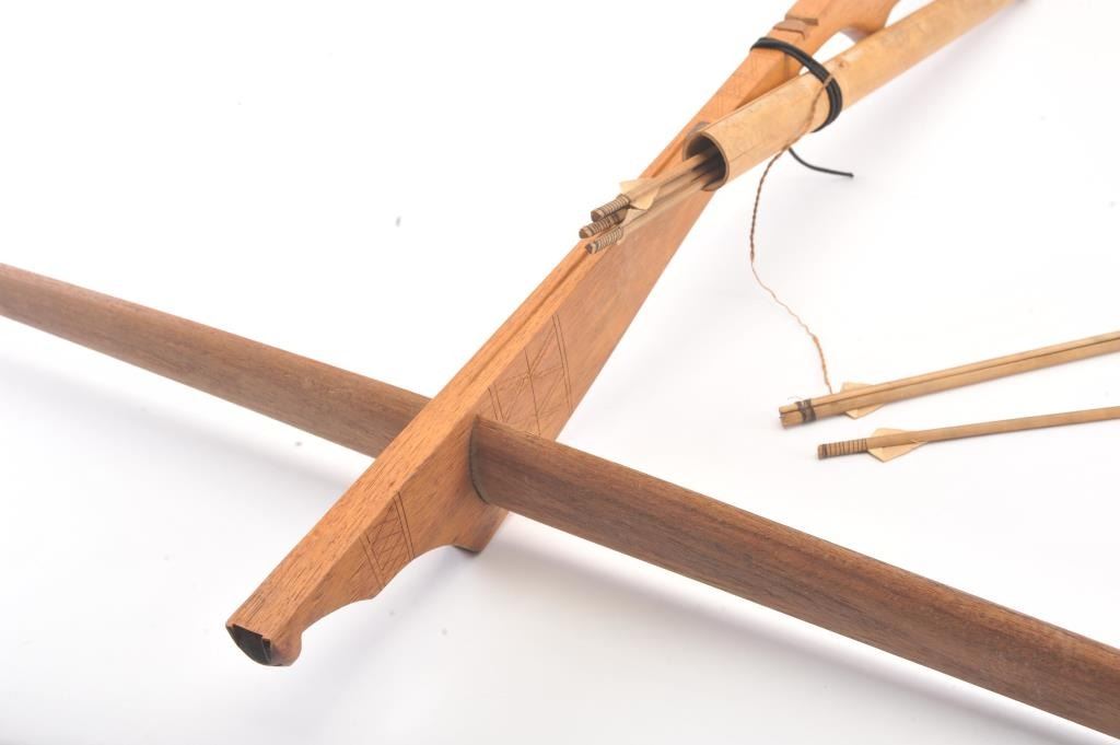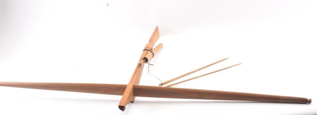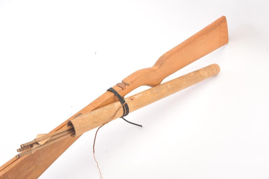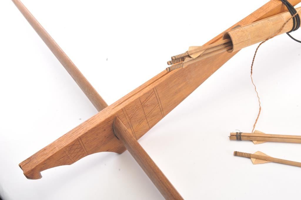Vietnam War Bring back handmade Vietnamese crossbow with bolts and quiver. The bow is 58 ½” long and 35” wide with no bow string. The bow is handmade from exotic wood with light carving. The quiver is bamboo withfive bolts all in good condition. Est.: $125-$250.