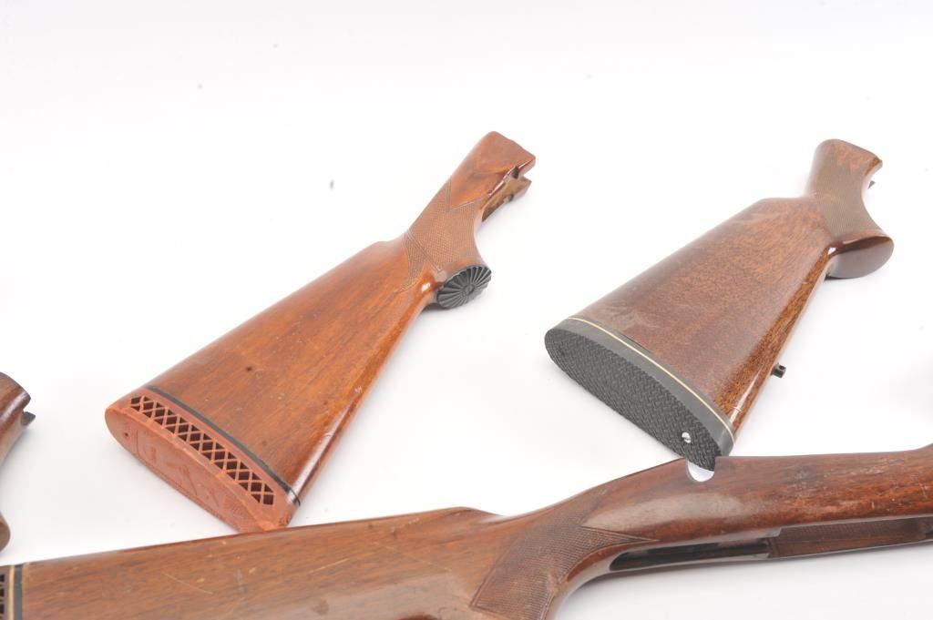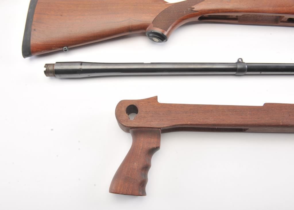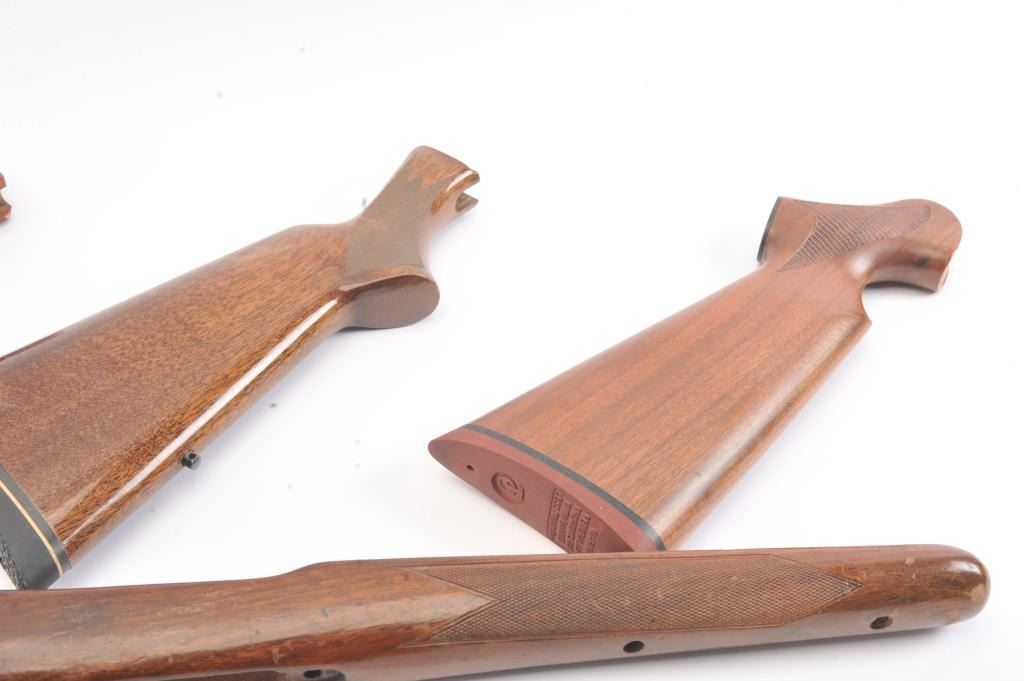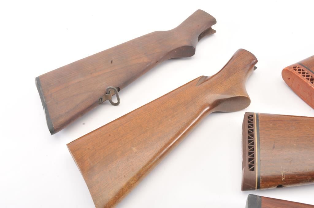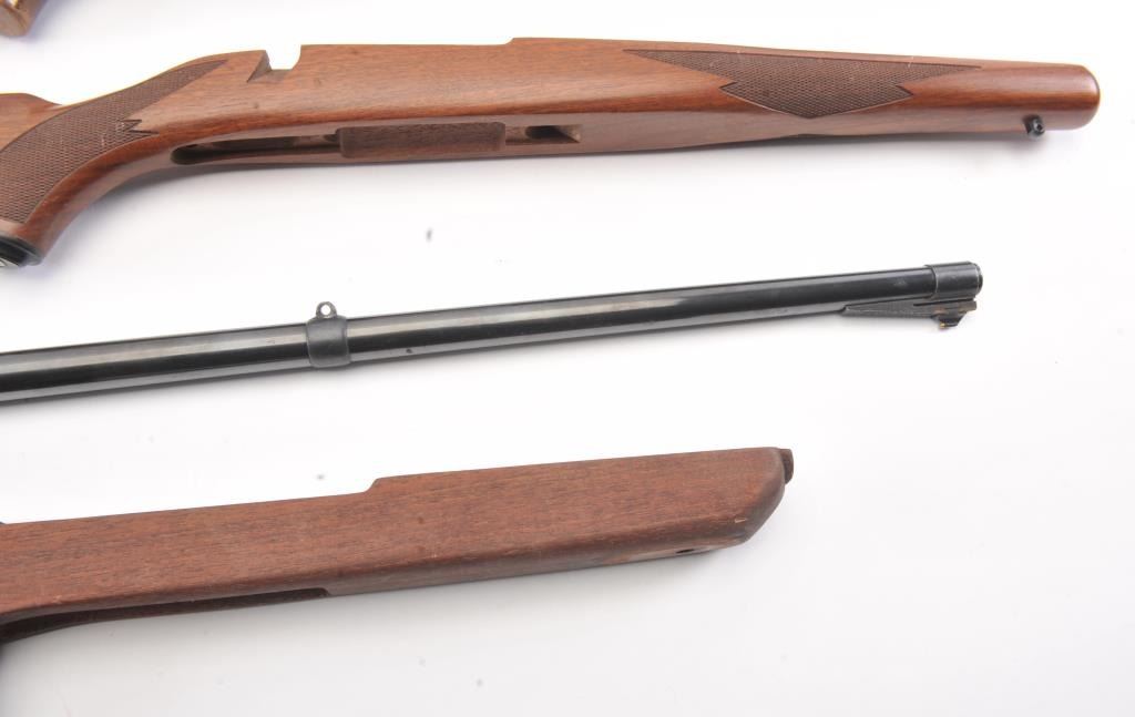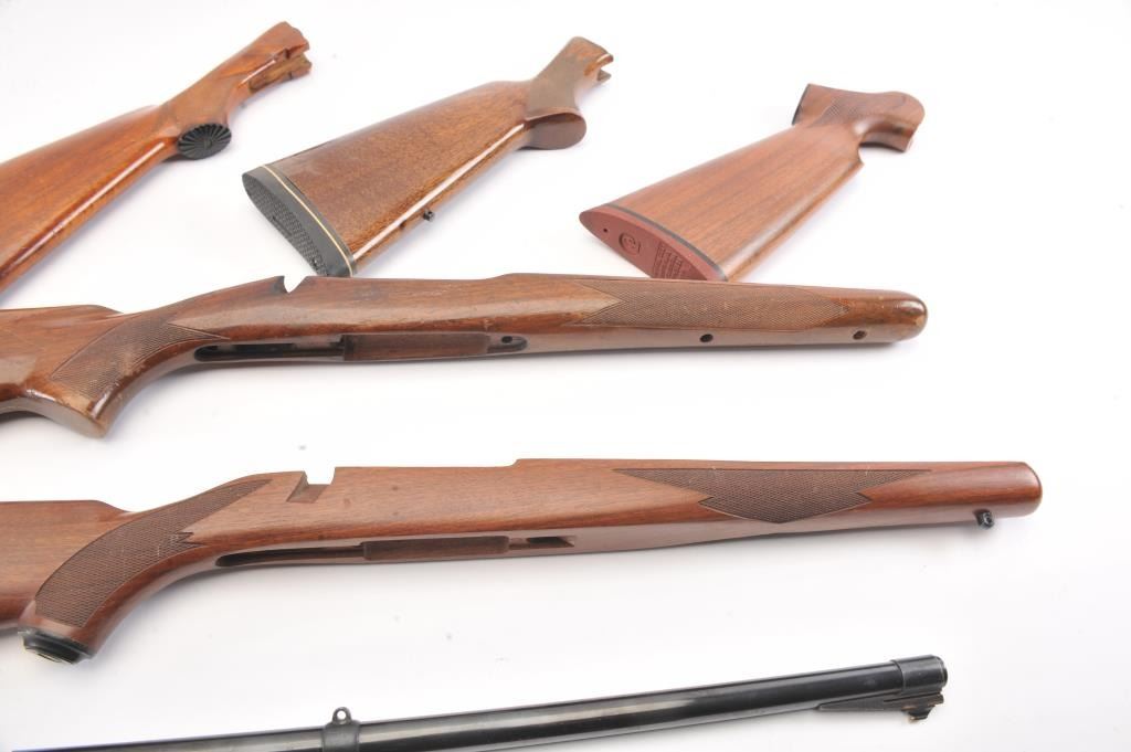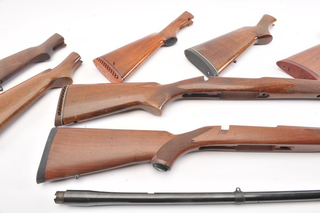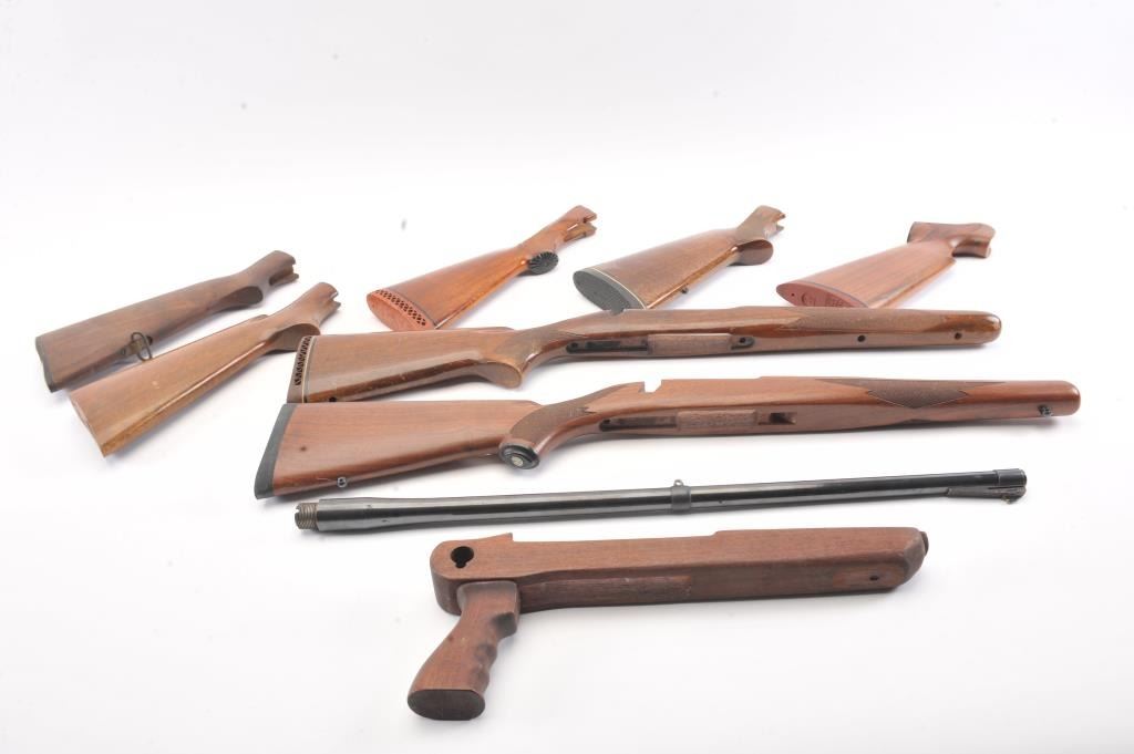Lot of rifle stocks, barrel and butt stocks. The lot includes two rifle stocks; a wood Pre-64 Winchester Model 70 in good condition and a Ruger Model 77 wood rifle stock in good condition as well. The lot also includesfour wood shotgun butt stocks including a Winchester Model 12 and Remington 870. The lot further includes two Thompson Center stocks and a 25” medium heavy rifle barrel with a banded blade front sight and goodbore. A great lot for the gunsmith. Est.: $200-$400.