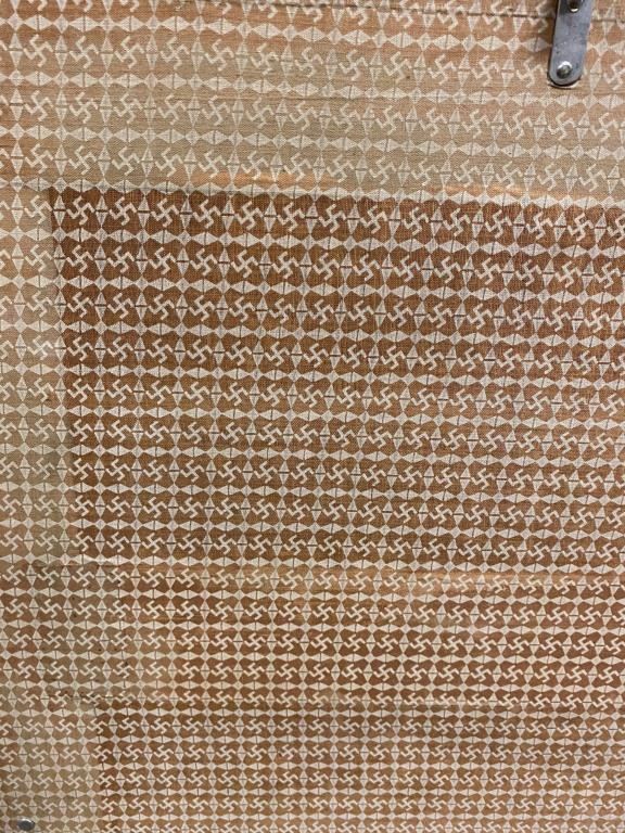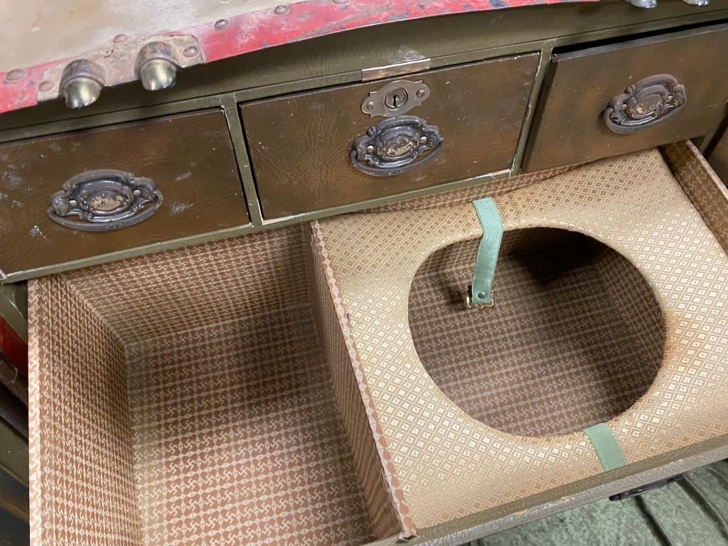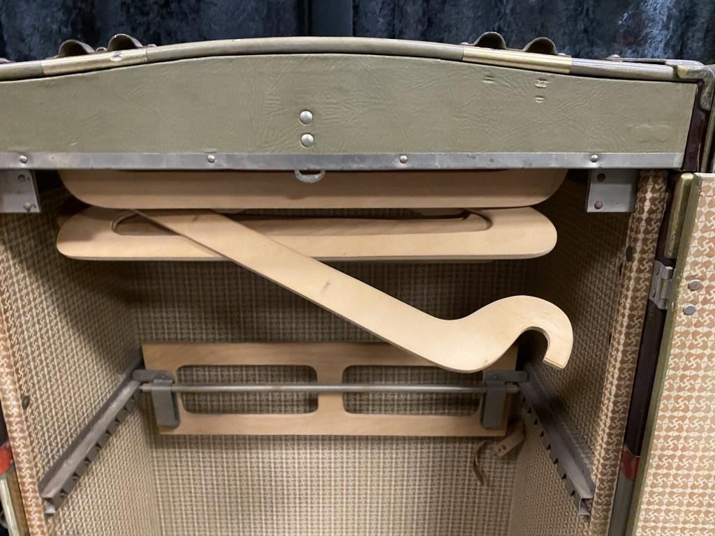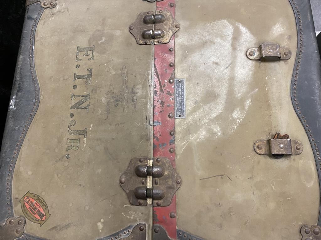 Great old “Steamer Trunk” with name plate “TAYLOR MADE”, C.A. Taylor Trunk Works, Chicago & New York. The trunk dates to the 1920’s-1940’S era with “E.T.N. JR” stenciled and a “SPAULDING” label as well. The trunkhas hard vulcanized trunk fiber, brass mountings and is missing the leather straps. The drawers and hanging device are intact. The trunk measures approximately 42” x 25” and is in good overall condition. Est.:$150-$300.