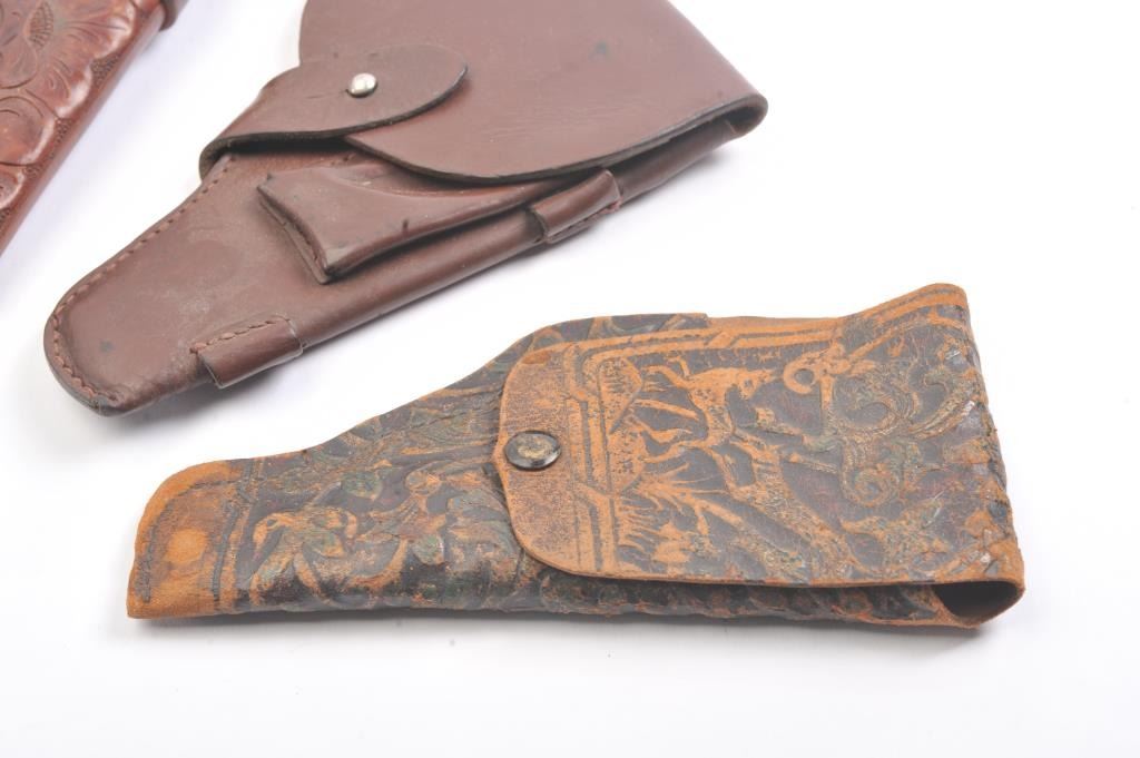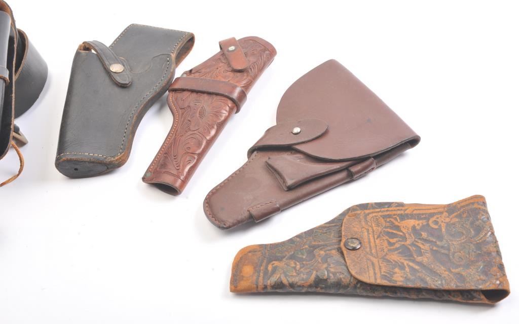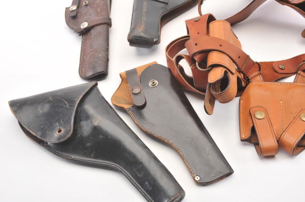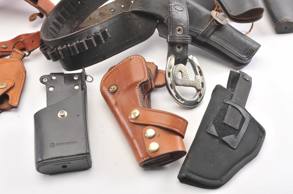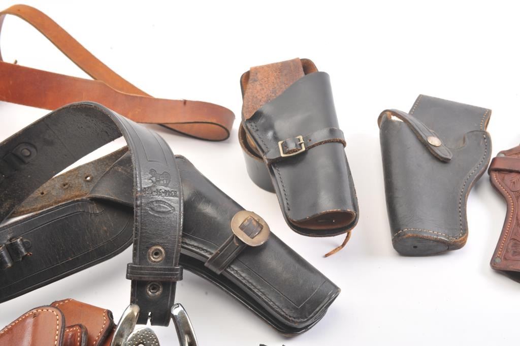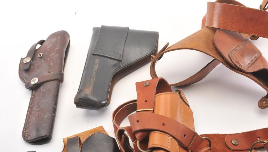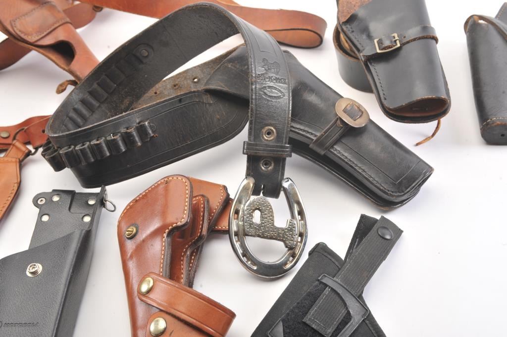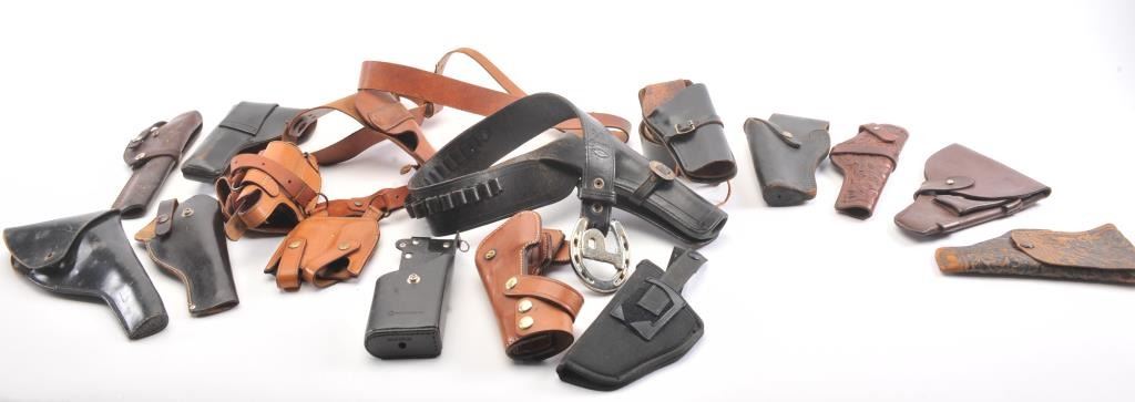 Bonanza lot of holsters and belts. The lot includes six leather snap holsters, mostly military style for both revolvers and autos. The lot additionally includes a nice 1930’s era leather flap holster, an antique handtooled small revolver holster, H.H. Heiser hand tooled leather holster for a small revolver, two leather shoulder rigs for auto pistols, a nylon belt holster and two cowboy six gun belts and holsters. Everything is in good to very good condition with fifteen holsters total. Est.: $150-$300.