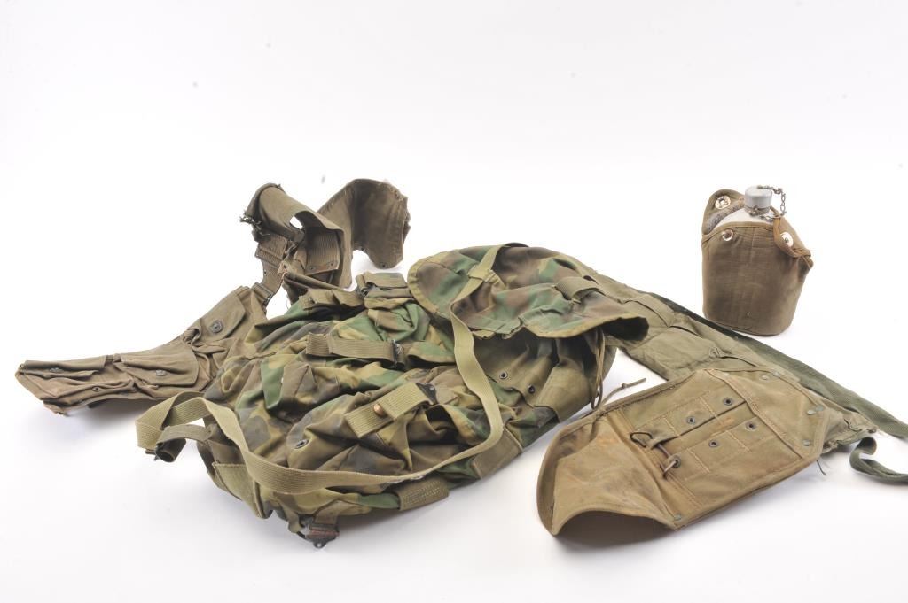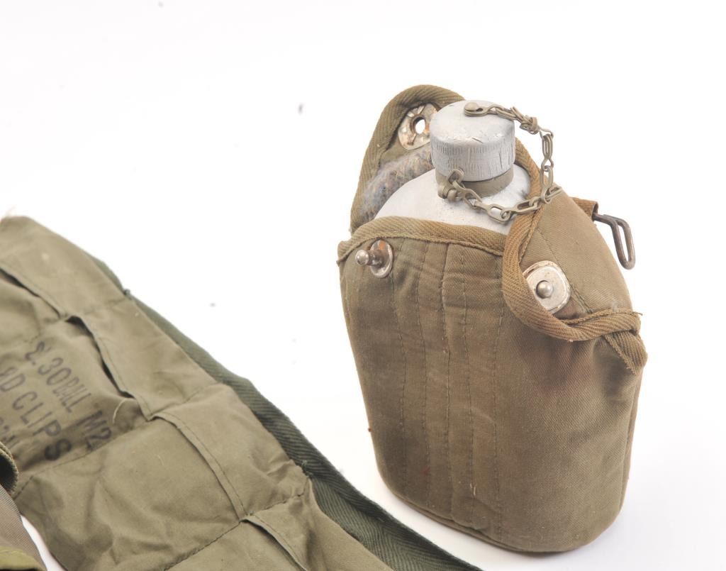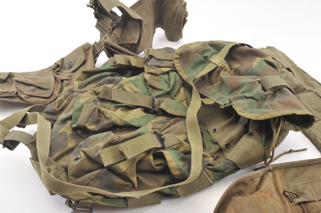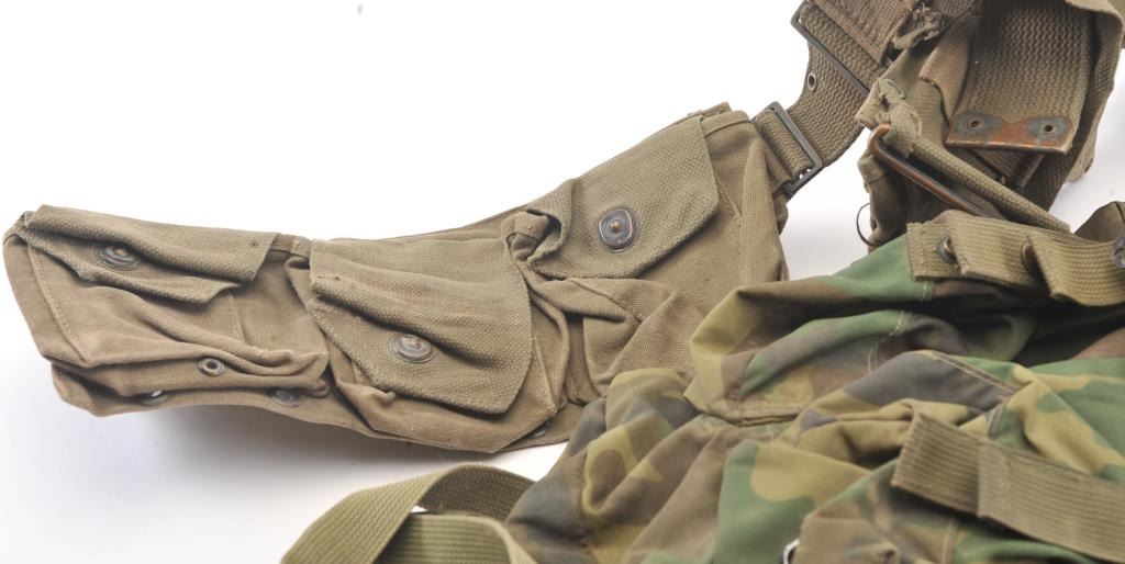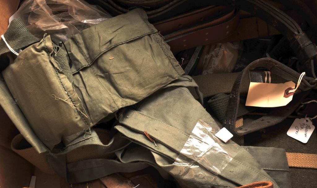 Lot of slings, ammo carriers, bandoleers and web gear. The lot includes: three Russia leather ammo carriers with oilers, two canteens, one British and one US, five canvas military slings from the US, British andRussian forces, two leather slings, assorted canvas ammo carriers, two cotton U.S. M1 Garand bandoleers with five 8 round clips and a camouflage military style pack. Additionally the lot includes a vintageleather military style rifle sling marked, “MILSC” and dated 1943 in good used condition. A great lot for the re-enactor, collector or gun show. Est.: $150-$300.