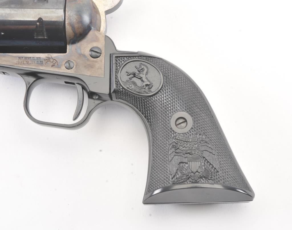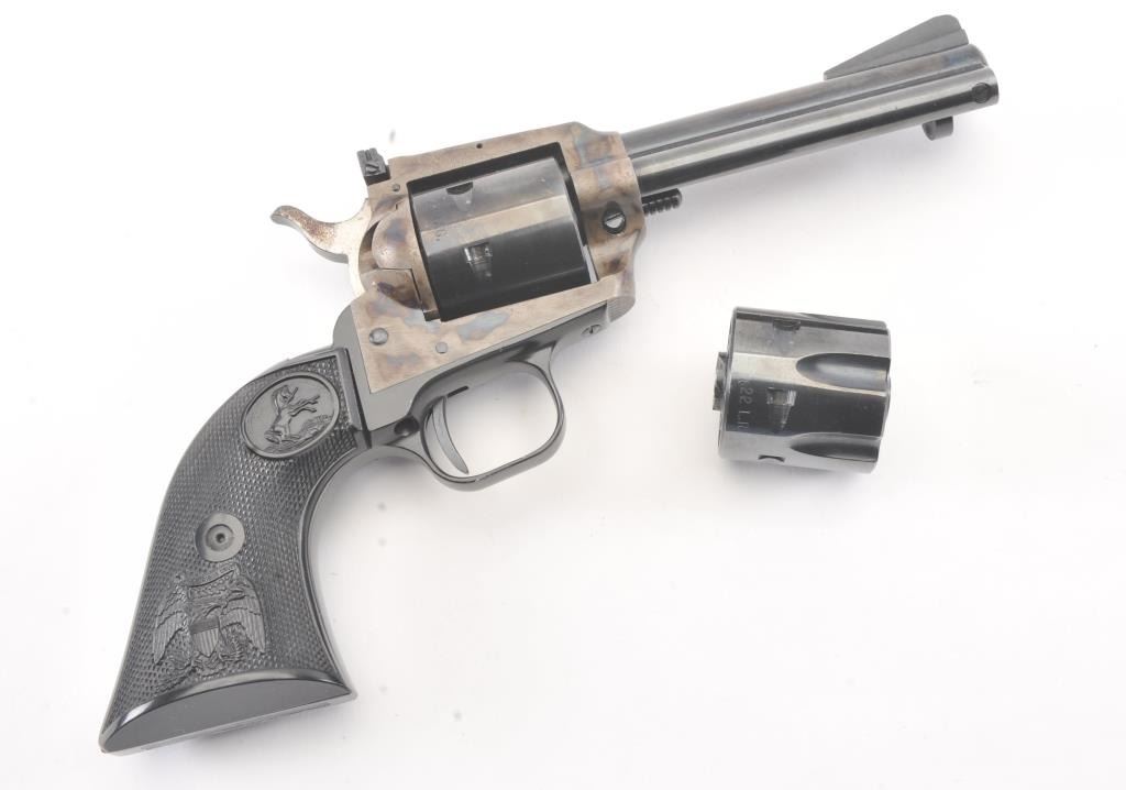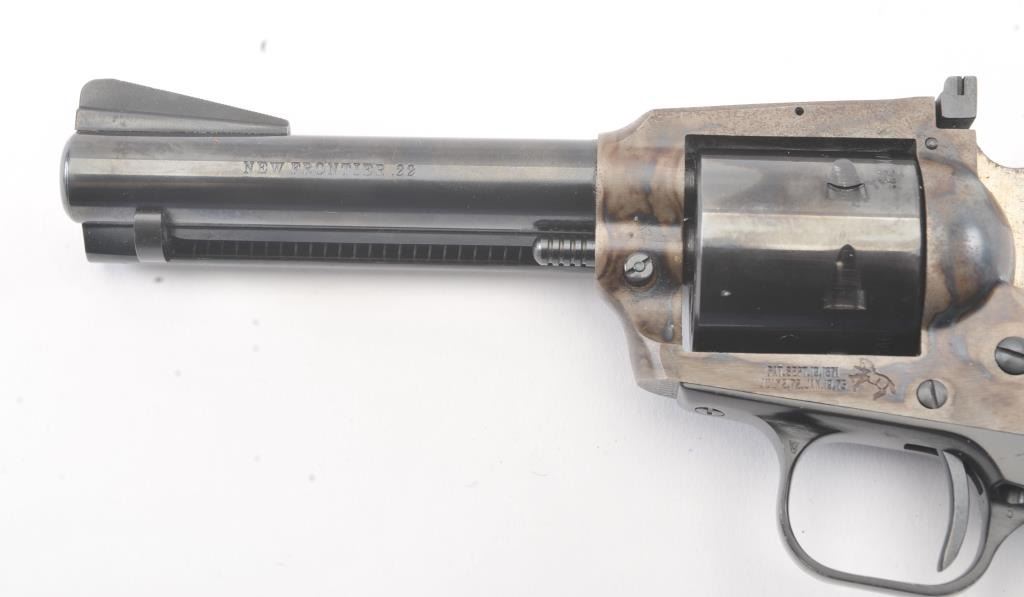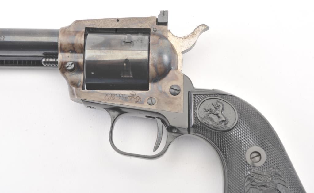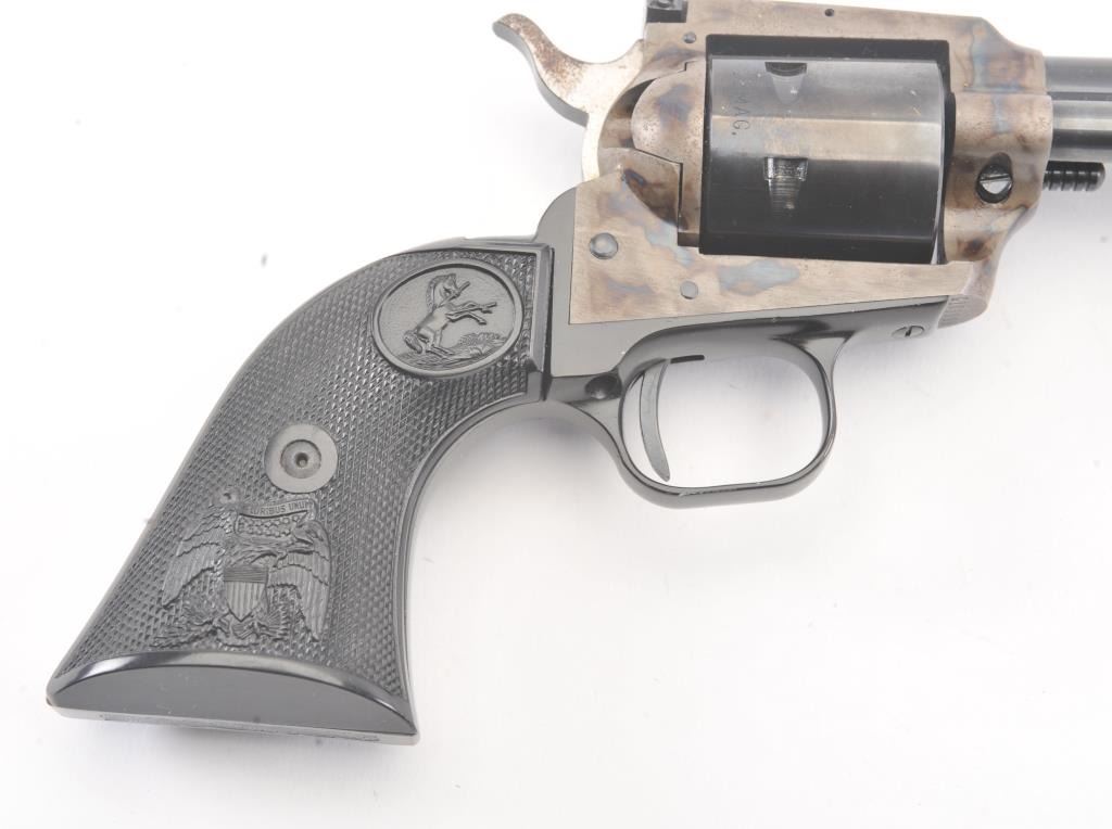 Colt New Frontier SA revolver, .22 Magnum caliber, Serial #G106096. The pistol is in excellent overall condition with a 4 ¾” barrel. The pistol retains approximately 98% of the blue finish with vivid case hardening on the frame. The checkered plastic eagle grips are in excellent condition showing little, if any use. The bore is good, the action is crisp and the markings are sharp. The lot includes an additional cylinderchambered in .22 Long Rifle caliber. Est.: $400-$800. (Modern/PPT).