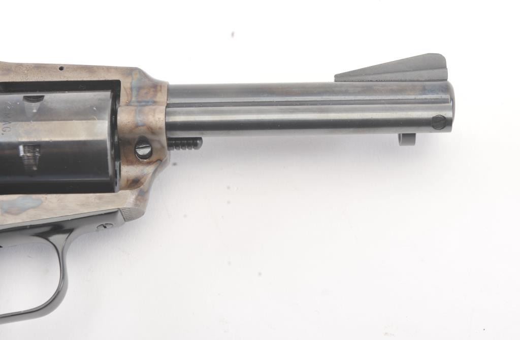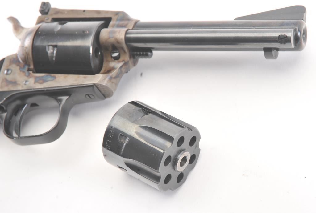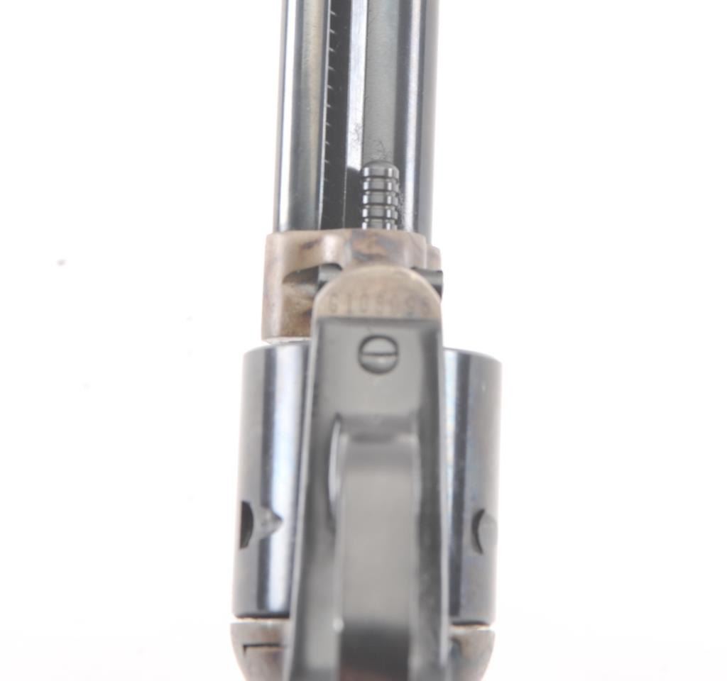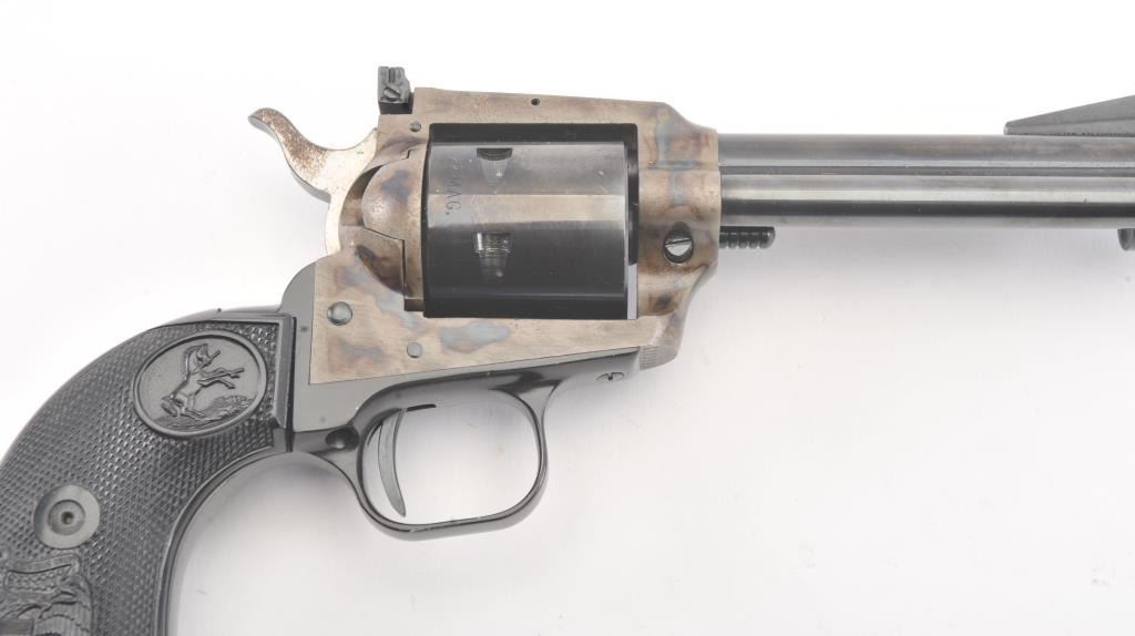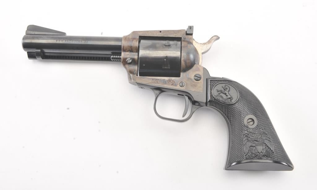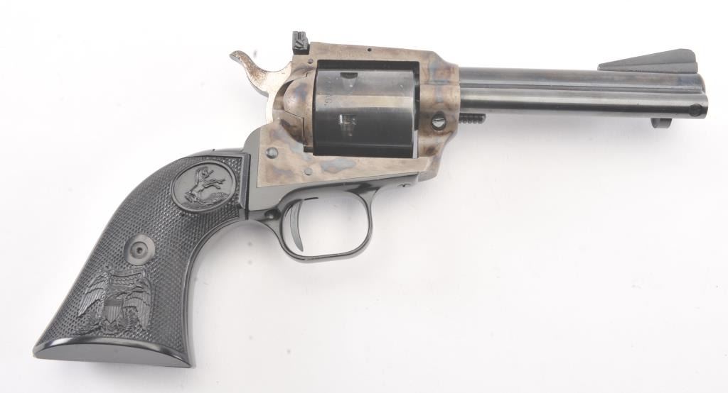 Colt New Frontier SA revolver, .22 Magnum caliber, Serial #G106096. The pistol is in excellent overall condition with a 4 ¾” barrel. The pistol retains approximately 98% of the blue finish with vivid case hardening on the frame. The checkered plastic eagle grips are in excellent condition showing little, if any use. The bore is good, the action is crisp and the markings are sharp. The lot includes an additional cylinderchambered in .22 Long Rifle caliber. Est.: $400-$800. (Modern/PPT).