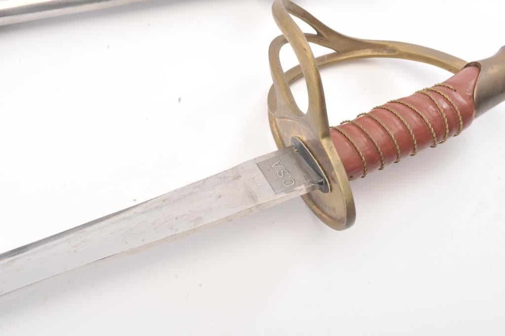 Reproduction Confederate Cavalry saber etched “C.S.A.” with scabbard. Est.: $100-$200