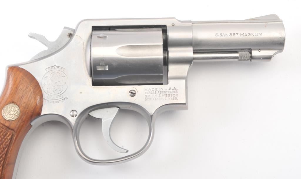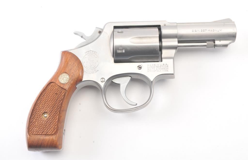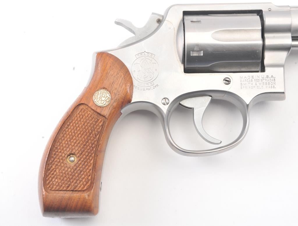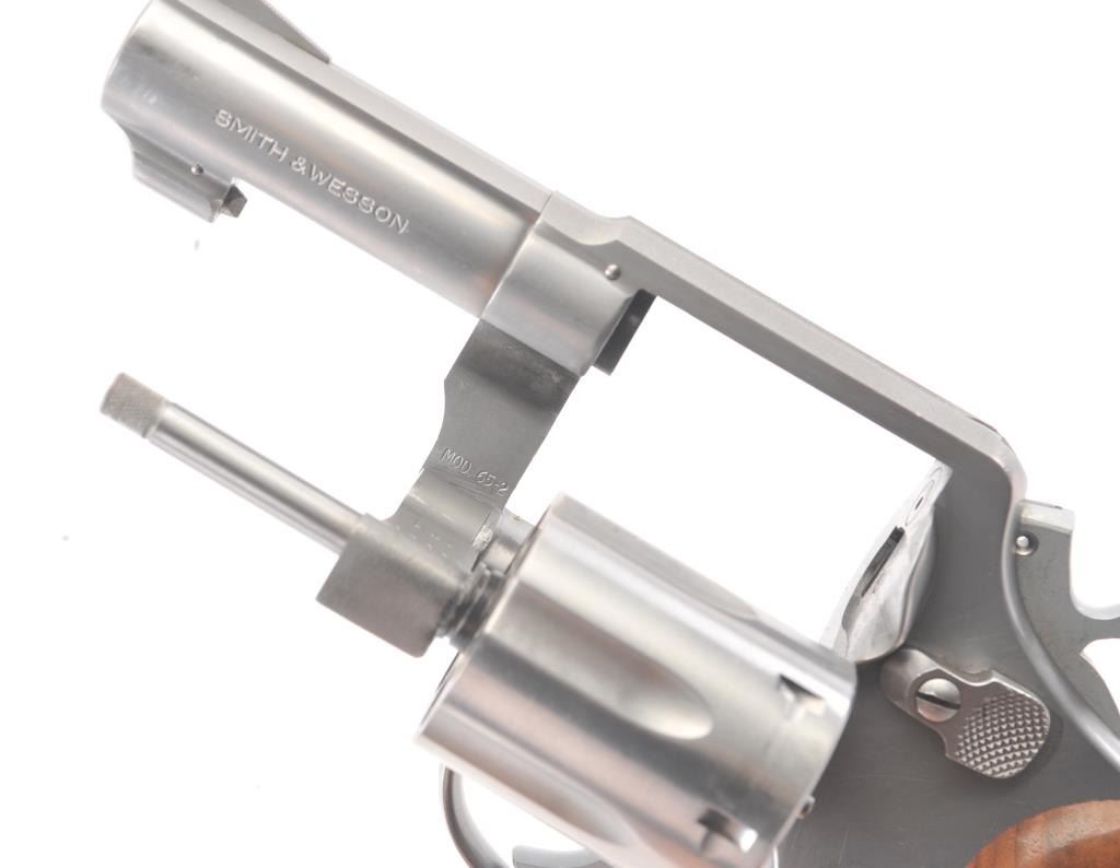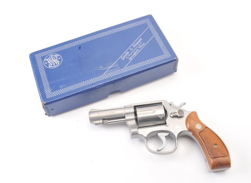 Smith & Wesson Model 65-2 DA revolver, .357 Magnum caliber, Serial #7D51453. The pistol is as new in the factory cardboard box with a 3” barrel. The pistol retains approximately 98%-99% of the stainless steel finish withlight wear at the muzzle and a faint drag line on the cylinder. The checkered wood medallion grips are in excellent condition showing little use. The lot includes the blue factory cardboard box withal associatedpackaging materials and matching end label. Est.: $400-$800. (Modern/PPT).