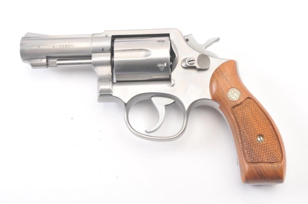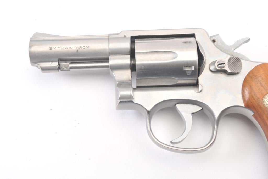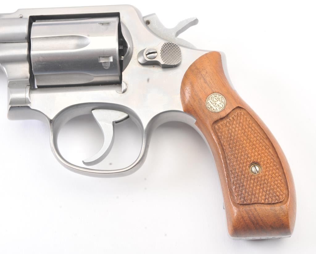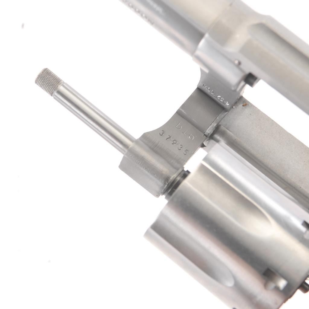 Smith & Wesson Model 65-2 DA revolver, .357 Magnum caliber, Serial #7D51453. The pistol is as new in the factory cardboard box with a 3” barrel. The pistol retains approximately 98%-99% of the stainless steel finish withlight wear at the muzzle and a faint drag line on the cylinder. The checkered wood medallion grips are in excellent condition showing little use. The lot includes the blue factory cardboard box withal associatedpackaging materials and matching end label. Est.: $400-$800. (Modern/PPT).
