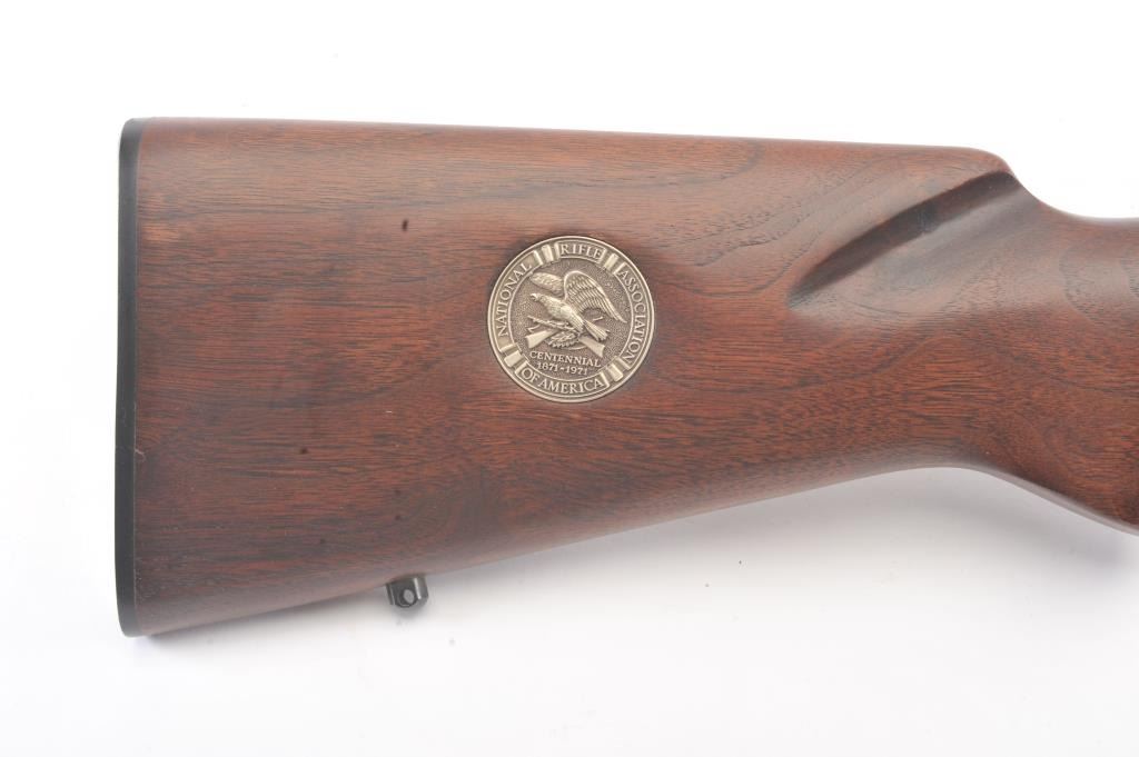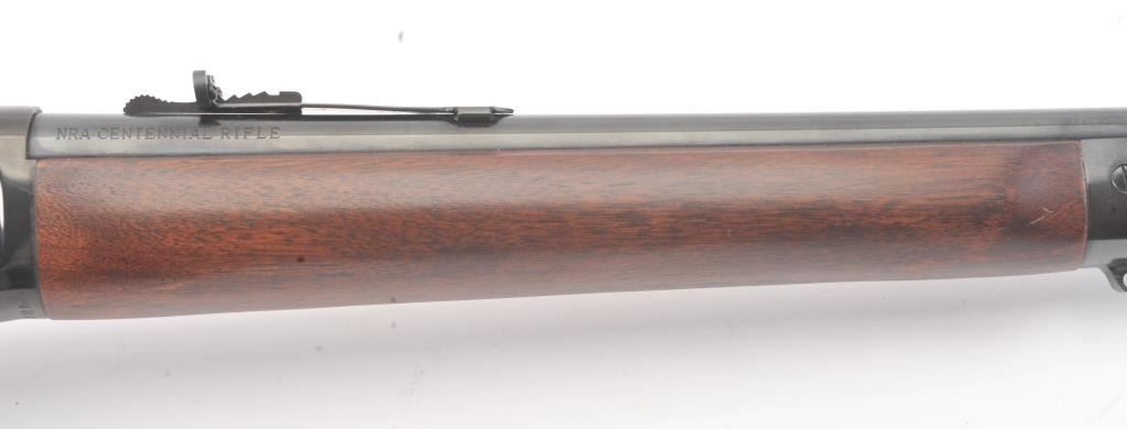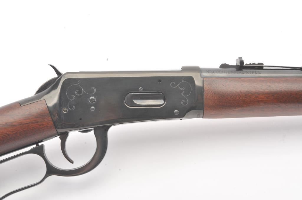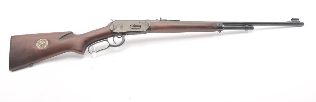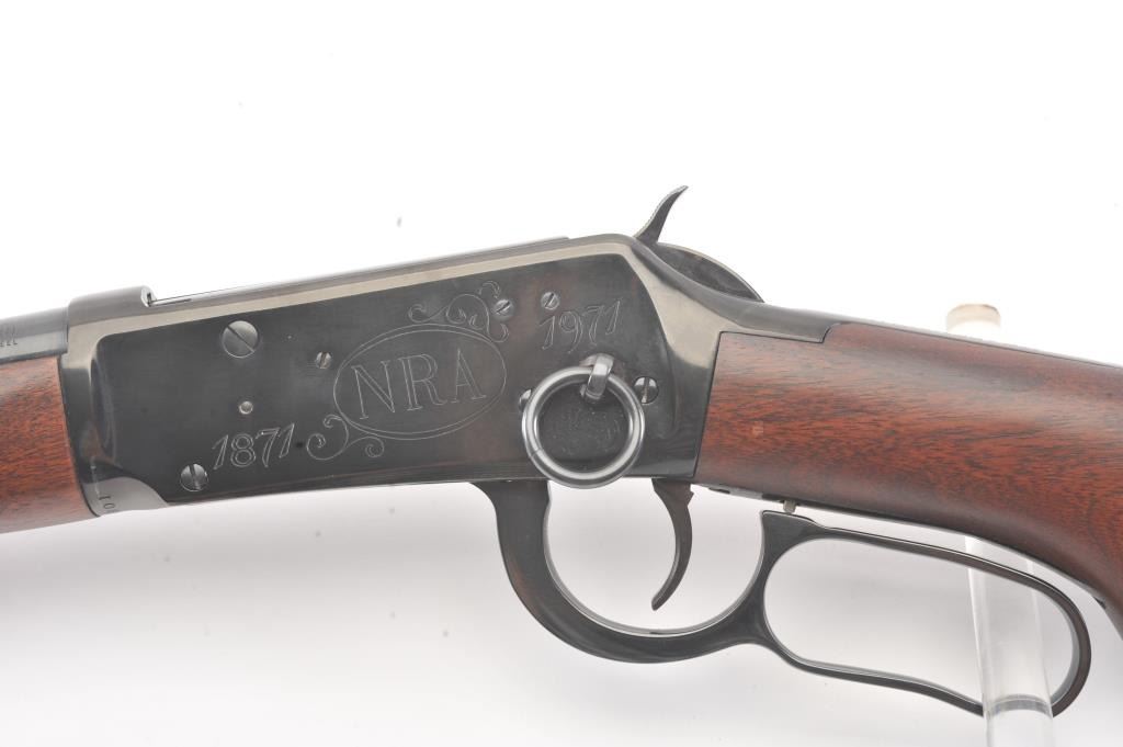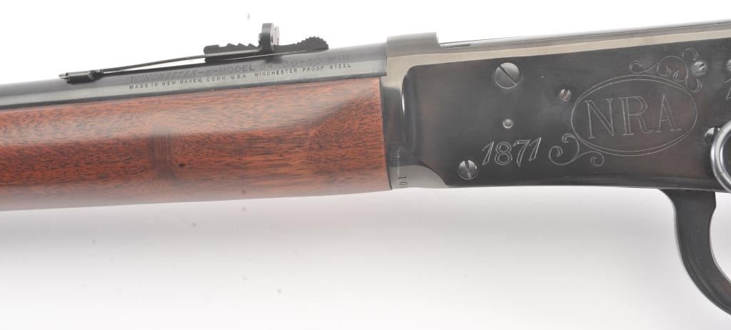 Winchester Model 1894 NRA Centennial lever action saddle ring rifle, .30-30 caliber, Serial #NRA 9801. The rifle is in nearly excellent overall condition with a 24” round barrel and half magazine. The rifle retainsnearly all of the blue finish with the saddle ring retained. The receiver is engraved with NRA and 1871-1971 in honor of the centennial. The smooth wood pistol grip gunstock is in excellent condition with anNRA medallion in the right butt stock. The bore is good, the action is crisp and the markings are sharp. The lot includes the factory cardboard box with all associated packaging materials. Est.: $400-$800.(Modern).