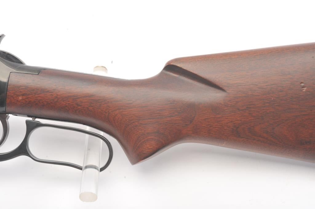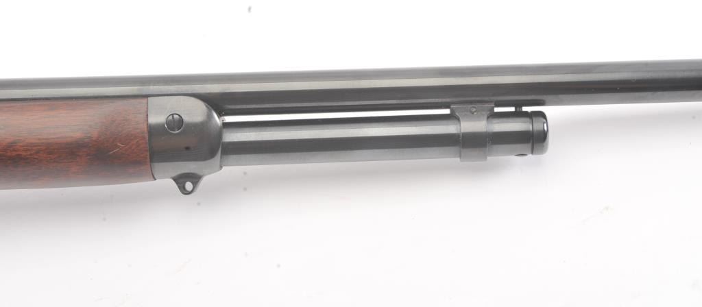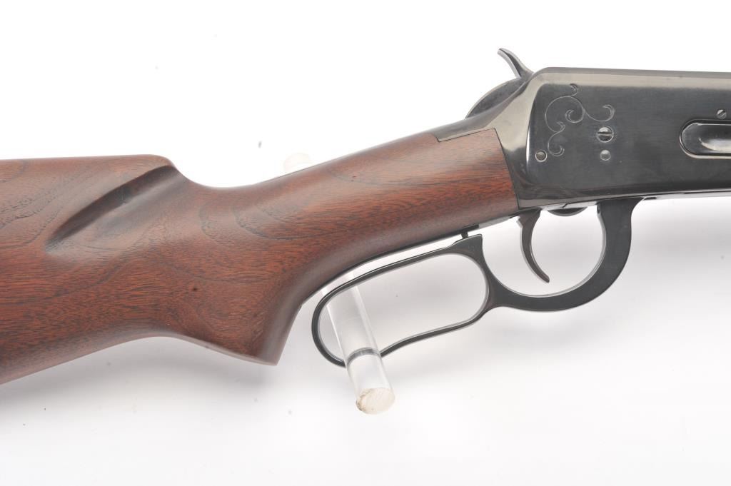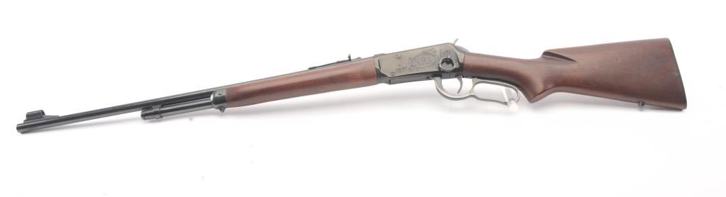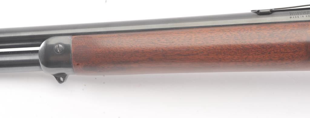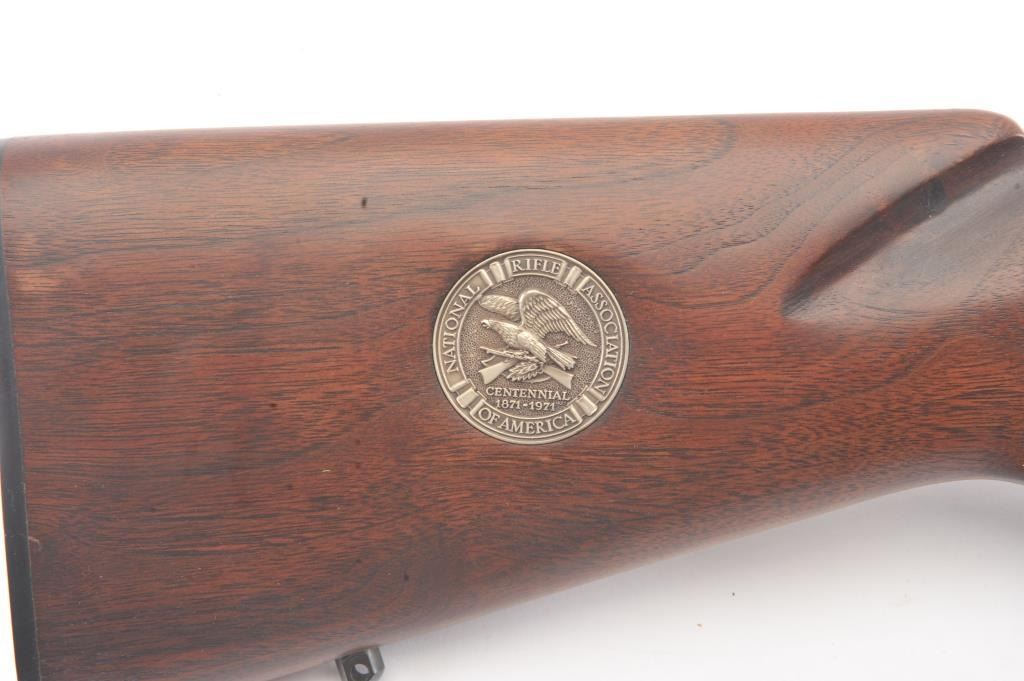 Winchester Model 1894 NRA Centennial lever action saddle ring rifle, .30-30 caliber, Serial #NRA 9801. The rifle is in nearly excellent overall condition with a 24” round barrel and half magazine. The rifle retainsnearly all of the blue finish with the saddle ring retained. The receiver is engraved with NRA and 1871-1971 in honor of the centennial. The smooth wood pistol grip gunstock is in excellent condition with anNRA medallion in the right butt stock. The bore is good, the action is crisp and the markings are sharp. The lot includes the factory cardboard box with all associated packaging materials. Est.: $400-$800.(Modern).