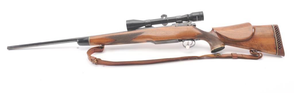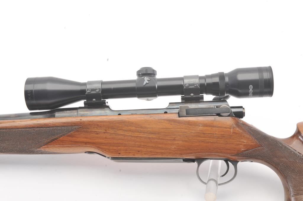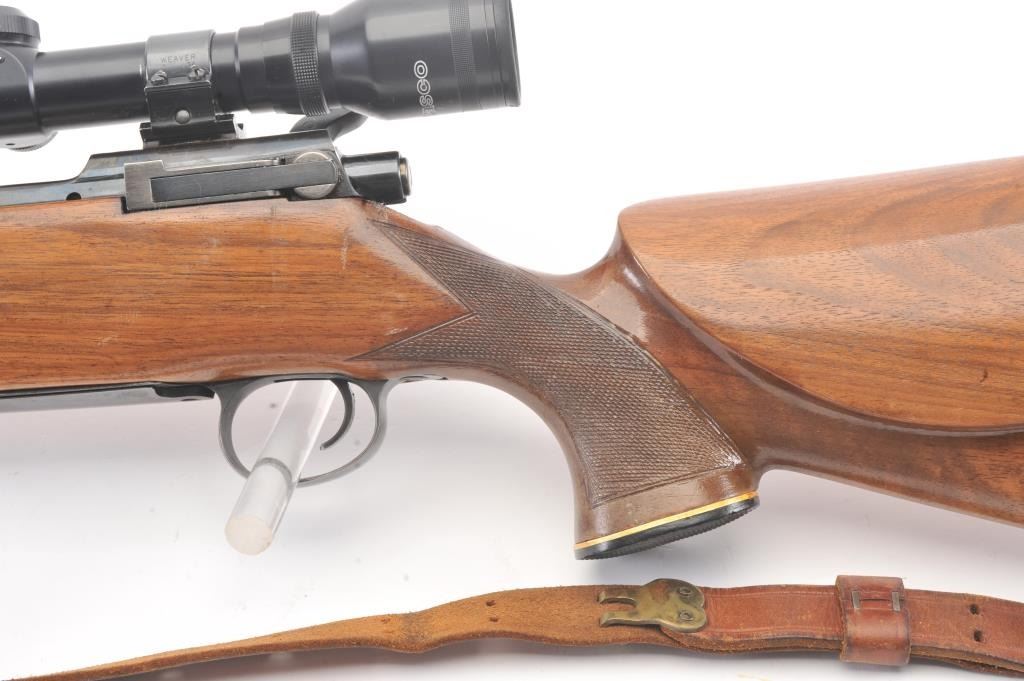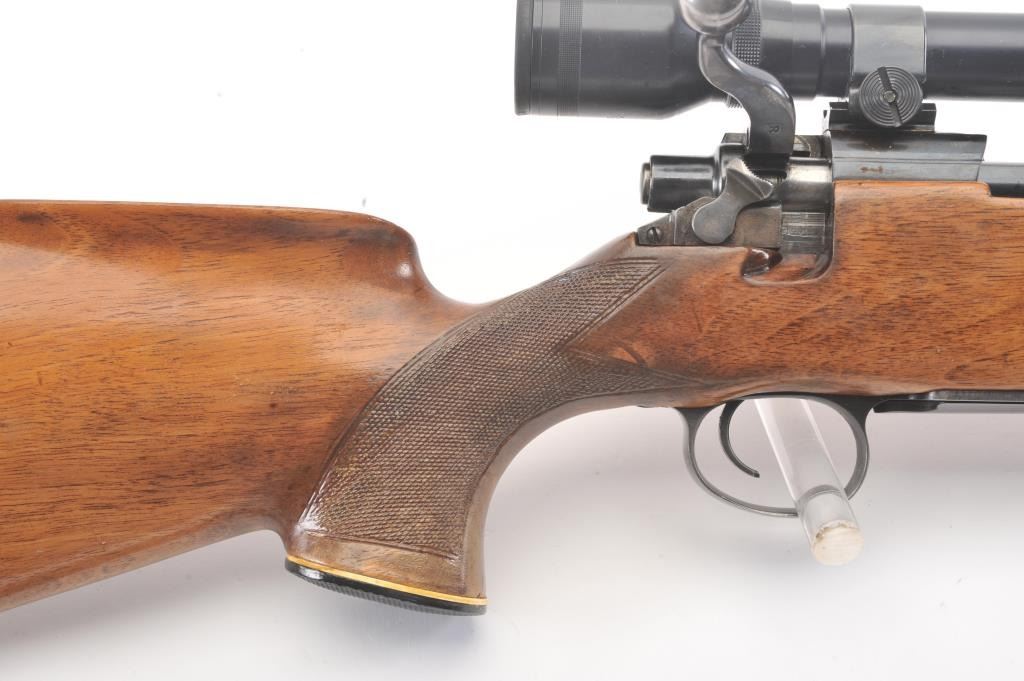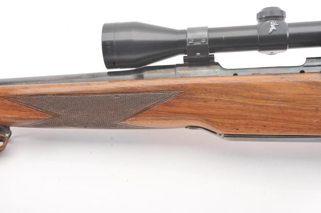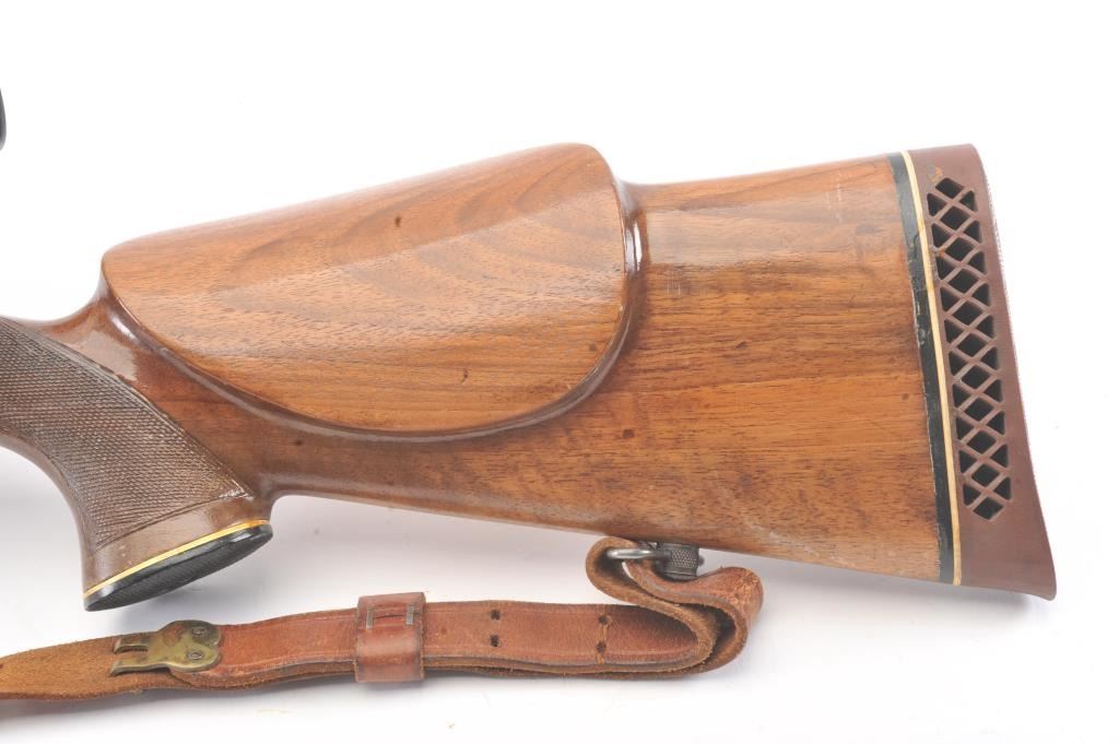 Custom Model 1917 bolt action rifle, .30 caliber, Serial #NSNV. The rifle is in very good overall condition with a 24” barrel. The rifle retains a significant amount of blue finish with flaming bomb emblems andproofs. The custom checkered wood stock is in good condition with an ebony fore end cap and pistol grip. The butt stock has an exaggerated rollover cheek piece and ends with a ventilated rubber recoil pad, slingswivels and period leather sling. The rifle is topped with a Tasco 6 x 40 fixed power scope. The bore is good, the action is crisp and the markings are legible. Est.: $300-$600. (C+R).