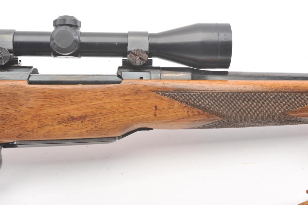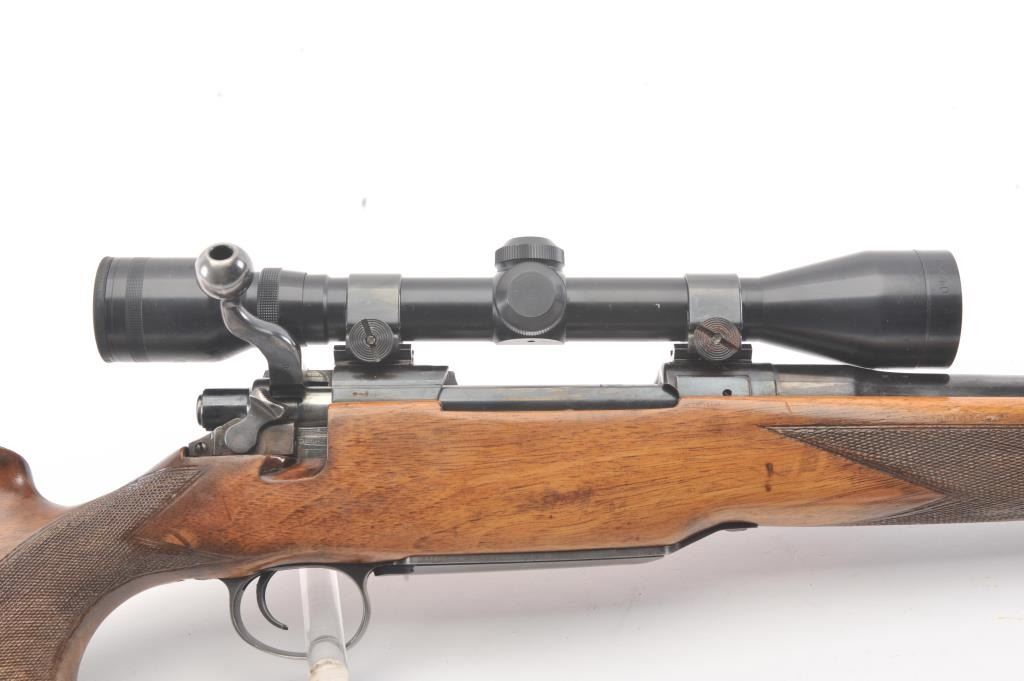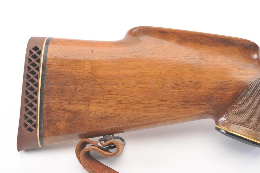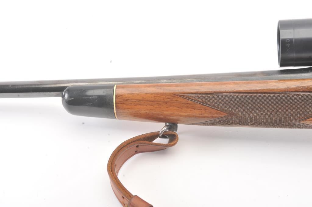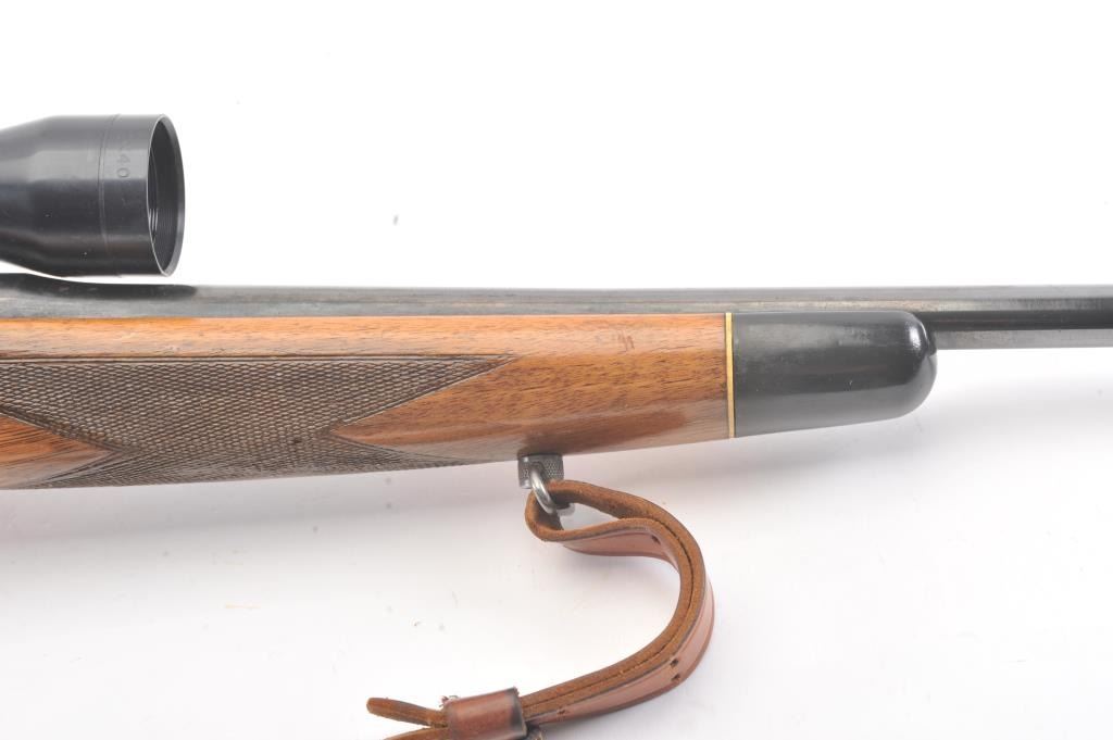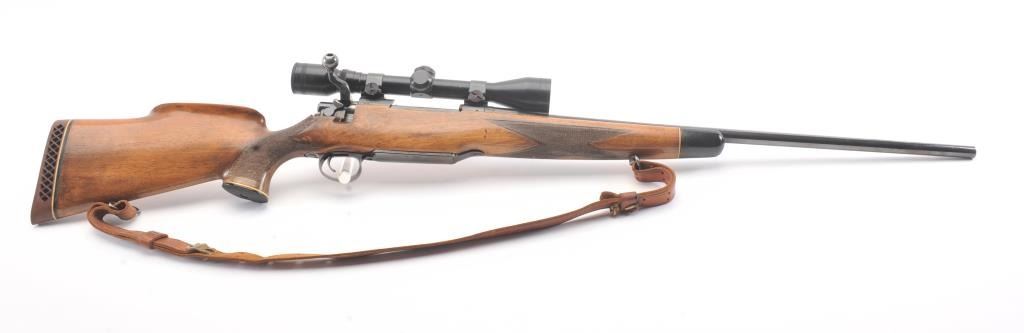 Custom Model 1917 bolt action rifle, .30 caliber, Serial #NSNV. The rifle is in very good overall condition with a 24” barrel. The rifle retains a significant amount of blue finish with flaming bomb emblems andproofs. The custom checkered wood stock is in good condition with an ebony fore end cap and pistol grip. The butt stock has an exaggerated rollover cheek piece and ends with a ventilated rubber recoil pad, slingswivels and period leather sling. The rifle is topped with a Tasco 6 x 40 fixed power scope. The bore is good, the action is crisp and the markings are legible. Est.: $300-$600. (C+R).