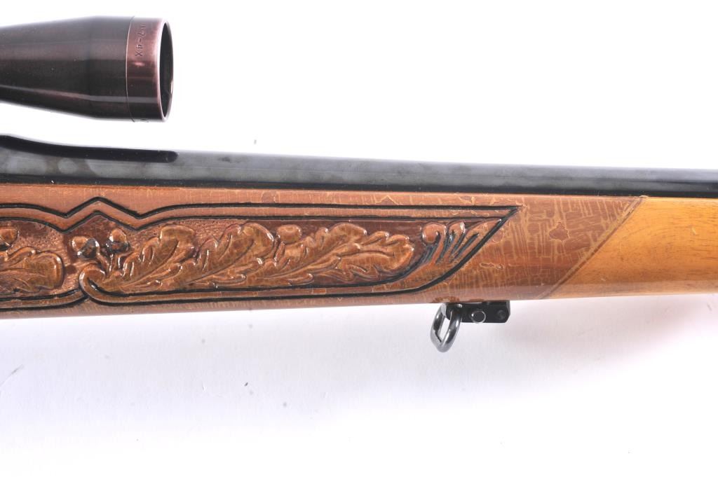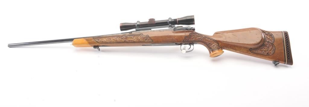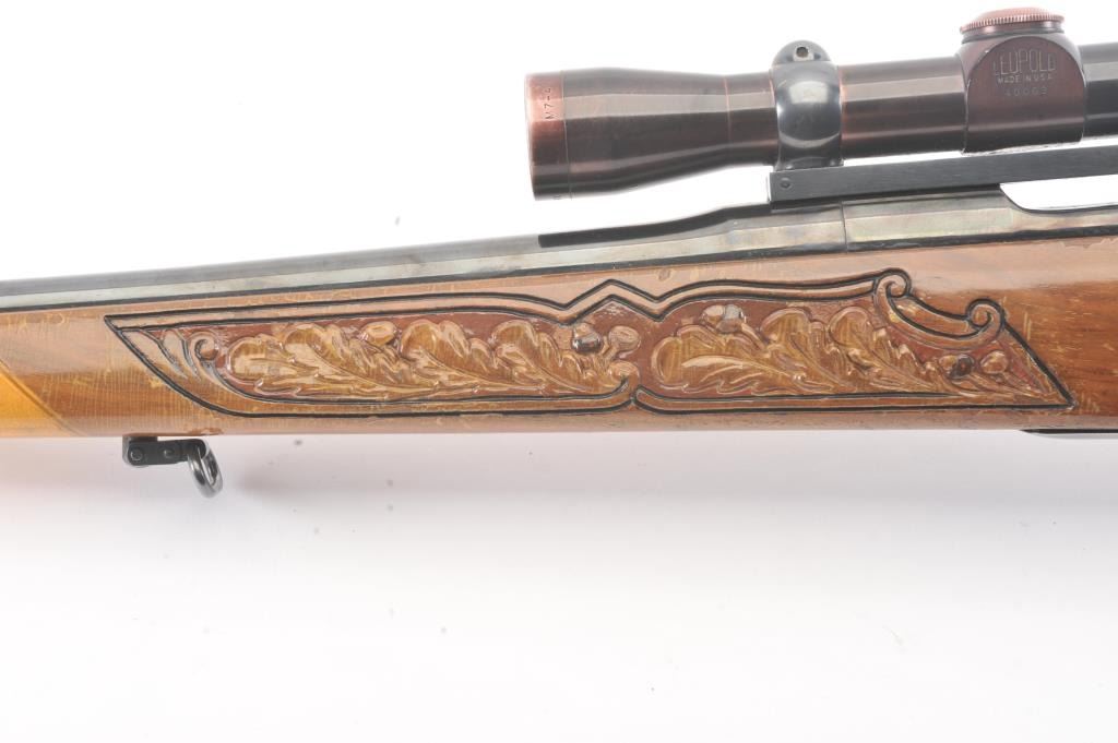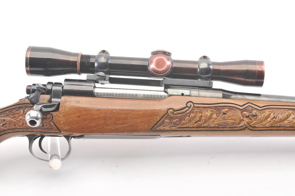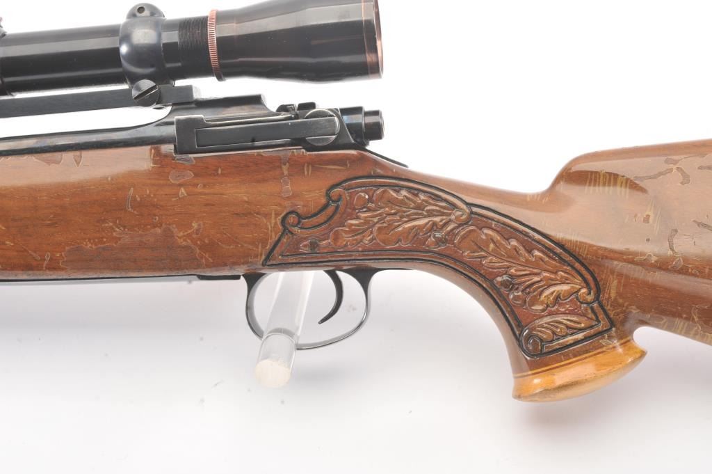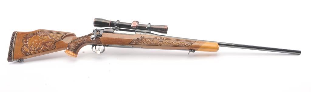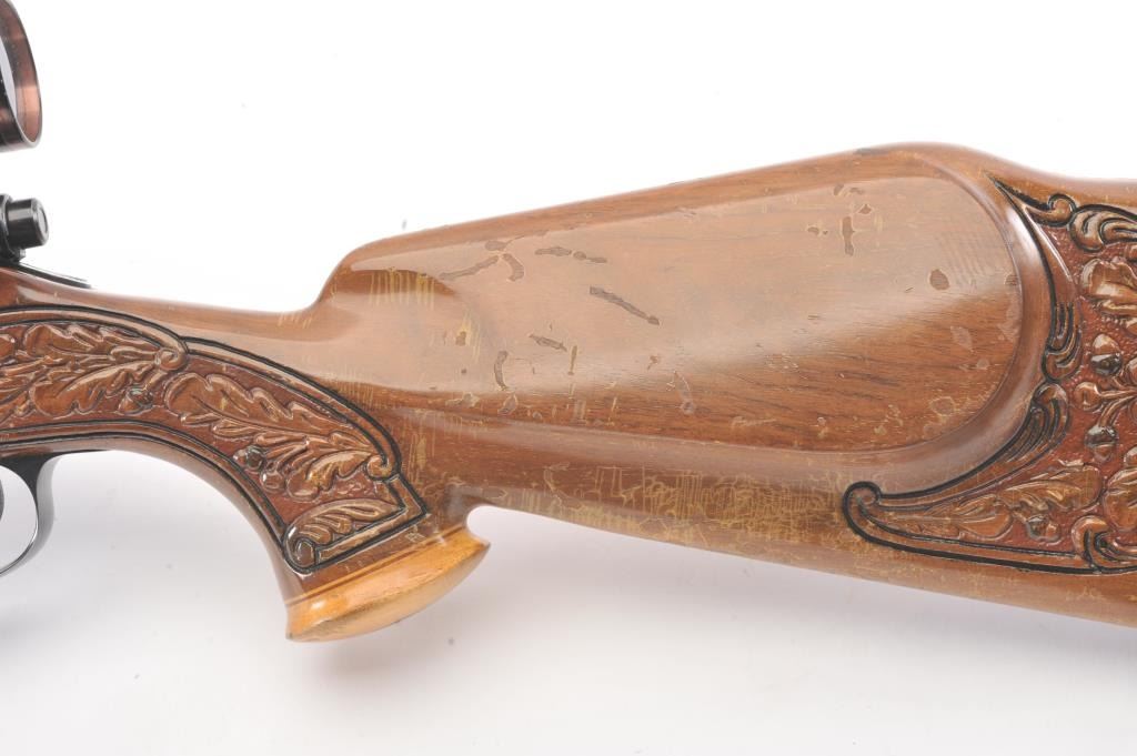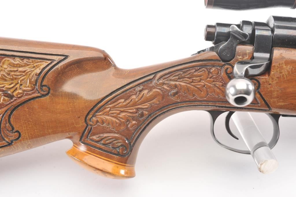 Custom Model 1917 Enfield bolt action sporting rifle, .30-06 caliber, Serial #NSNV. The rifle is in very good overall condition with a 24” barrel. The rifle retains the majority of the blue finish with a jeweledbolt and follower. The custom hand carved wood stock is in good condition with an exotic wood fore end cap, pistol grip and detailed carvings oak leaves, acorns and a stag. The bore is fair, the action is crispand the markings are legible. The rifle is topped with a Buehler one-piece mount and a Leupold M7-4X fixed power scope. Est.: $300-$600. (C+R).