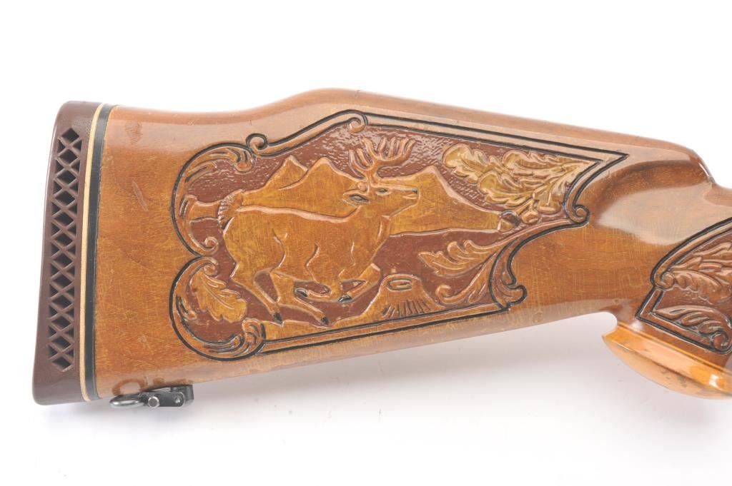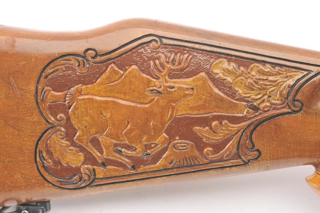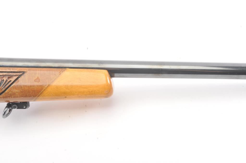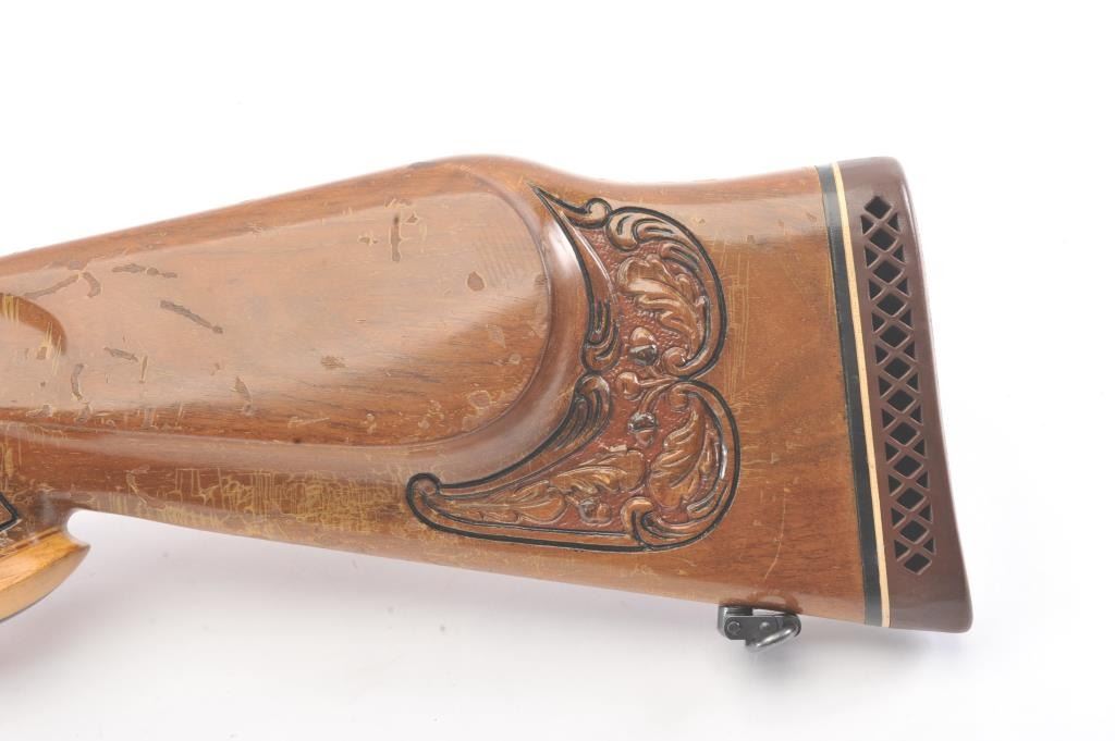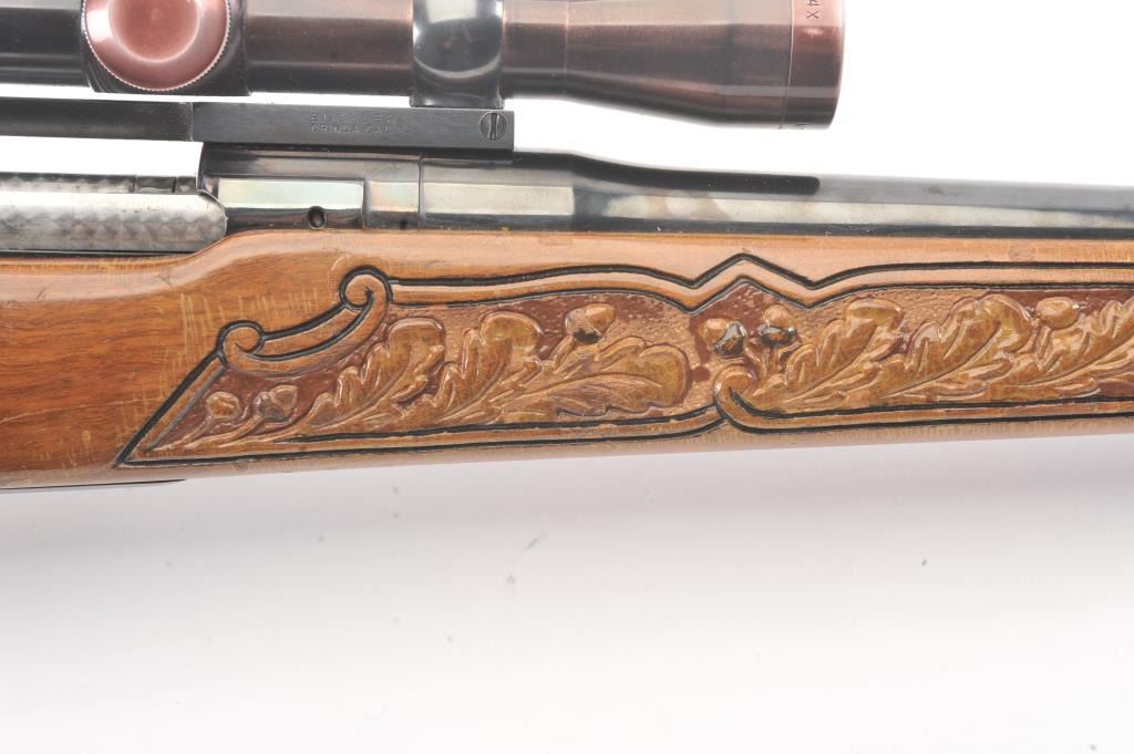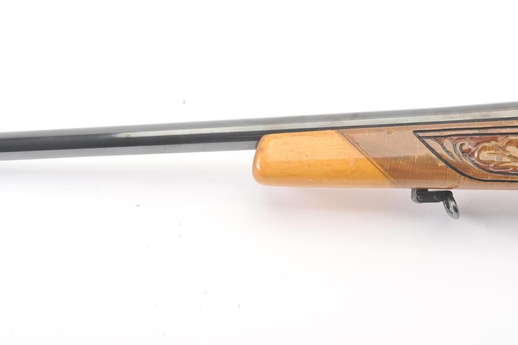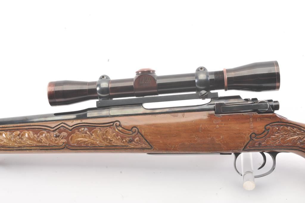 Custom Model 1917 Enfield bolt action sporting rifle, .30-06 caliber, Serial #NSNV. The rifle is in very good overall condition with a 24” barrel. The rifle retains the majority of the blue finish with a jeweledbolt and follower. The custom hand carved wood stock is in good condition with an exotic wood fore end cap, pistol grip and detailed carvings oak leaves, acorns and a stag. The bore is fair, the action is crispand the markings are legible. The rifle is topped with a Buehler one-piece mount and a Leupold M7-4X fixed power scope. Est.: $300-$600. (C+R).