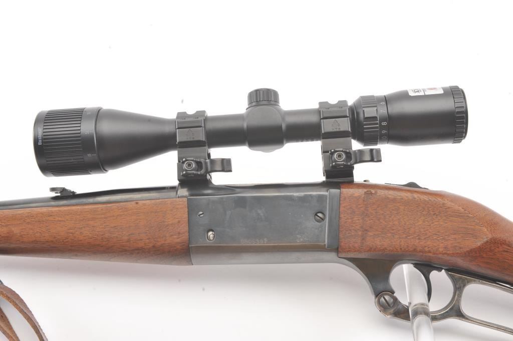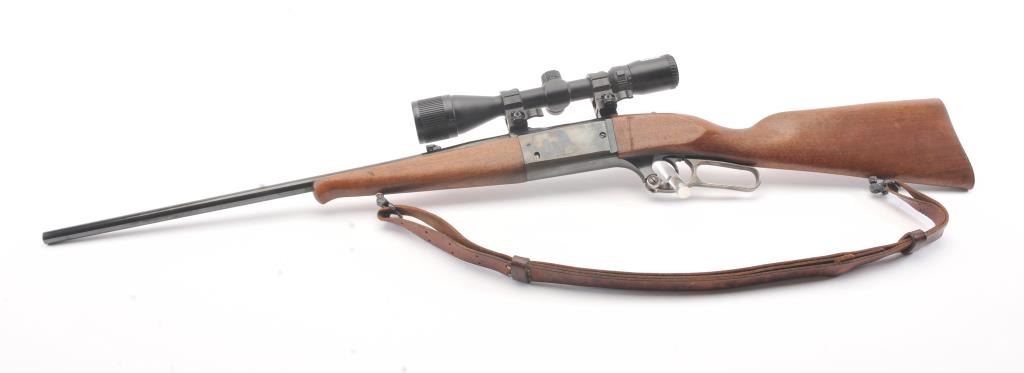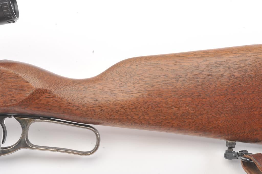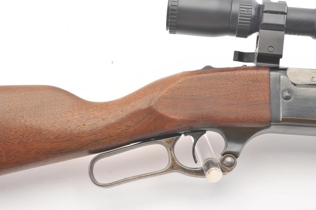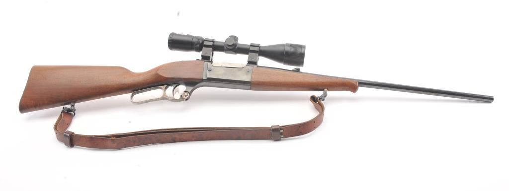 Savage Model 99A lever action rifle, .308 Winchester caliber, Serial #D505397. The rifle is in fine overall condition with a 22” barrel. The metal surfaces retain nearly all of the blue finish with the front sightremoved and a folding rear sight. The smooth wood stock is in very good condition with a Schnabel fore end showing little use. The bore is good, the action is crisp and the markings are sharp on this desirable Model99. The rifle is topped with a Bushnell Trophy XLT 4 x 12 Variable Power scope with an adjustable objective. The lot includes sling swivels and a period leather rifle sling. Est.: $300-$600. (Modern).