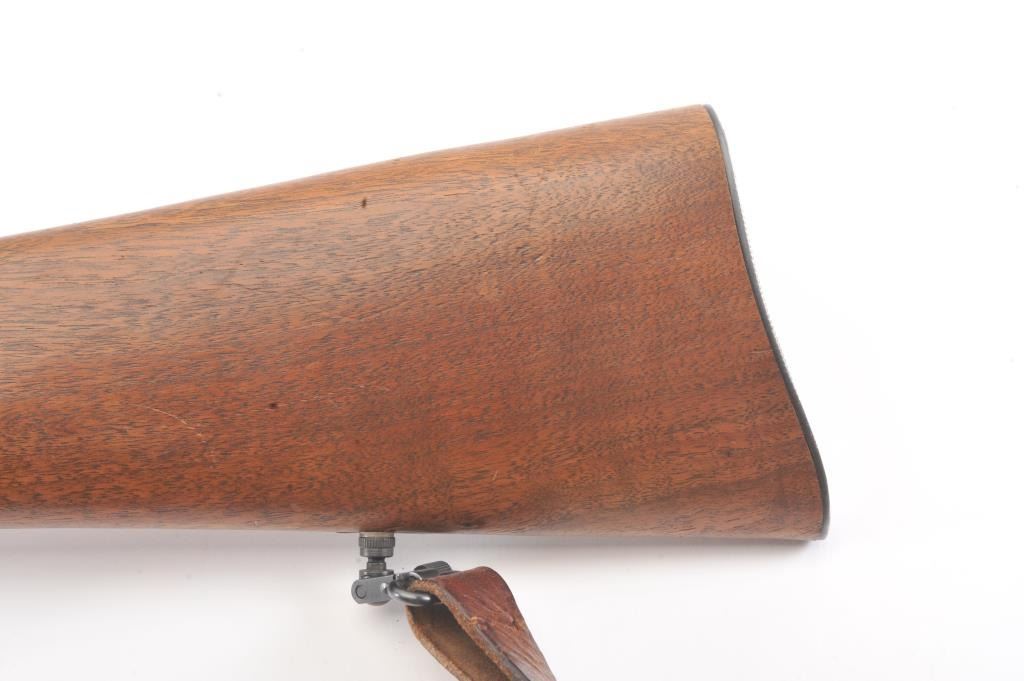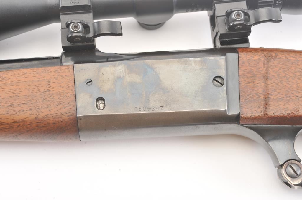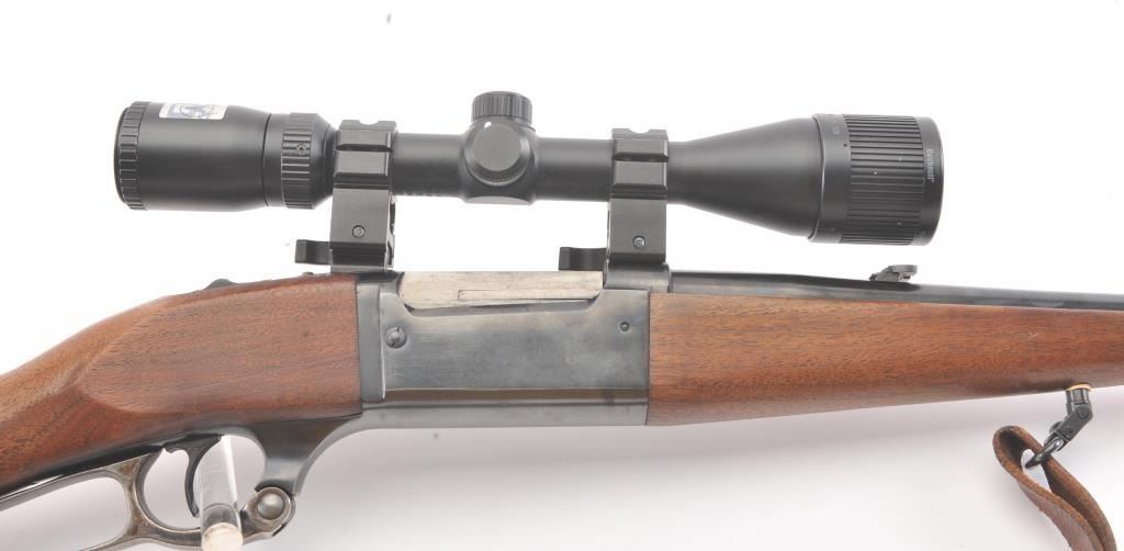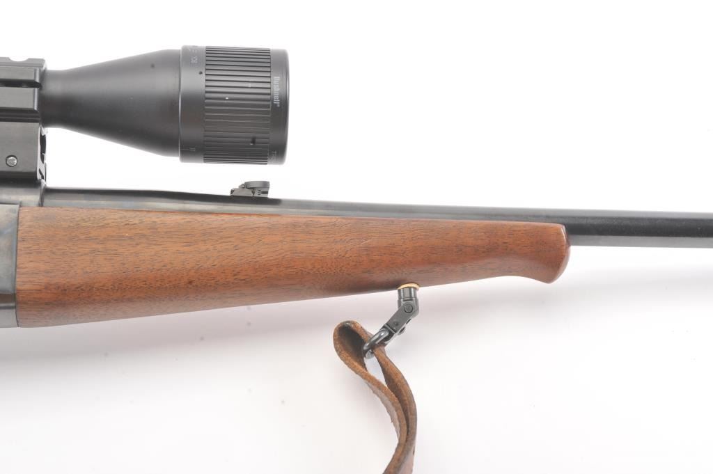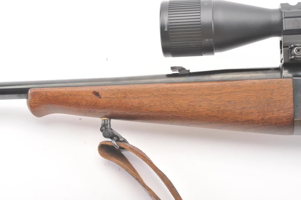 Savage Model 99A lever action rifle, .308 Winchester caliber, Serial #D505397. The rifle is in fine overall condition with a 22” barrel. The metal surfaces retain nearly all of the blue finish with the front sightremoved and a folding rear sight. The smooth wood stock is in very good condition with a Schnabel fore end showing little use. The bore is good, the action is crisp and the markings are sharp on this desirable Model99. The rifle is topped with a Bushnell Trophy XLT 4 x 12 Variable Power scope with an adjustable objective. The lot includes sling swivels and a period leather rifle sling. Est.: $300-$600. (Modern).