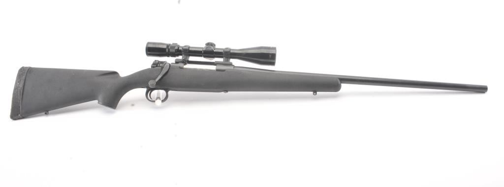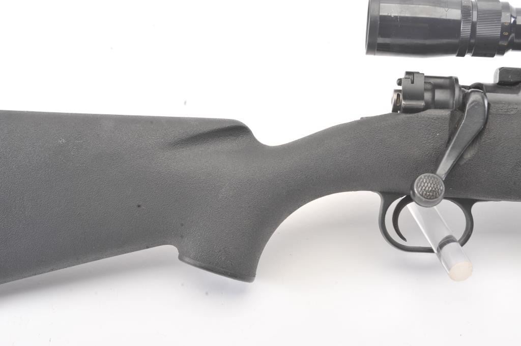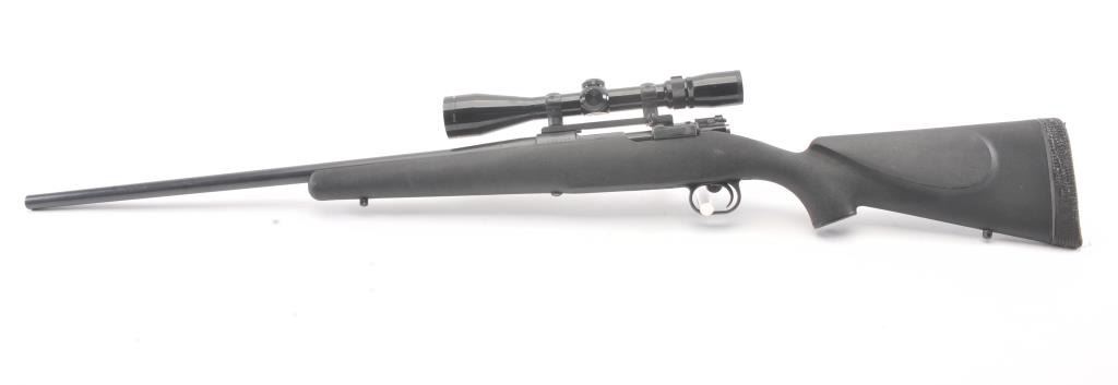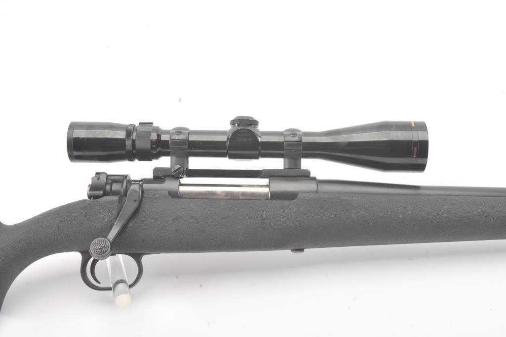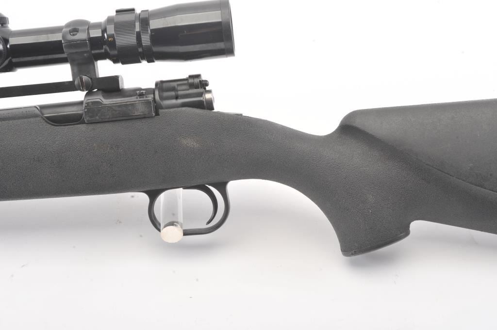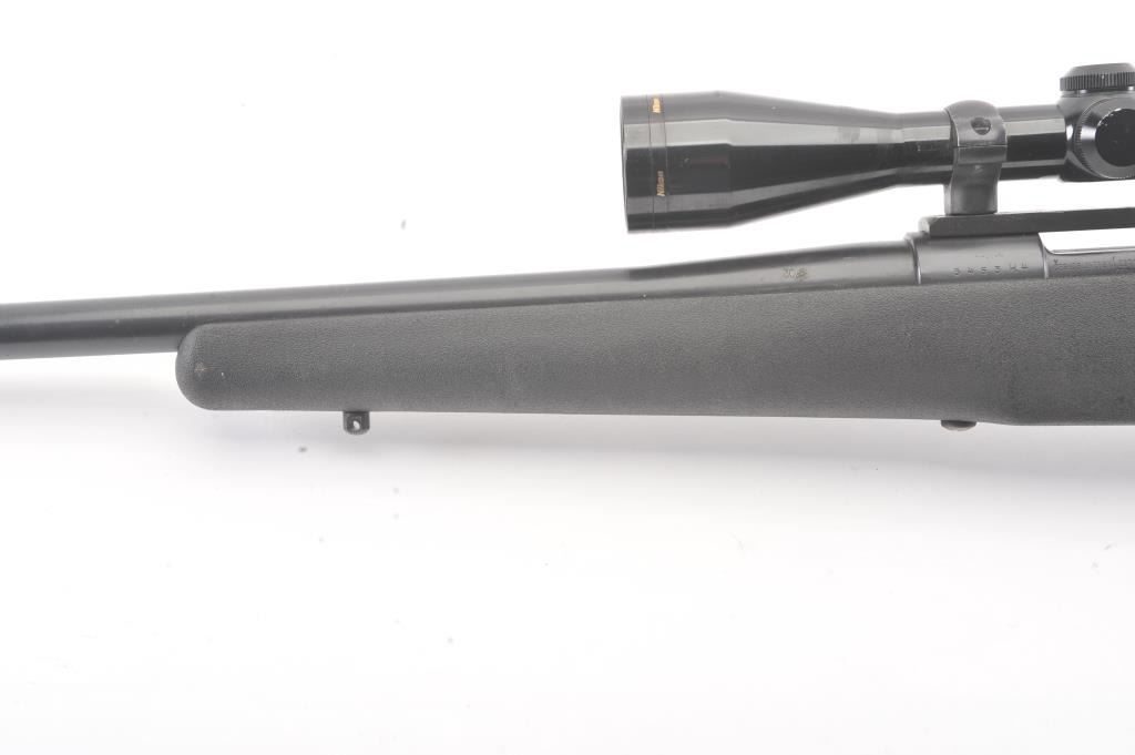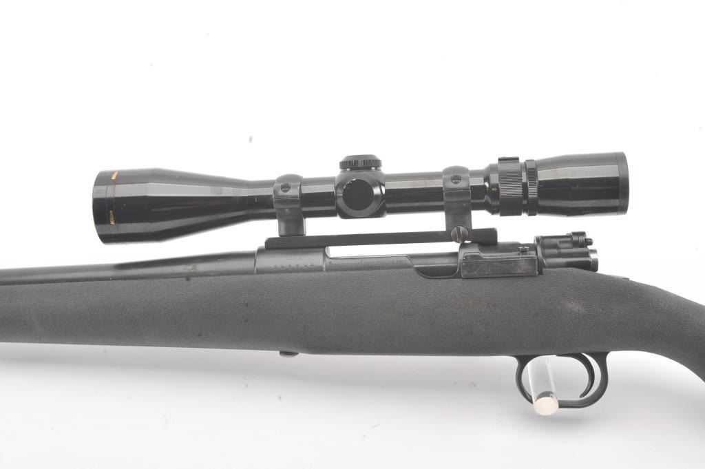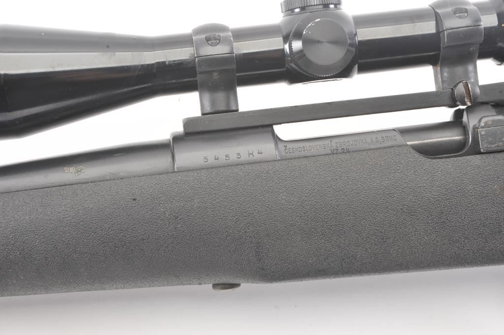 Custom BRNO VZ-24 Mauser sporting rifle, .30-06 caliber, Serial #5453R4. The rifle is in very good overall condition with a 24” barrel. The rifle retains the majority of the blue finish with scratches and mars fromcarry and use with a blind magazine. The synthetic stock is in good condition with a solid rubber butt pad that needs replacement. The bore is good, the action is crisp and the markings are legible. The rifle istopped a Redfield one-piece mount and rings with a Nikon 3 x 9 variable power rifle scope. Est.: $300-$600. (Modern).
