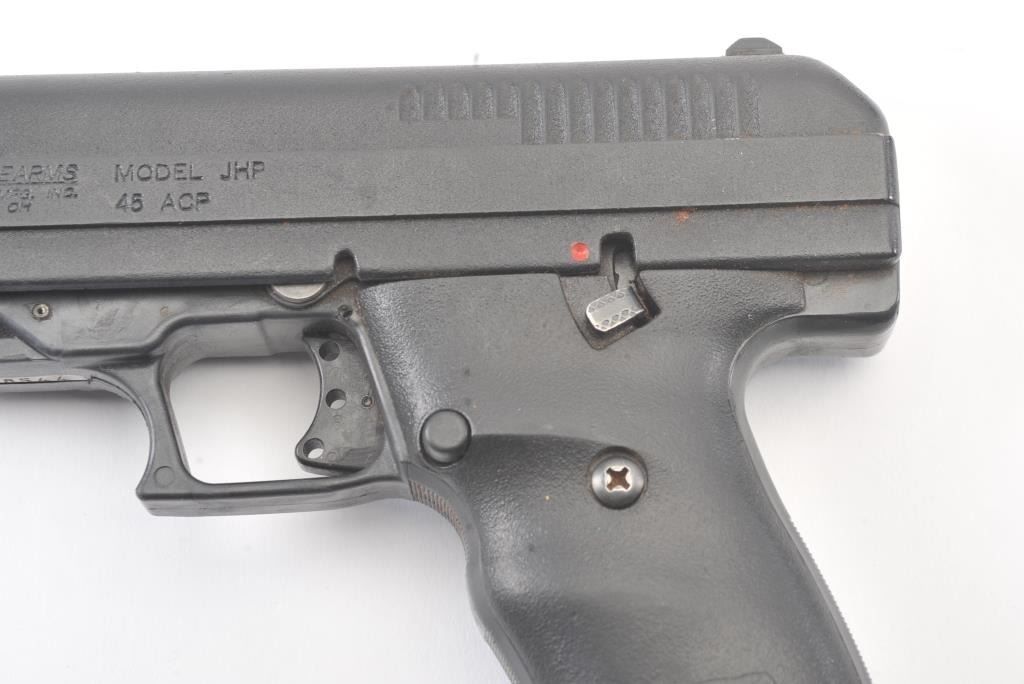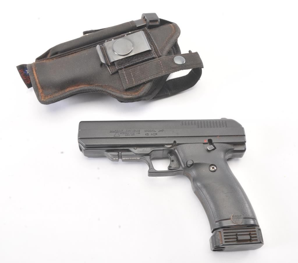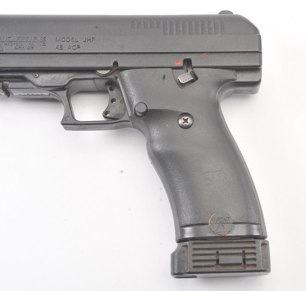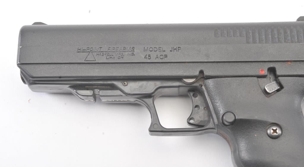 Hi-Point Model JHP semi-automatic pistol, .45 ACP caliber, Serial #X418544. The pistol is in very good overall condition with a 4 ½” barrel. The pistol retains the majority of the black finish with holster wear at themuzzle. The textured plastic grips are in good condition with mars and scratches from carry and use. The lot includes two correct magazines and a nylon belt holster. The action functions, the markings are legibleand the bore is good. Est.: $300-$600. (Modern/PPT).