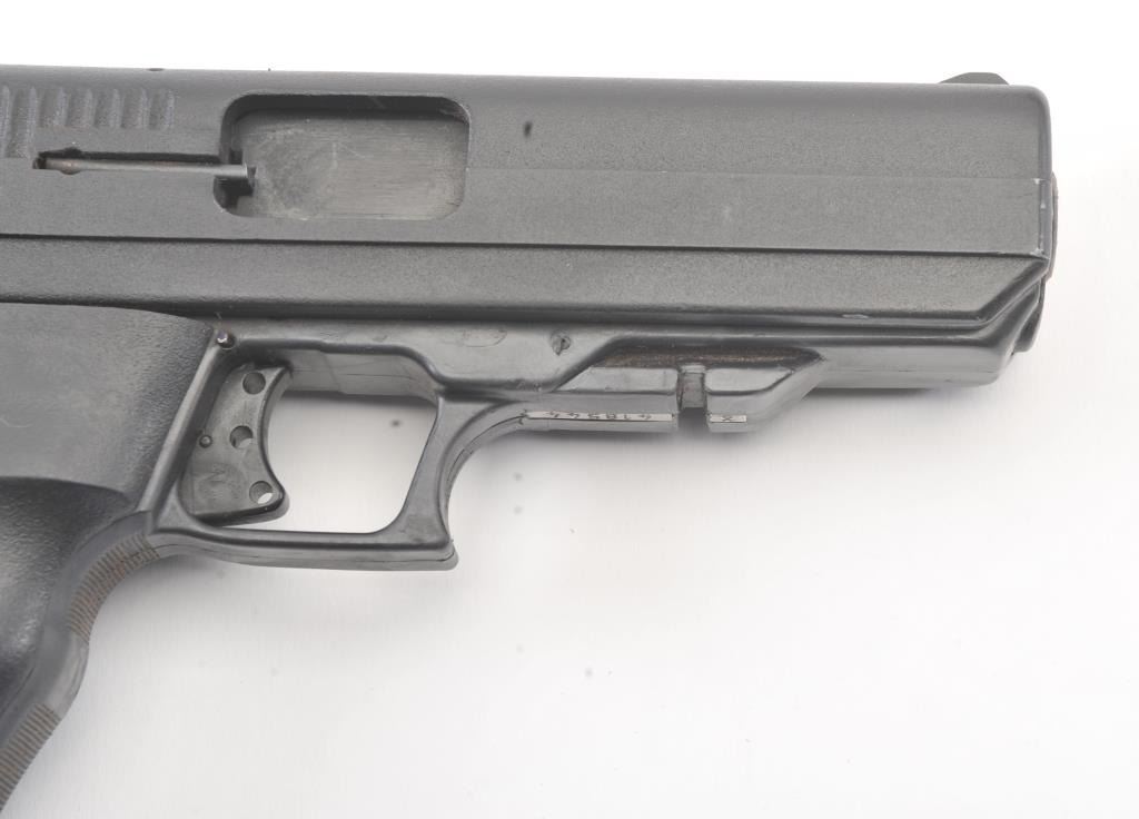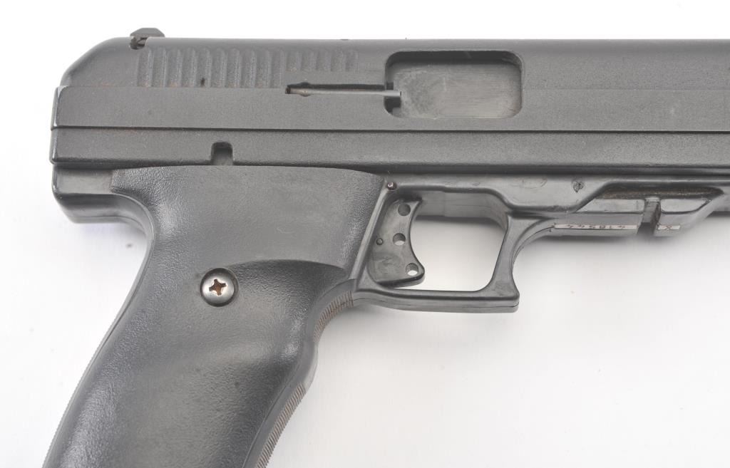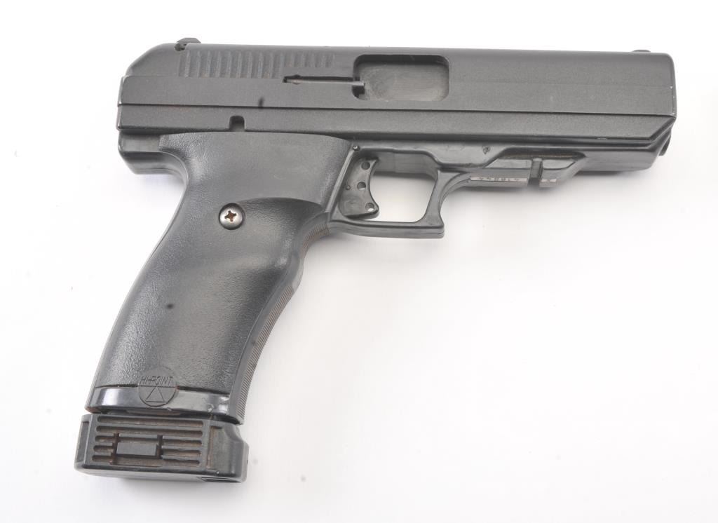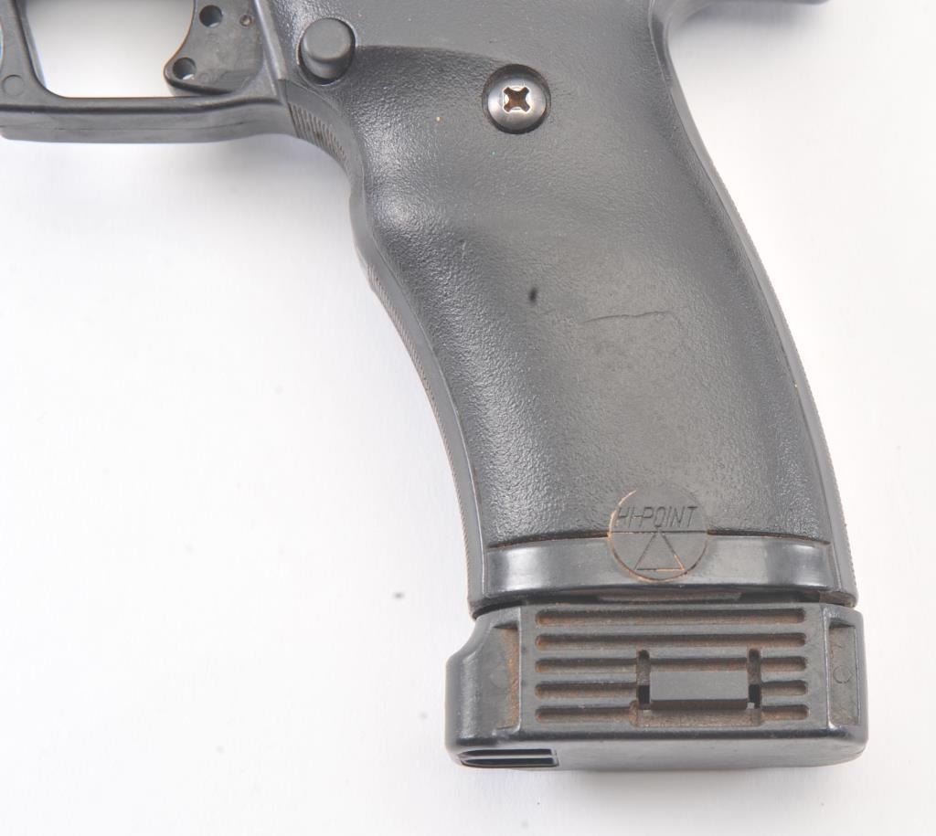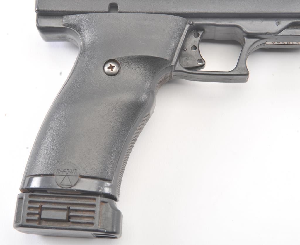 Hi-Point Model JHP semi-automatic pistol, .45 ACP caliber, Serial #X418544. The pistol is in very good overall condition with a 4 ½” barrel. The pistol retains the majority of the black finish with holster wear at themuzzle. The textured plastic grips are in good condition with mars and scratches from carry and use. The lot includes two correct magazines and a nylon belt holster. The action functions, the markings are legibleand the bore is good. Est.: $300-$600. (Modern/PPT).