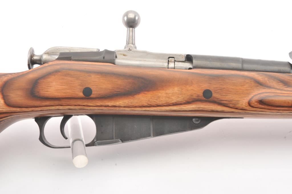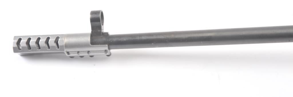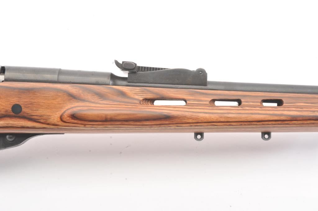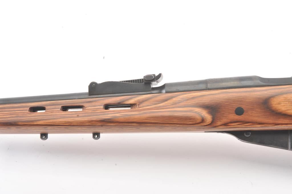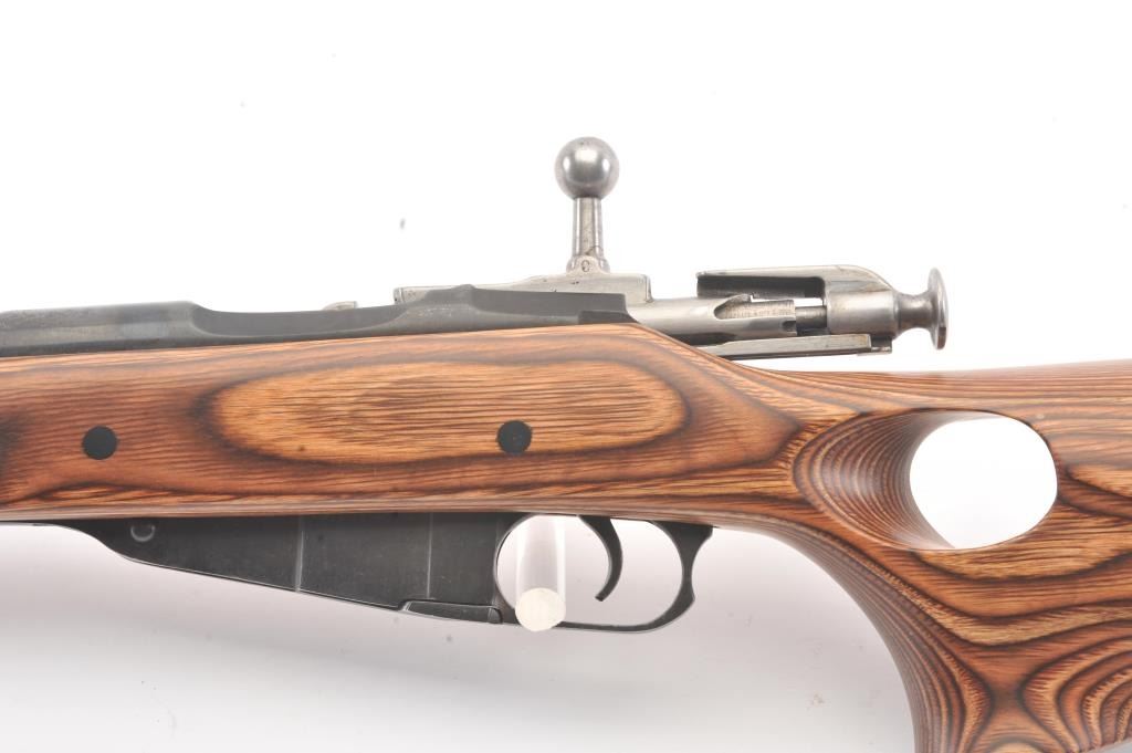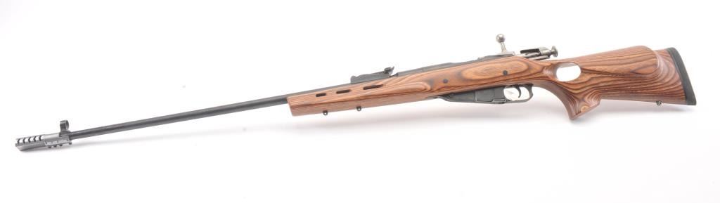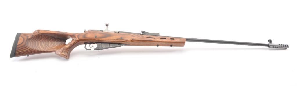 Custom Mosin-Nagant bolt action sporting rifle, 7.62 x 54R caliber, Serial #34705. The rifle is in fine overall condition with a 27” barrel with a hooded front and military tangent style rear sights. An after-marketbolt on muzzle break has been added. The metal surfaces retain a significant amount of military finish with Russian proofs and crest on the front ring dated 1937. All matching visible serial numbers with lightsurface rust on the receiver. The smooth laminate wood thumbhole stock is in very good condition with a solid rubber recoil pad providing a 13 ¾” LOP. The bore is fair, the action is crisp and the markings are sharp. Est.: $250-$500. (C+R).