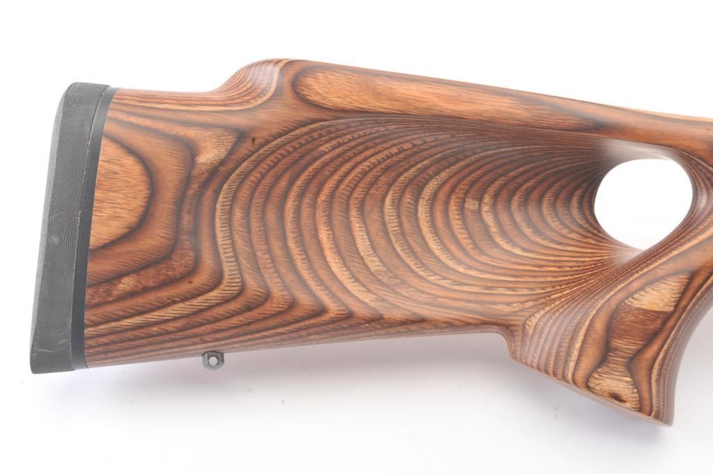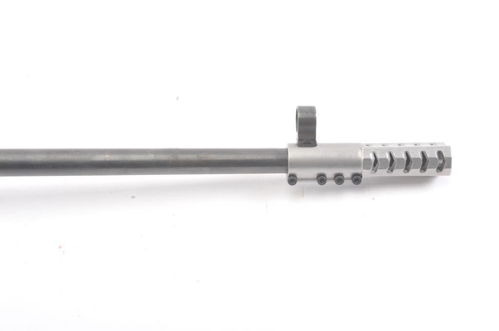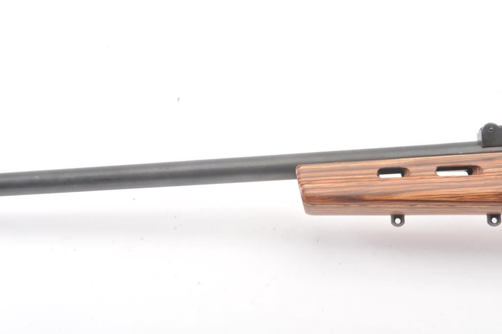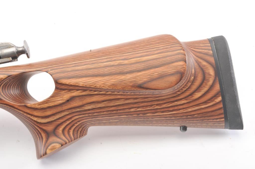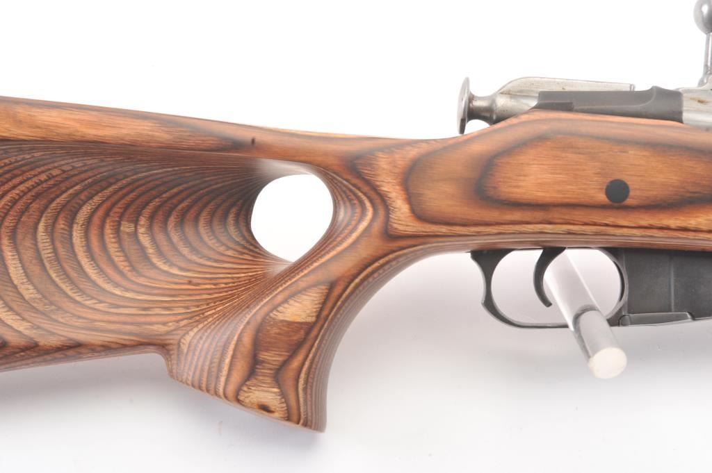 Custom Mosin-Nagant bolt action sporting rifle, 7.62 x 54R caliber, Serial #34705. The rifle is in fine overall condition with a 27” barrel with a hooded front and military tangent style rear sights. An after-marketbolt on muzzle break has been added. The metal surfaces retain a significant amount of military finish with Russian proofs and crest on the front ring dated 1937. All matching visible serial numbers with lightsurface rust on the receiver. The smooth laminate wood thumbhole stock is in very good condition with a solid rubber recoil pad providing a 13 ¾” LOP. The bore is fair, the action is crisp and the markings are sharp. Est.: $250-$500. (C+R).