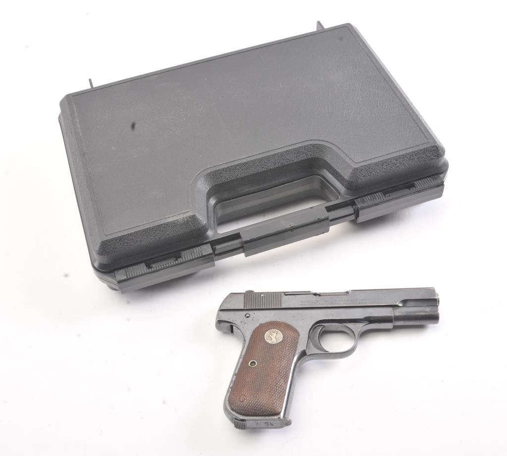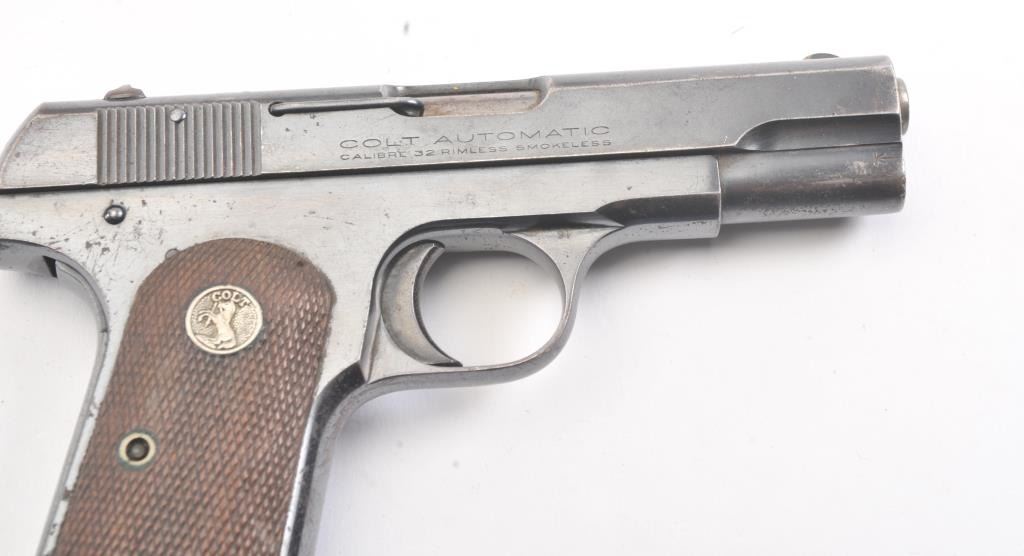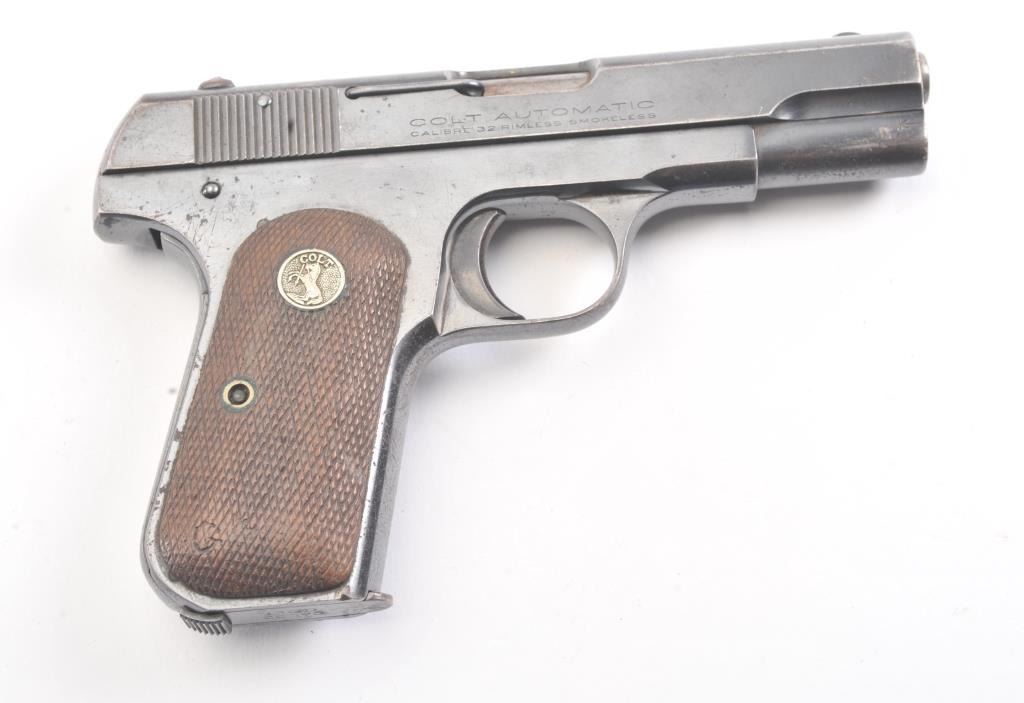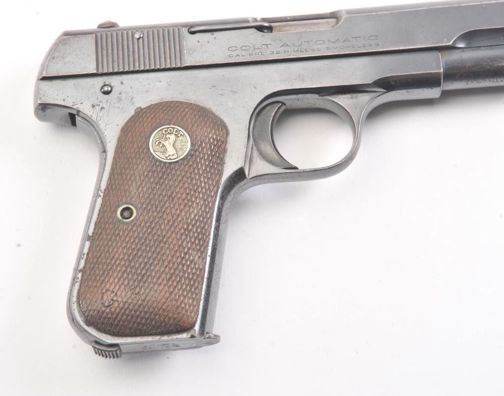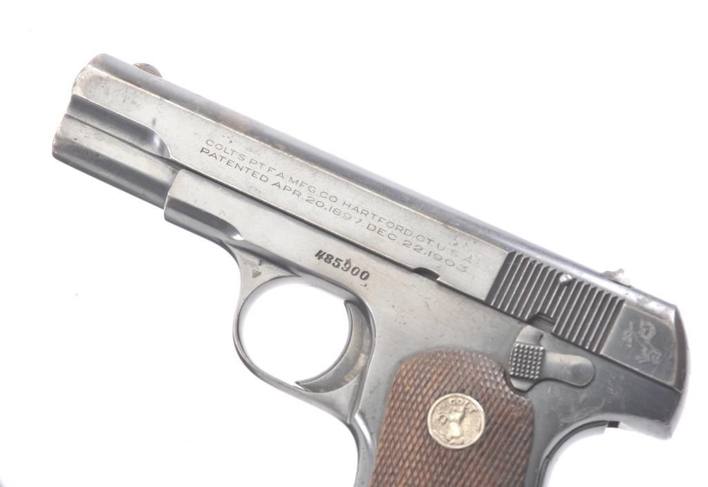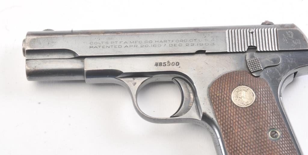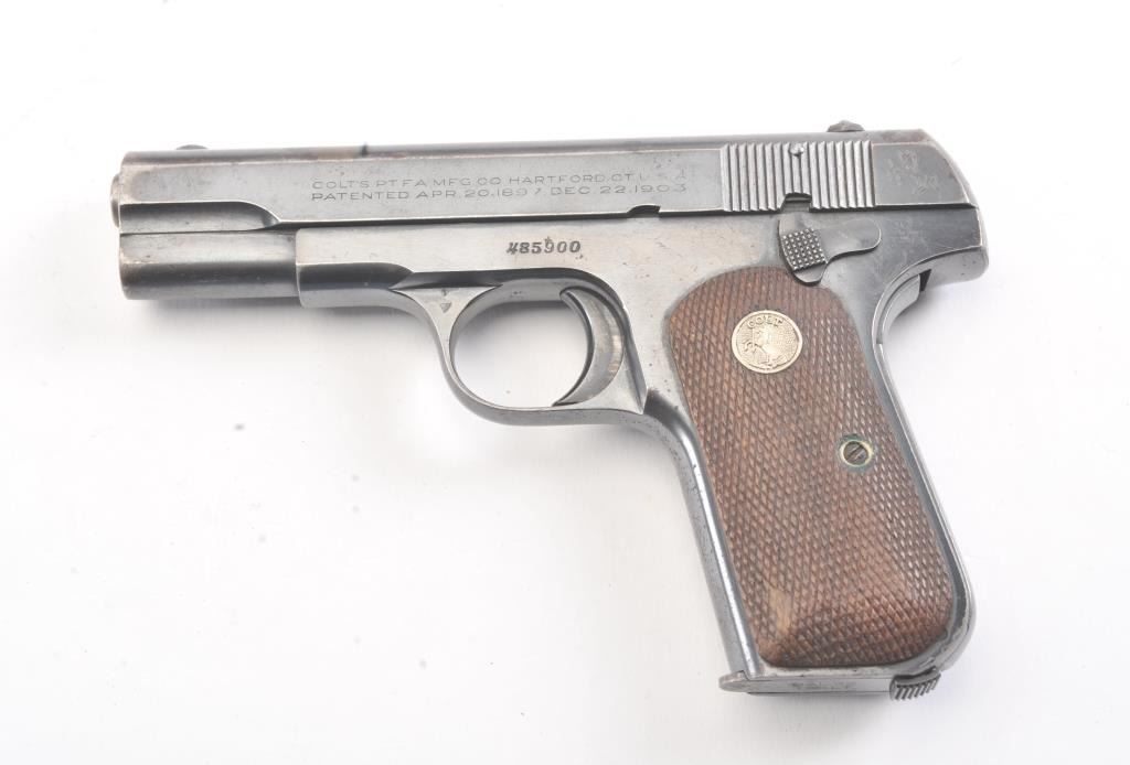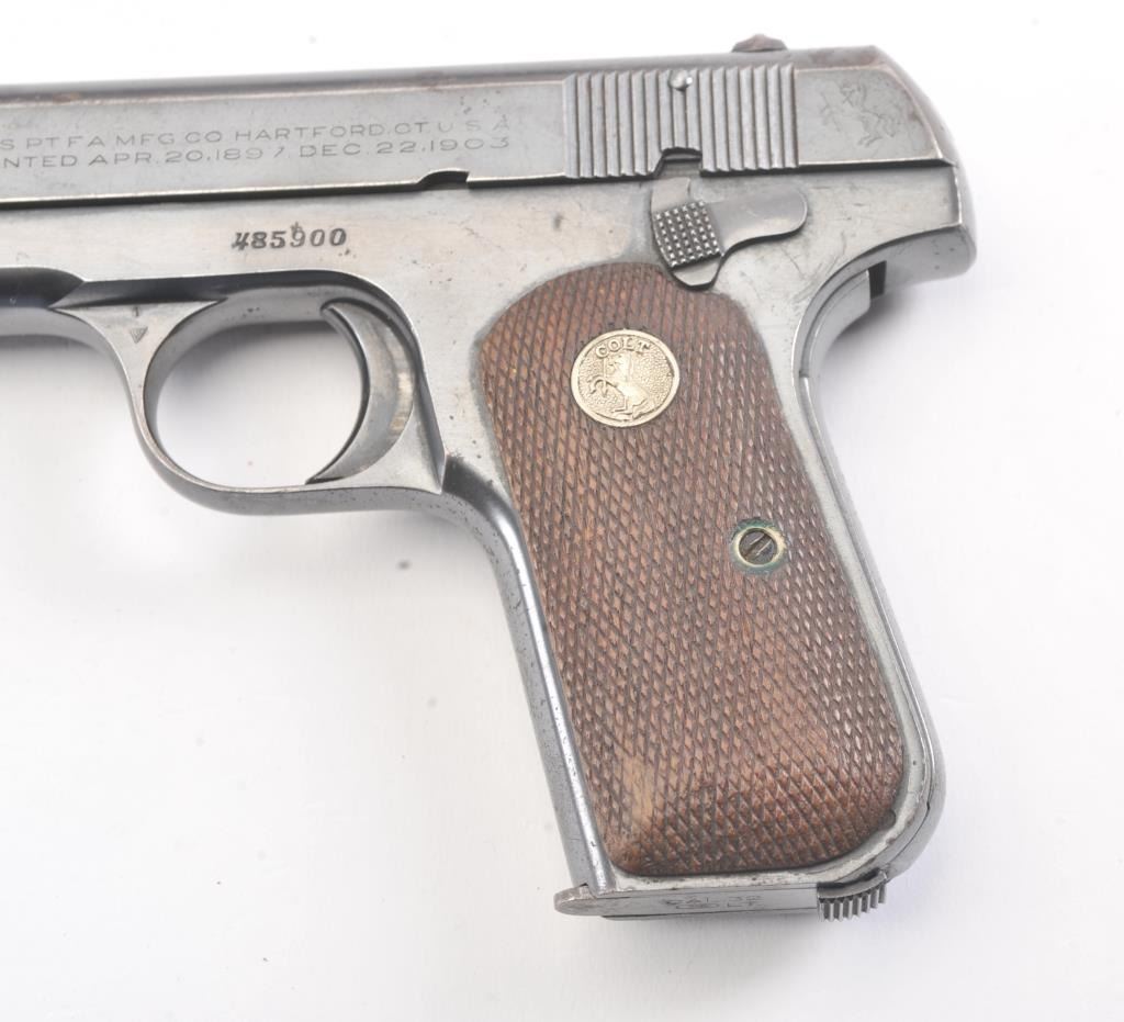 Colt Model 1903 semi-automatic pistol, .32 caliber, Serial #485900. The pistol is in very good overall condition with a 3 ¾” barrel. The pistol retains a significant amount of thinning blue finish with losses at the muzzle, top of the slide and high point edge wear. The Colt emblem at the rear of the slide is crisp. The checkered wood medallion grips are in good condition with some flattening of the checkering and smallmars consistent with carry and use. The lot includes one correct Colt marked magazine. The bore is fair and the action is crisp. Est.: $300-$600. (C+R/PPT).