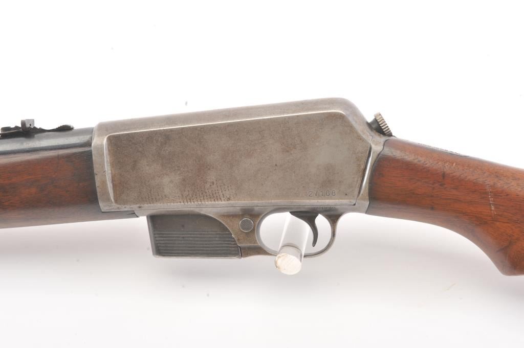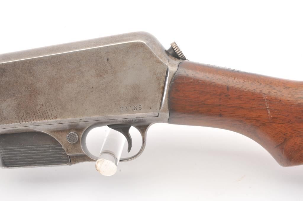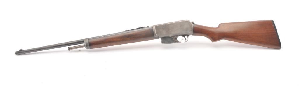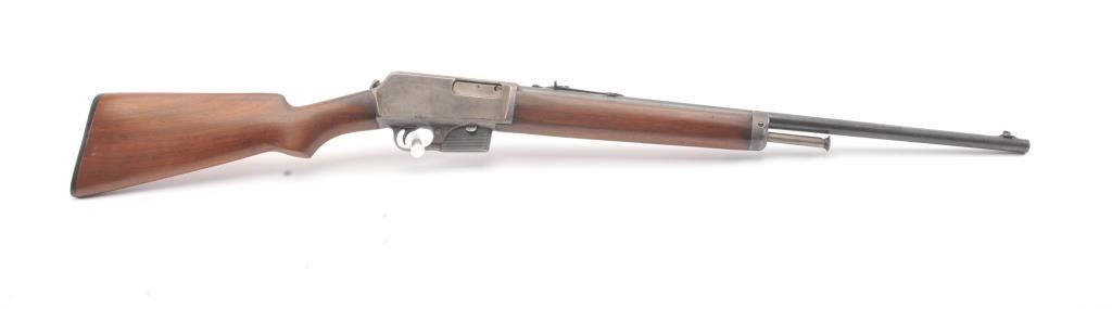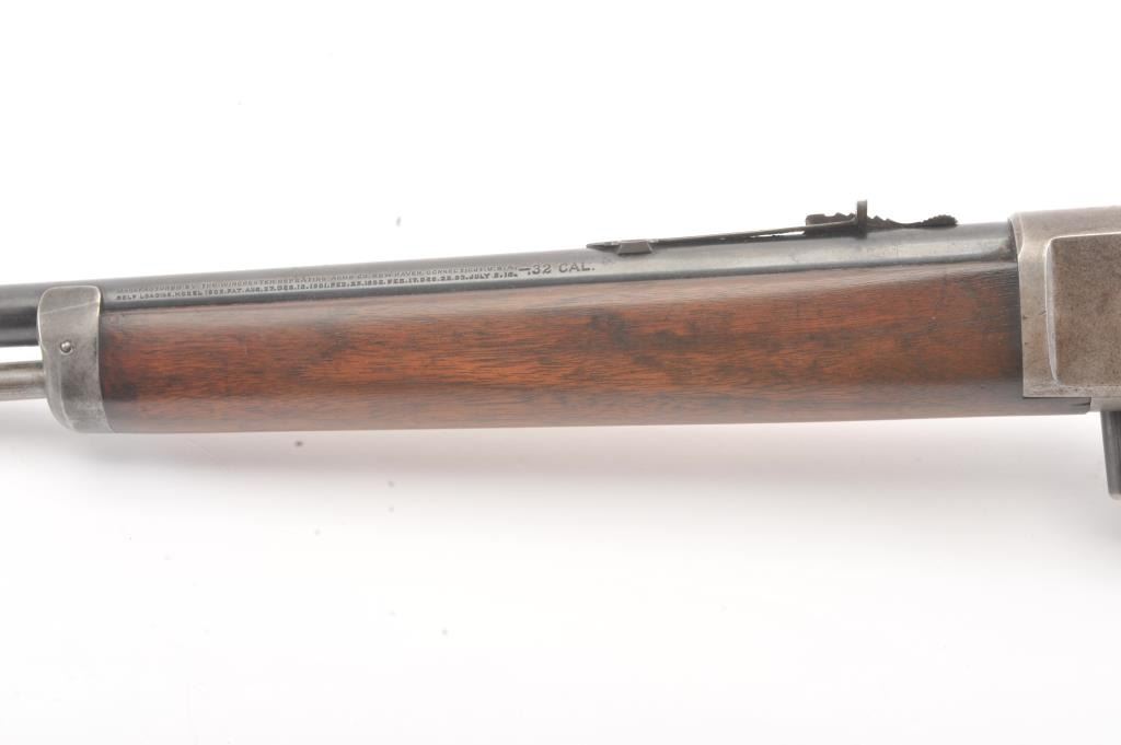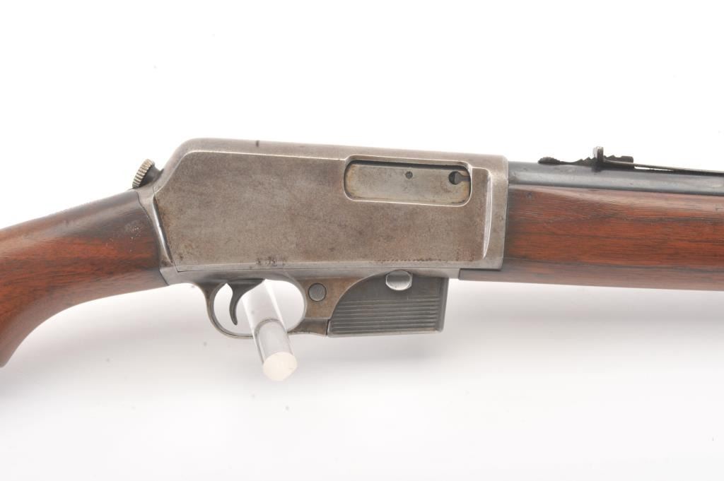 Winchester Model 1905 S.L., semi-automatic rifle, .32 caliber, Serial #27168. The rifle is in very good overall condition with a 22” barrel. The barrel retains a significant amount of flaking blue finish with theremainder drifting to grey patina. The receiver is an overall grey patina. The smooth wood stock is in very good condition with a checkered hard rubber butt plate. The bore is fair, the action is crisp and themarkings are sharp. Est.: $250-$500. (C+R).