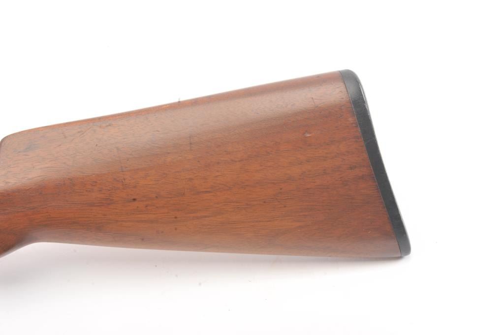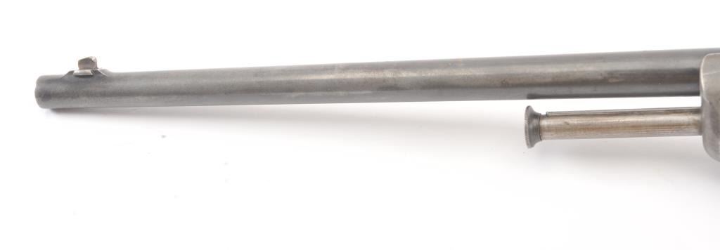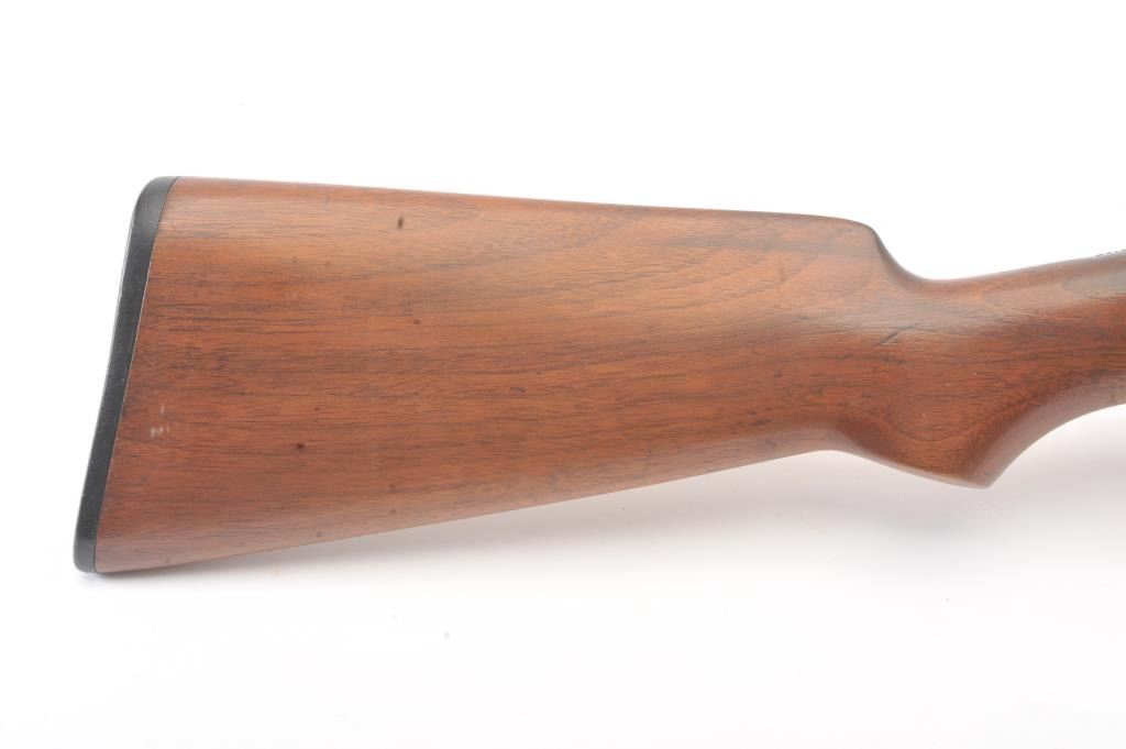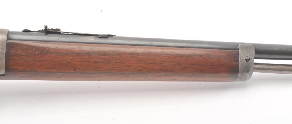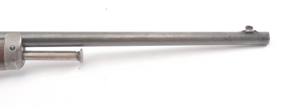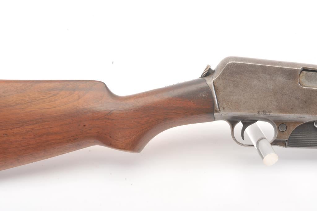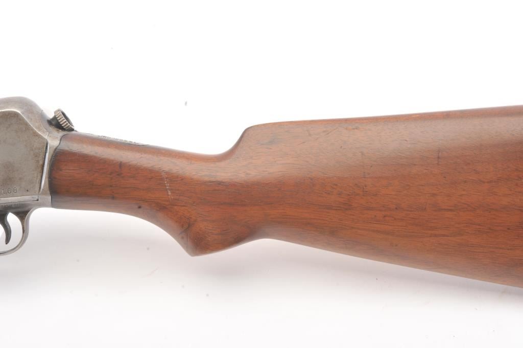 Winchester Model 1905 S.L., semi-automatic rifle, .32 caliber, Serial #27168. The rifle is in very good overall condition with a 22” barrel. The barrel retains a significant amount of flaking blue finish with theremainder drifting to grey patina. The receiver is an overall grey patina. The smooth wood stock is in very good condition with a checkered hard rubber butt plate. The bore is fair, the action is crisp and themarkings are sharp. Est.: $250-$500. (C+R).