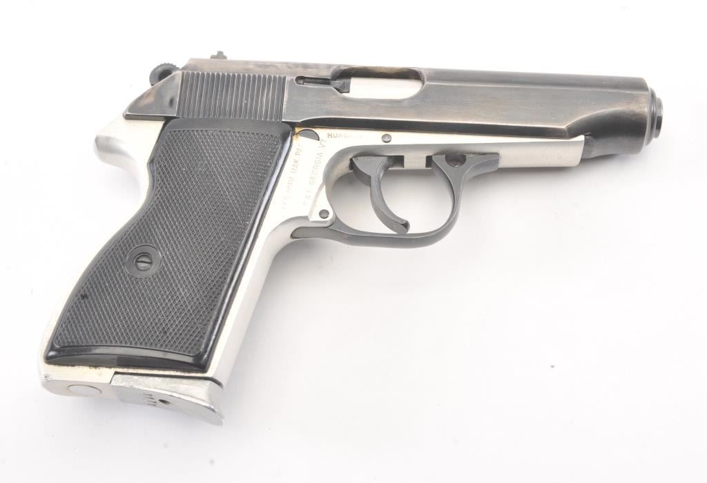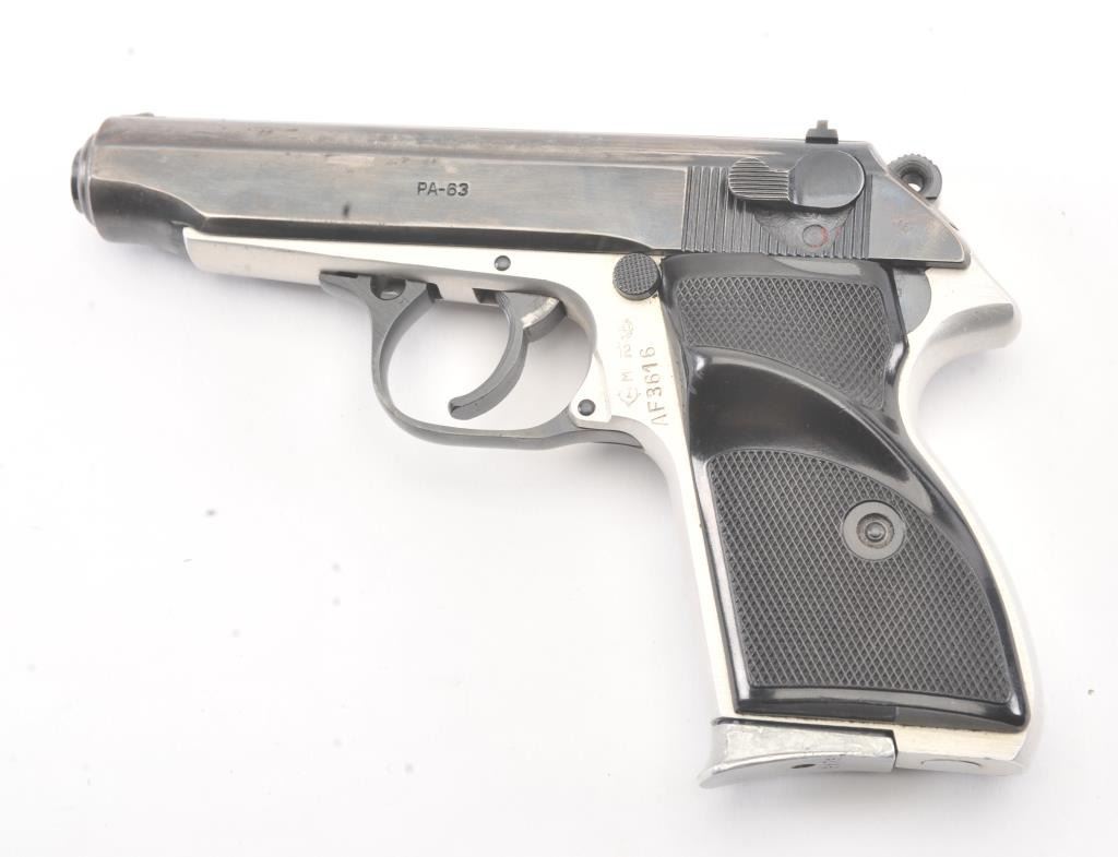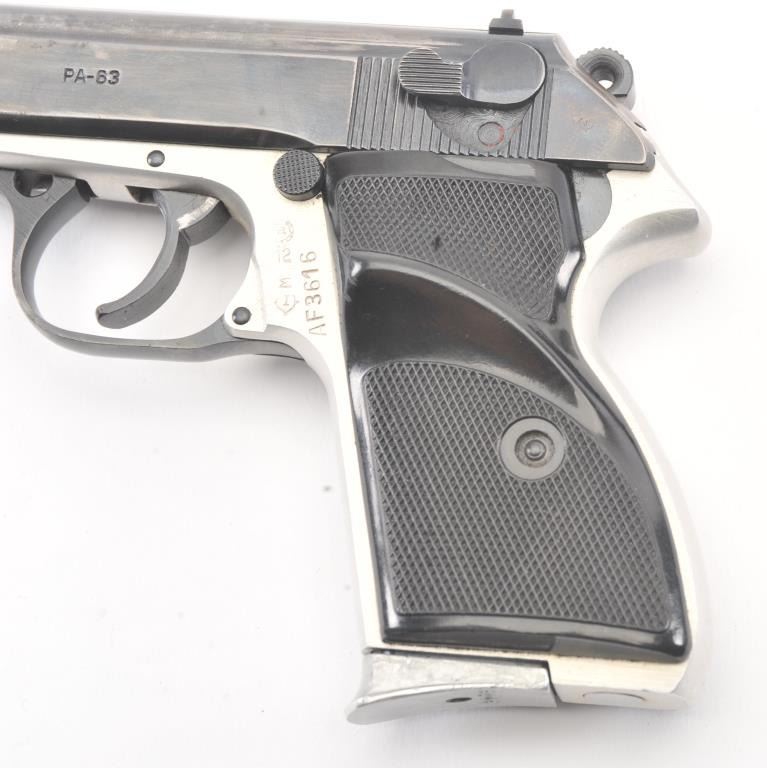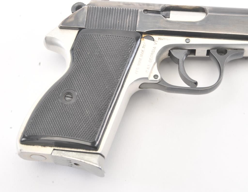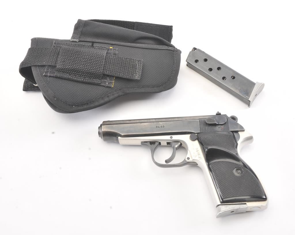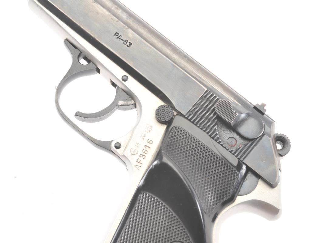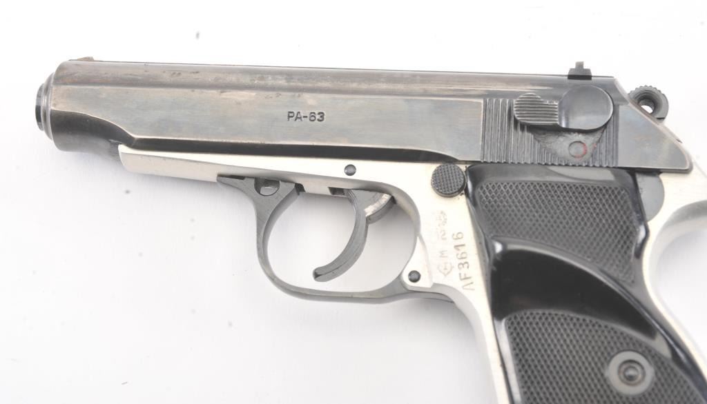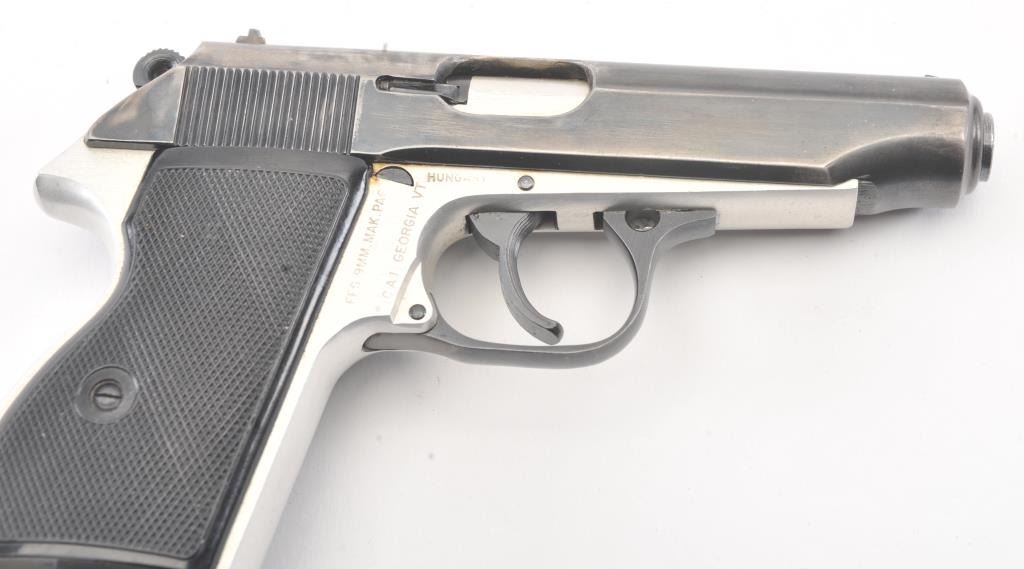Hungarian PA-63 semi-automatic pistol, 9 x 18 Makarov caliber, Serial #AF3616. The pistol is in very good overall condition with a 3 ¾” barrel. The slide retains the majority of the thinning blue finish with holster wearat the muzzle. The matte stainless steel frame shows considerable finish with import marks and Hungary on the left side. The checkered plastic grips are in very good condition. The action is crisp and the boreis bright. The lot includes two correct magazines and a nylon belt holster. Est.: $150-$300. (Modern/PPT).