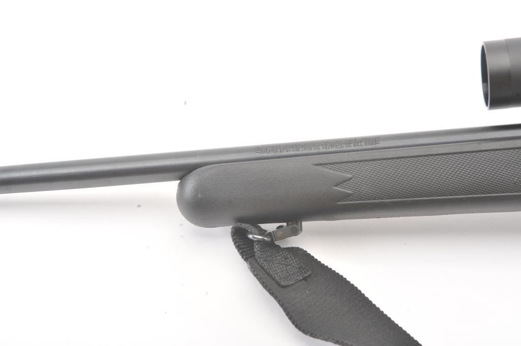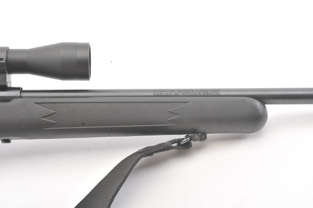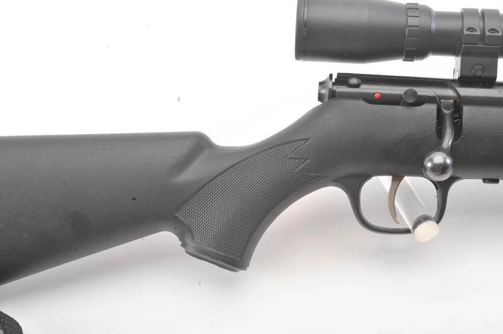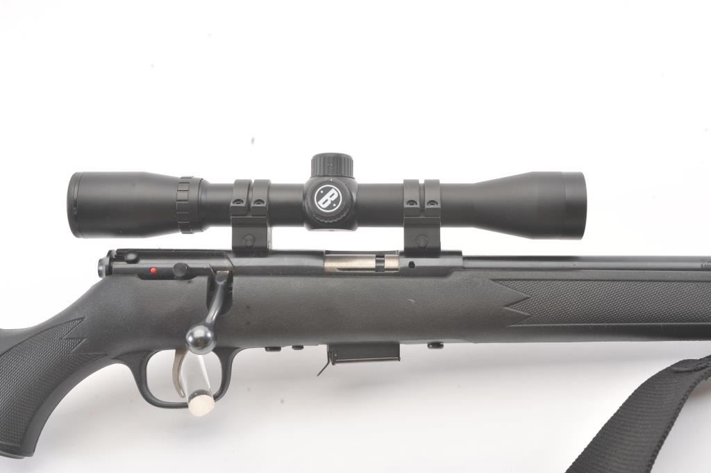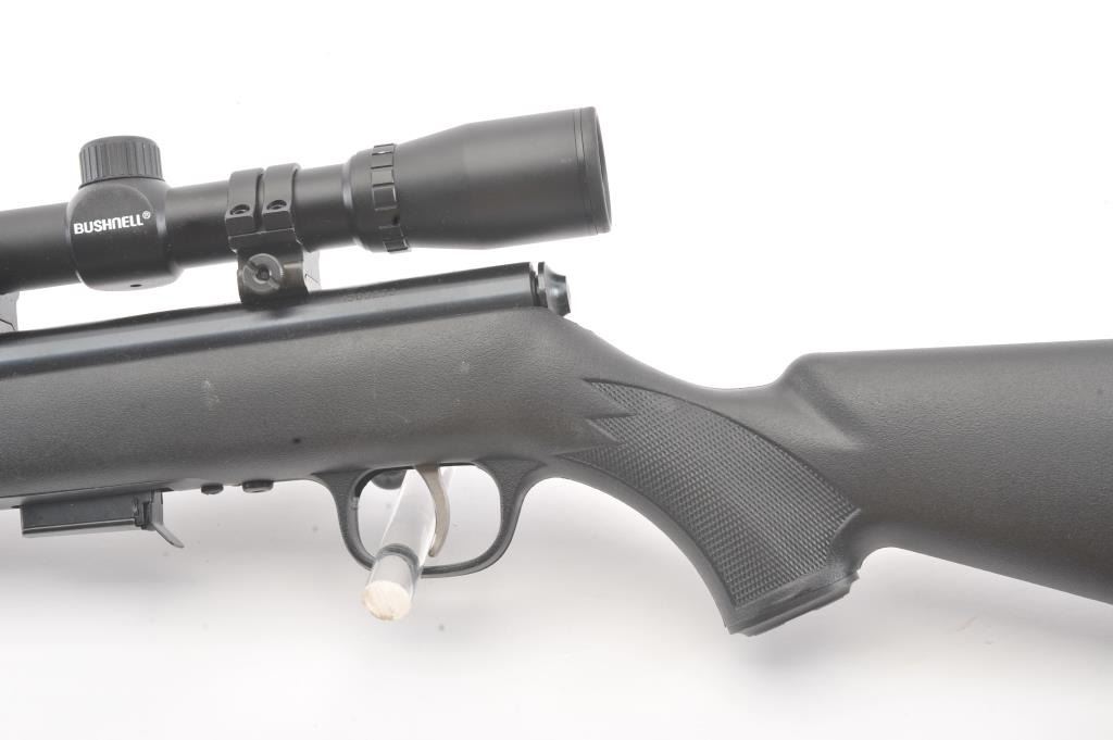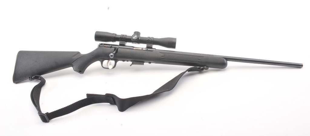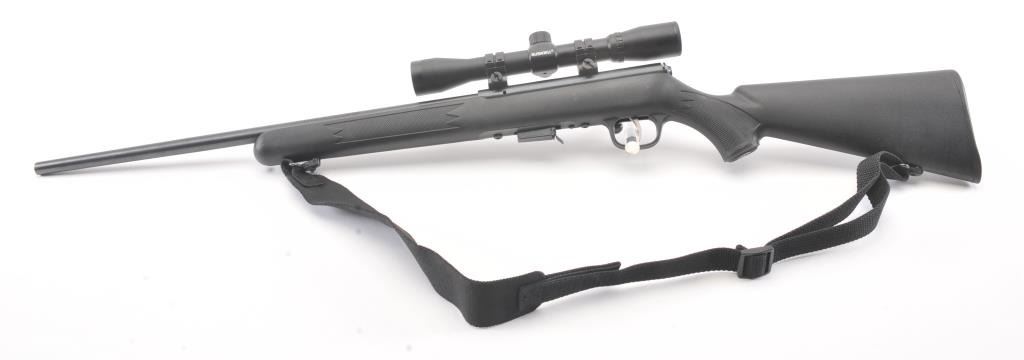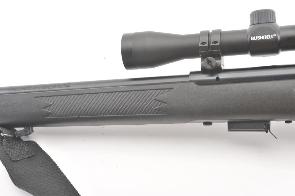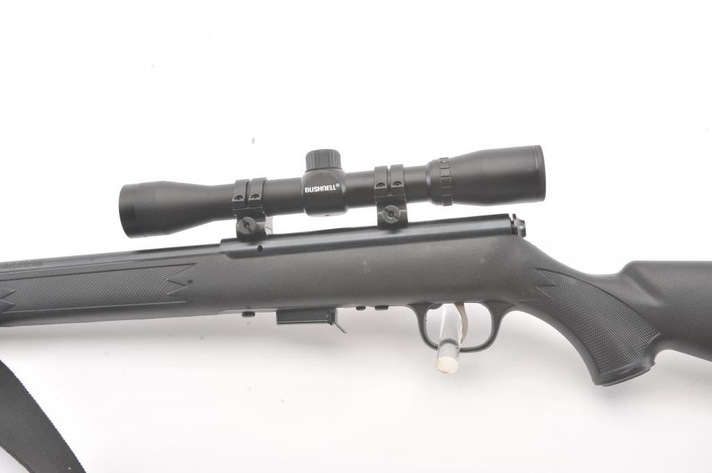 Savage Model 93R17 bolt action rifle, .17 HMR caliber, Serial #1563253. The rifle is as new with a 21” barrel. The metal surfaces retain nearly all the matte blue finish with light handling marks. The checkeredsynthetic stock is in excellent condition with a nylon sling and sling swivels. The rifle is topped with a Bushnell fixed 4X scope. The bore is good, the action is crisp and the markings are sharp on this lightlyused sporter. Est.: $200-$400. (Modern).