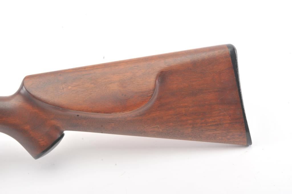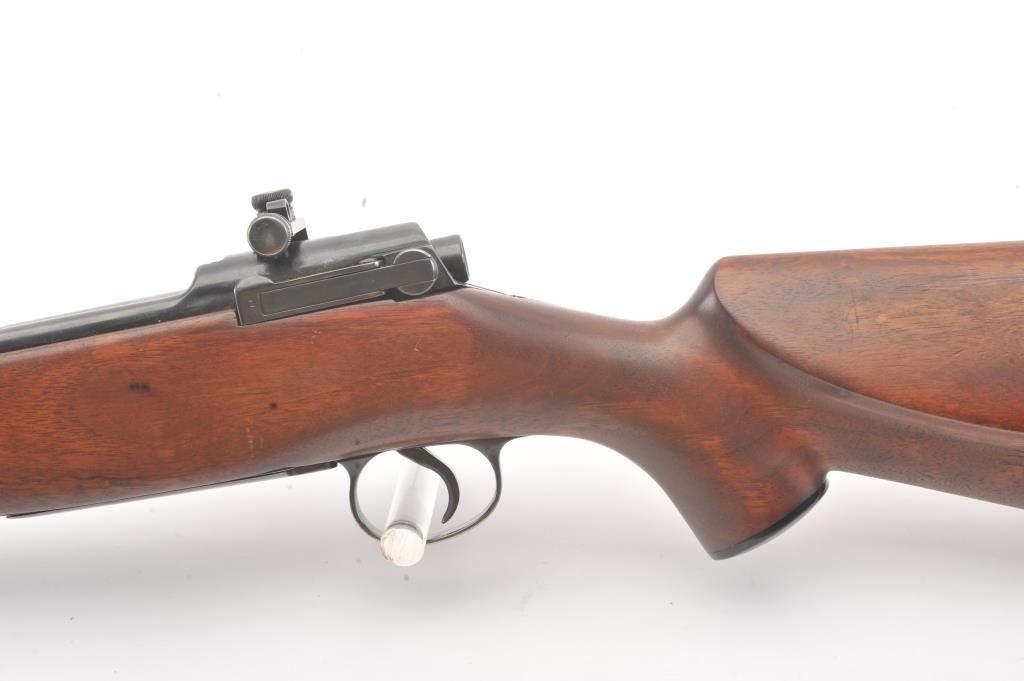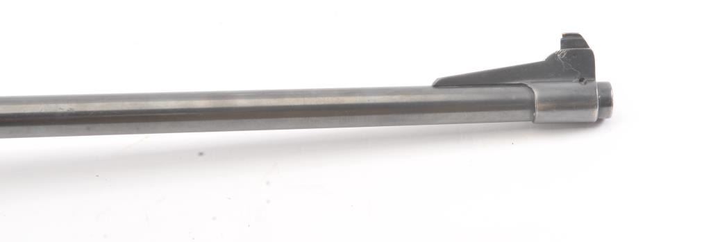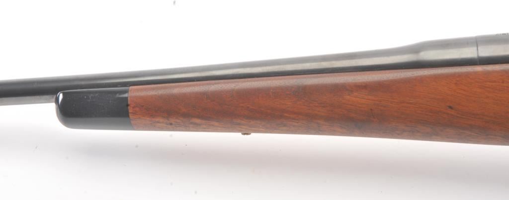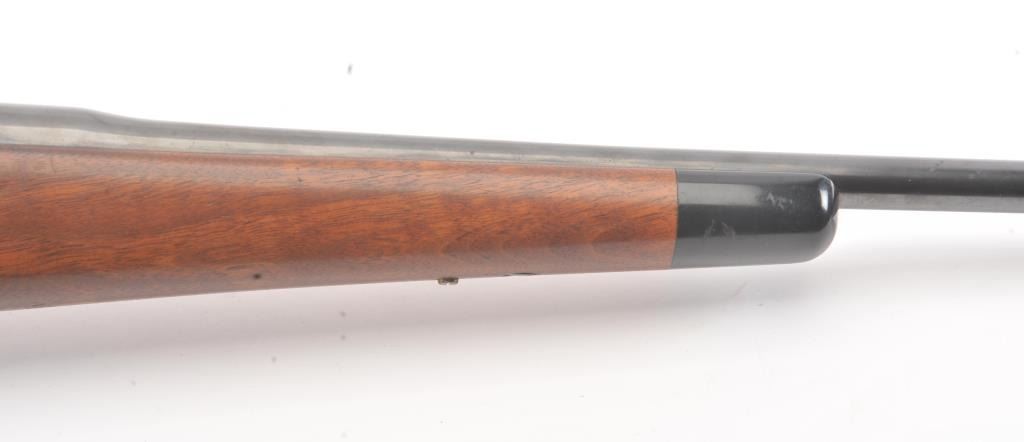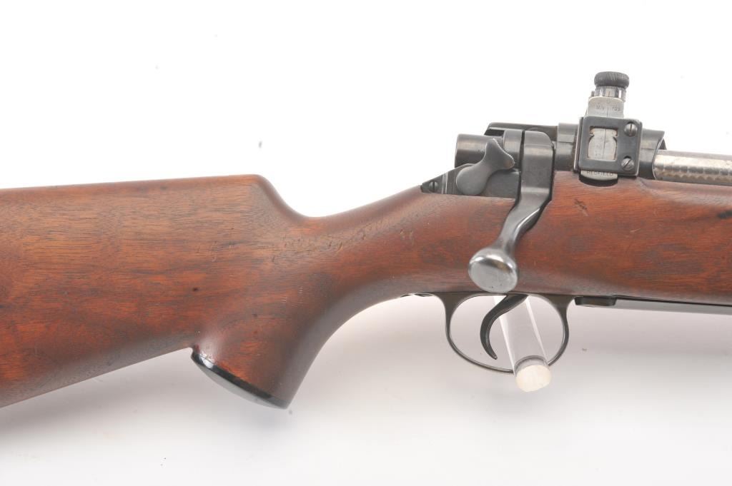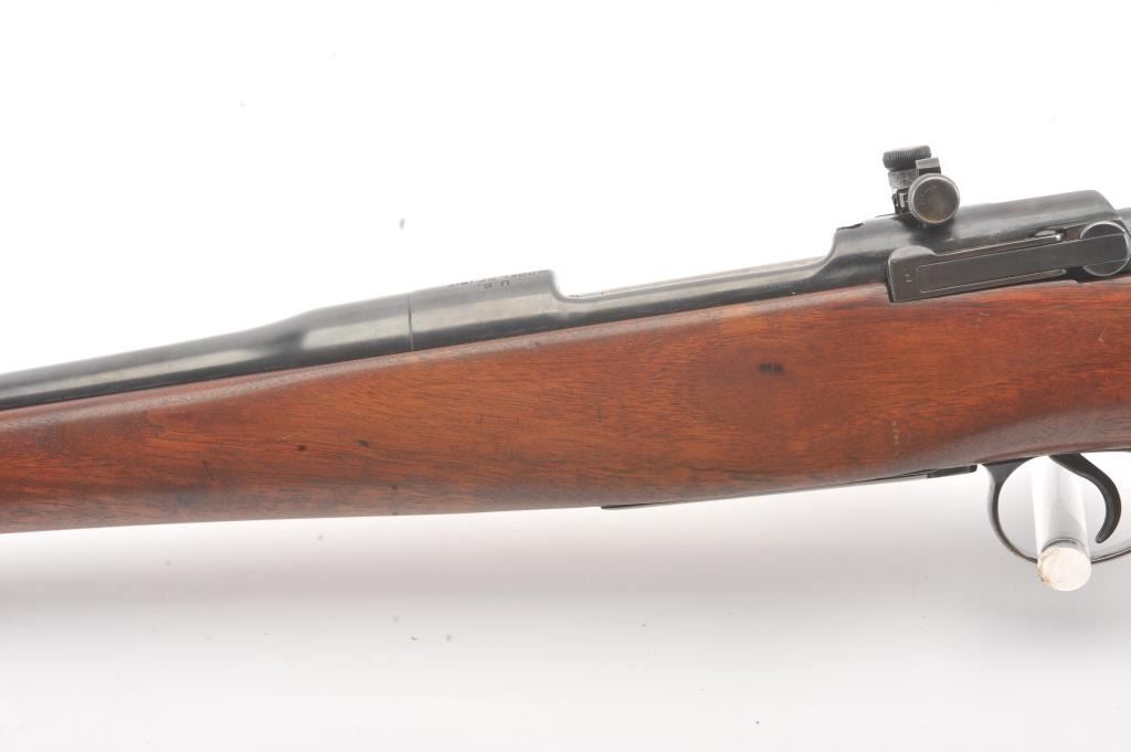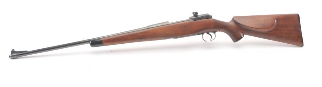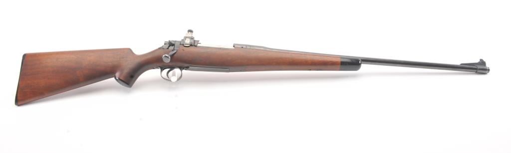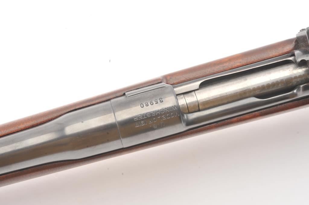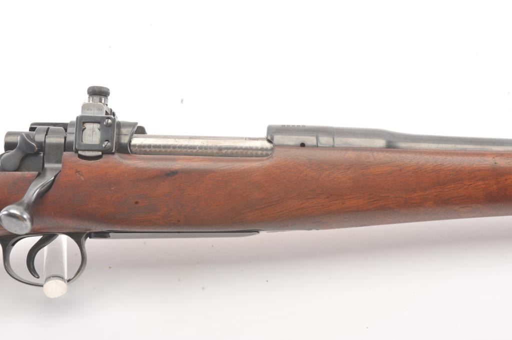 Winchester Model 1917 Enfield bolt action sporting rifle, .30-06 caliber, Serial #35980. The rifle is in very good overall condition with a 24” barrel with original banded ramp blade front sight. The rifleretains the majority of the blue finish with a jeweled bolt and Redfield receiver sight added. The custom smooth wood stock is in good condition with an ebony fore end cap, pistol grip and checkered plastic butt plate. The bore is good, the action is crisp and the markings are legible. Est.: $250-$500. (C+R).